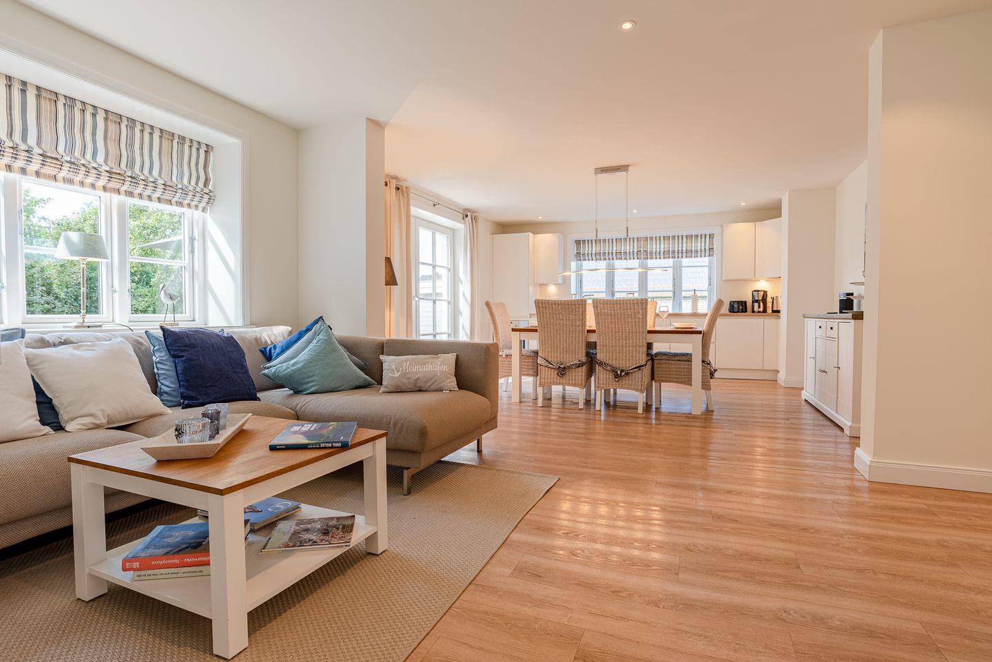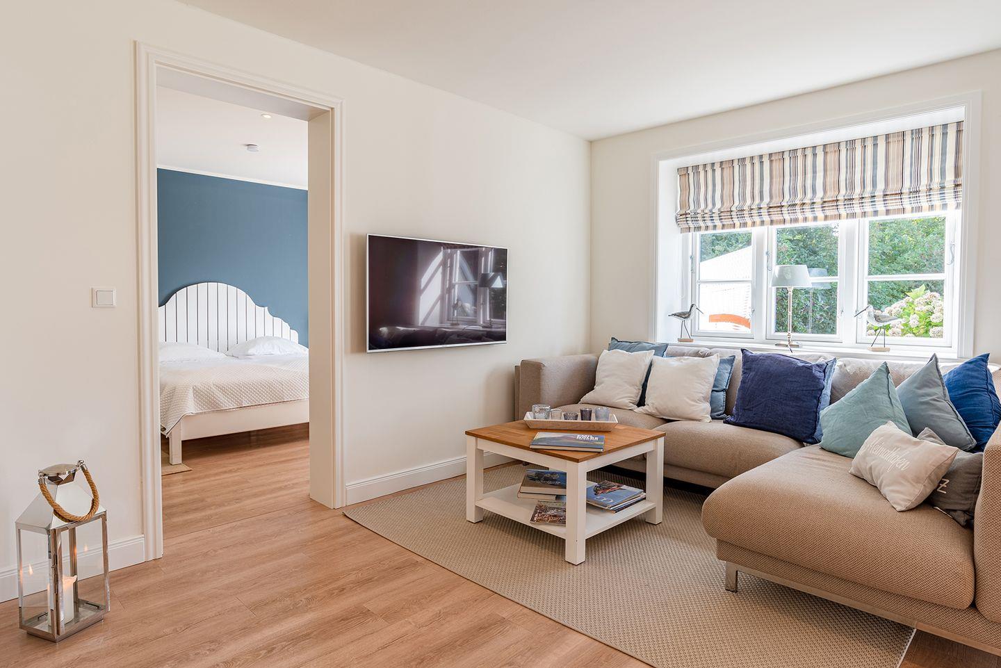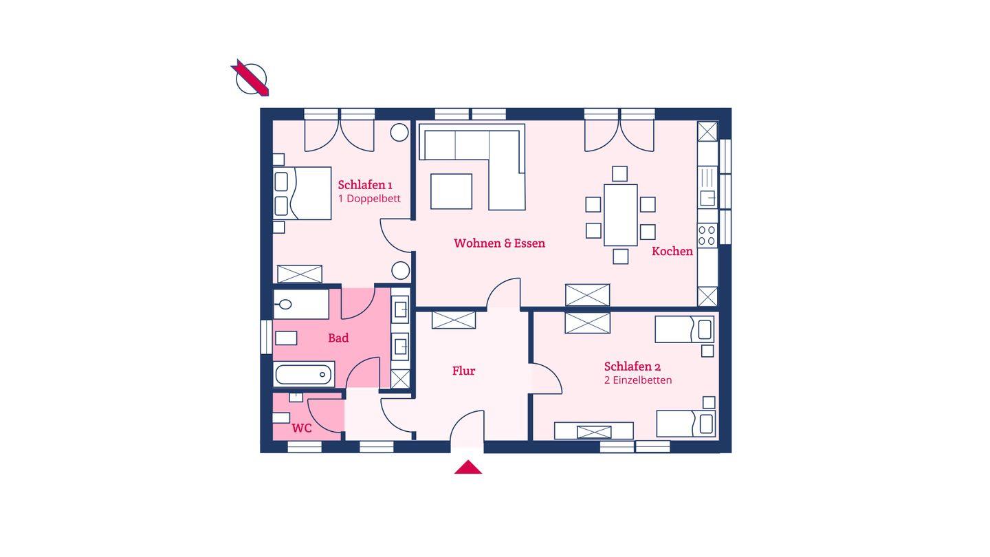 Der großzügige Wohnbereich verfügt über eine schöne Sofalandschaft, einen Esstisch sowie über eine offene Küche. Von hier aus gelangen Sie auf die Terrasse mit Garten sowie in das Schlafzimmer mit Doppelbett, welches ebenfalls einen direkten Terrassenzugang bietet. Das zweite Schlafzimmer ist mit zwei Einzelbetten ausgestattet. Von einem kleinen, zweiten Flur aus gelangen Sie in das Gäste-WC sowie in das Bad mit Wanne und Dusche, von welchem Sie ebenfalls das Elternschlafzimmer erreichen.