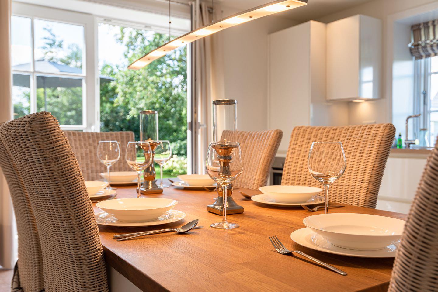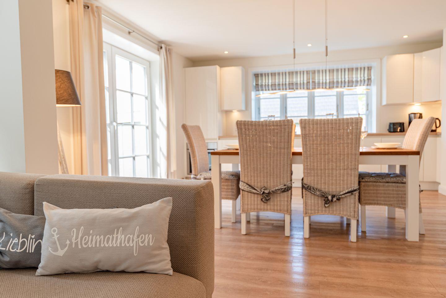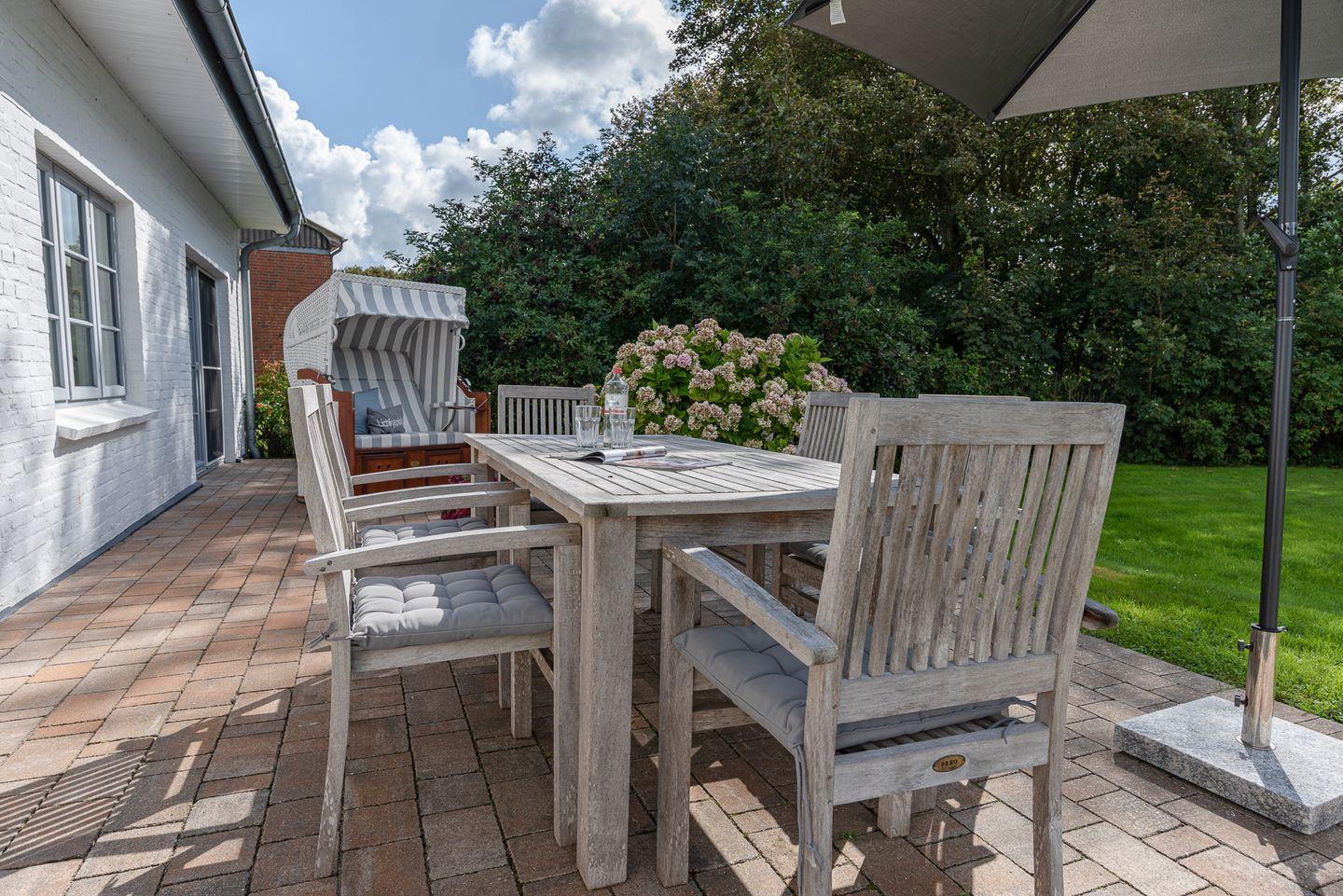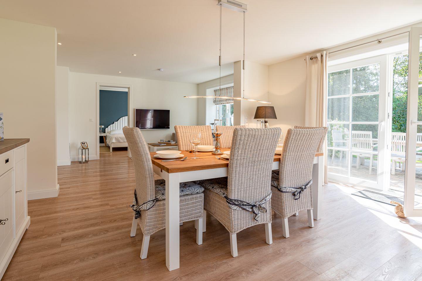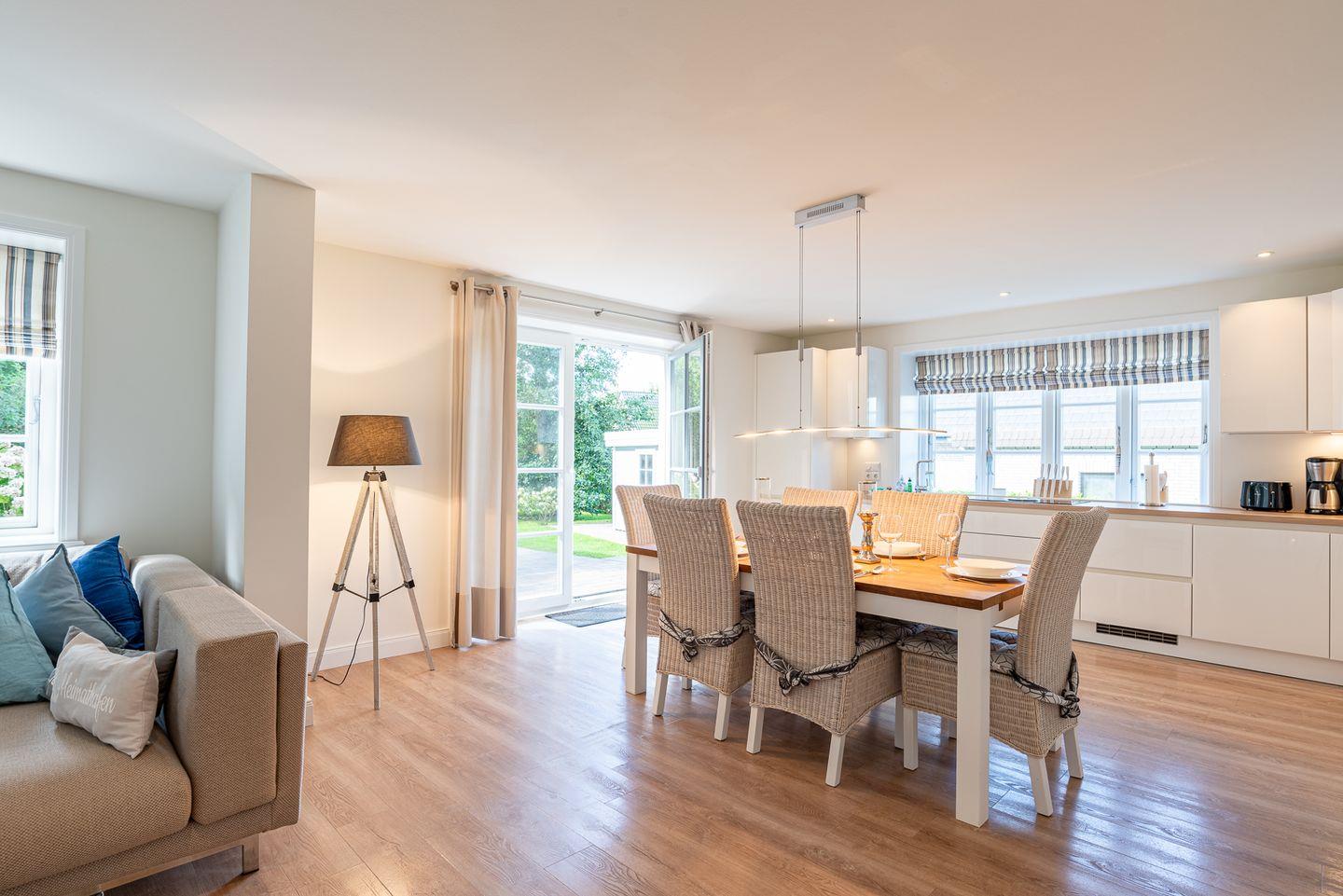 Die Highlights des Hauses sind unter anderem der offene Wohnbereich sowie die anliegende Terrasse mit Strandkorb.