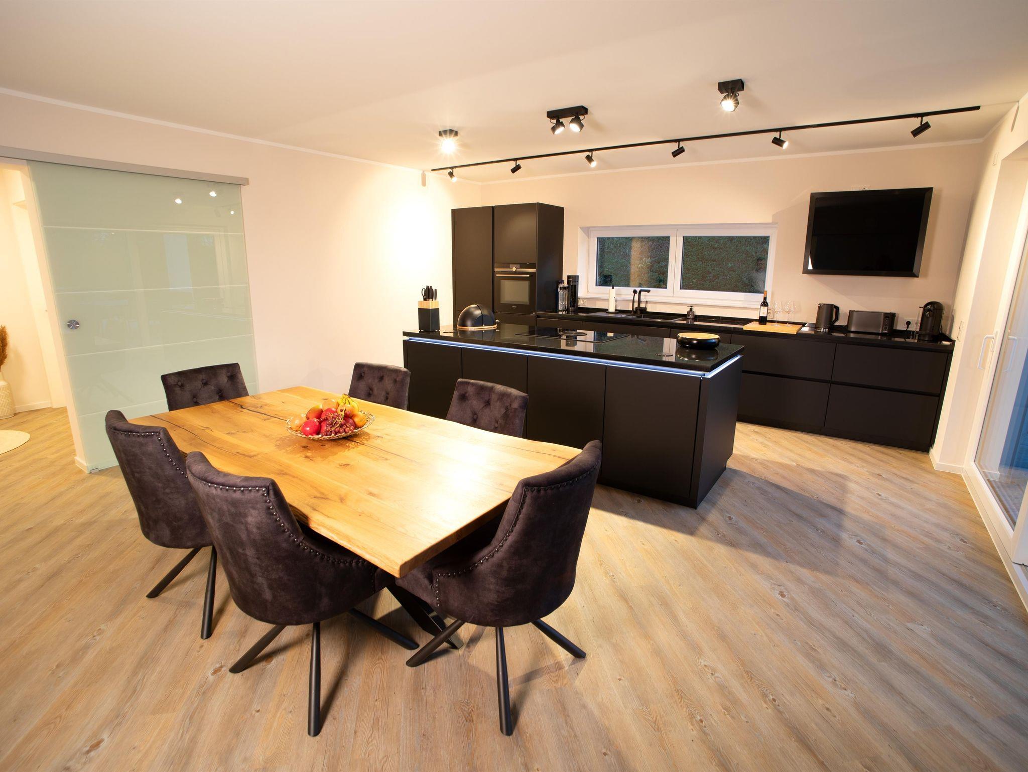 Die Villa Heimat besitzt eine voll ausgestattete und hochwertige Küche. Von Kaffeemaschine bis zum Kontaktgrill ist alles vor Ort. Eine Ladestation für E-Autos ist vorhanden. Es gibt einen extra Raum um die Fahrräder sicher unterzustellen. Waschmaschine und Trockner sind im Preis inklusive. Jedes Schlafzimmer besitzt ein eigenes Badezimmer.