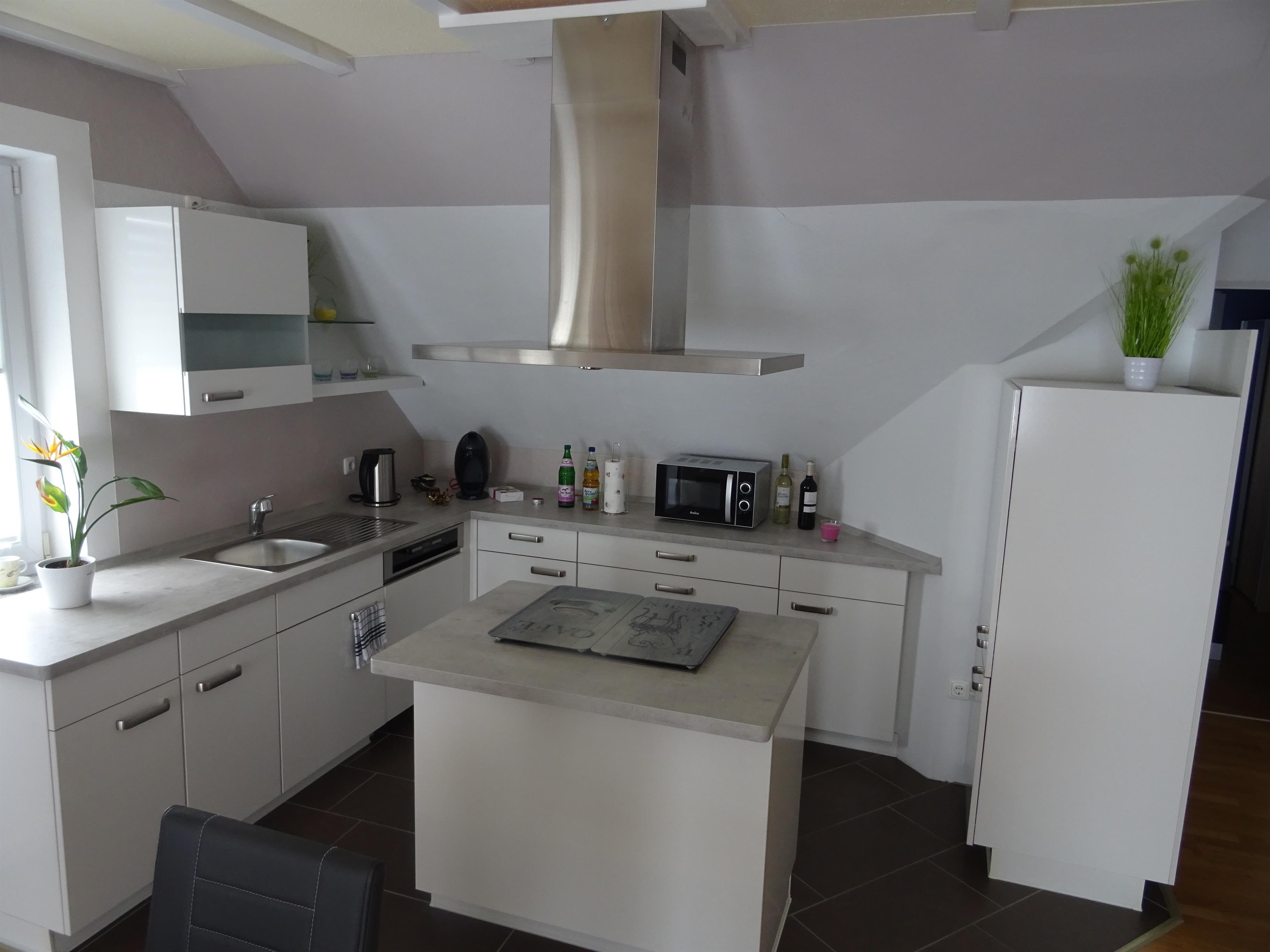 2. Stockwerk, Wohnraum mit Kaminofen und Küchenecke mit Essbereich, Bad mit sep. Toilette, ein Schlafzimmer mit Boxspring-Doppelbett und Schwebetürenschrank, zweites offenes Schlafzimmer im Maisonette mit zwei Boxspring-Einzelbetten, 7m² großer Balkon mit einmaligem Ausblick