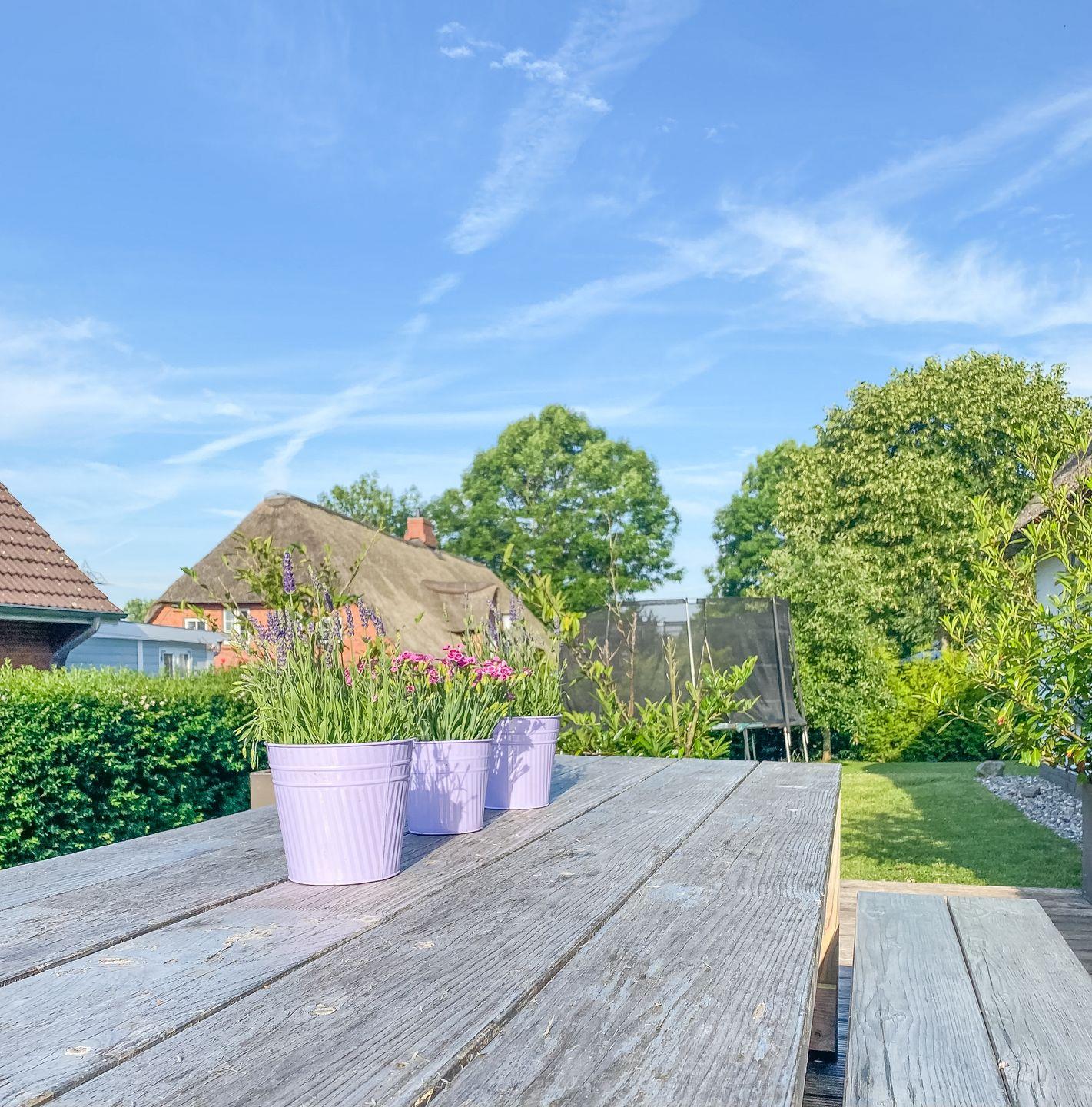Bei gutem Wetter lädt die 50 qm große Holzterrasse mit komfortablen Gartenmöbeln und ein schöner, eingezäunter Garten zum Entspannen ein. Für die Kleinen steht ein Trampolin bereit.