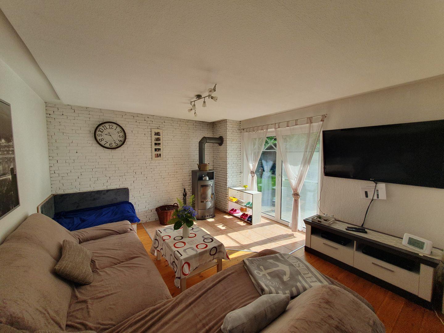 Die großzügigen Wohnräume sind hell und einladend gestaltet. Im Erdgeschoss befindet sich ein offener Essbereich mit einem großem Esstisch, der ideal für gesellige Abende und gemeinsame Mahlzeiten ist. Verbringen Sie entspannte Stunden im Wohnzimmer mit gemütlichem Kaminofen, der an kühleren Abenden eine wohlige Atmosphäre schafft. Und für Ihren Vierbeiner gibt es extra eine eigene Haustier - Couchecke. Das Spielzimmer hält zahlreiche Kinderspielzeuge bereit und verspricht Spaß für die kleinen Gäste.
