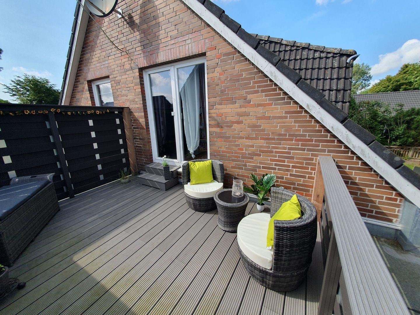 Die voll ausgestattete, moderne Küche lässt keine Wünsche offen: Von der Spülmaschine bis zur Kaffeemaschine haben Sie alles zur Hand, um kulinarische Meisterwerke zu kreieren. Im Erdgeschoss gelangen Sie zudem auf die Terrasse, wo Sie im Freien entspannen oder Abende mit Blick in den Garten genießen können. Hier können Sie auch auf den Sonnenliegen relaxen oder sich im Strandkorb eine Auszeit gönnen.