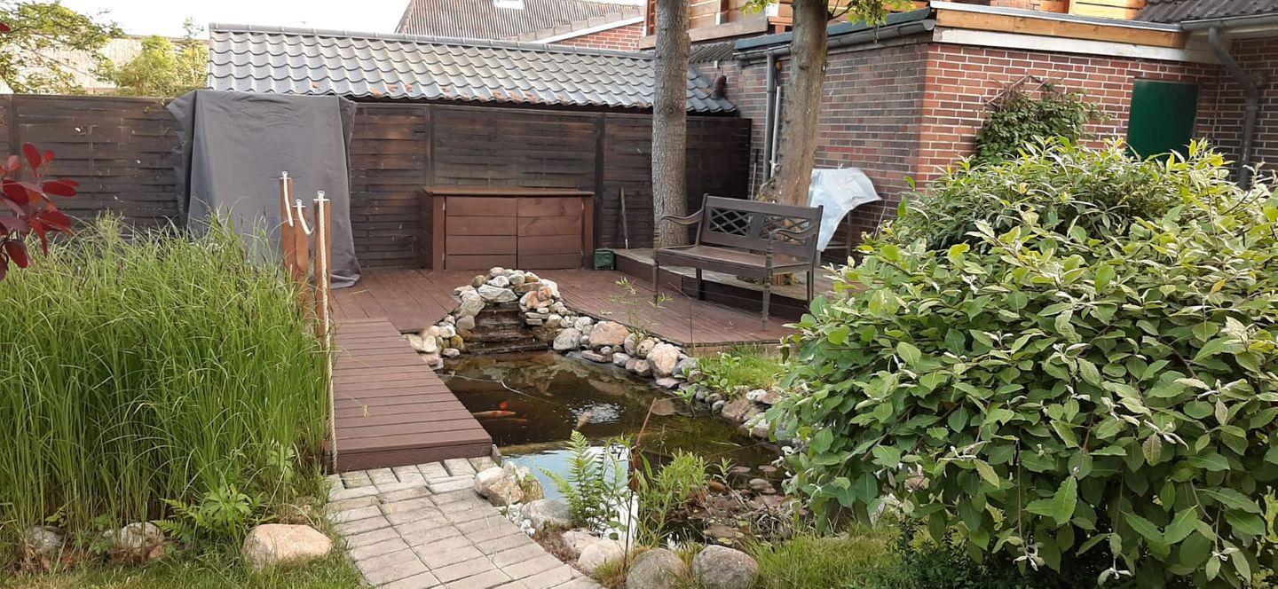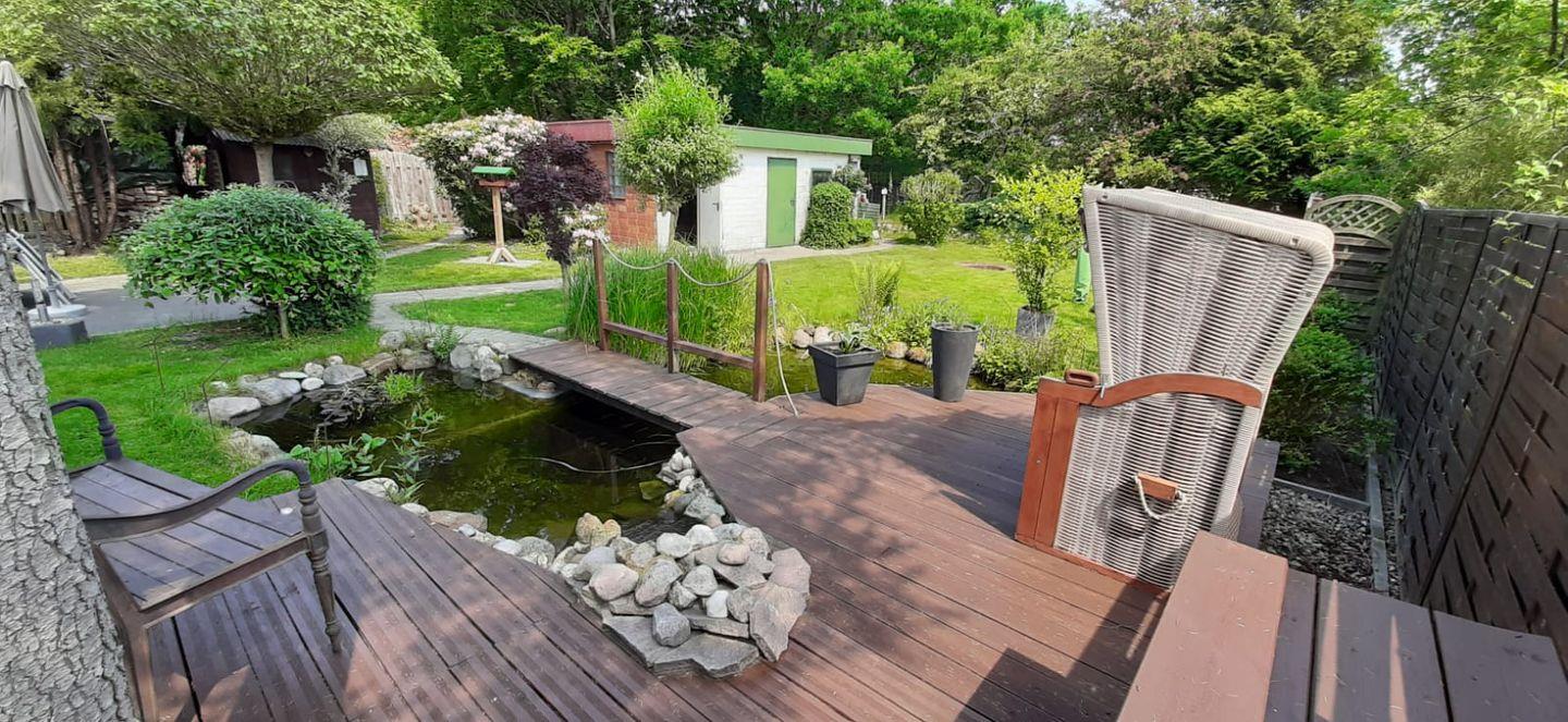 Das Zuhause für ein paar Tage ist von einem großen, abgeschlossenen Grundstück umgeben, ideal für Kinder, die sicher spielen können. Der Garten bietet viele liebevolle Details, einschließlich einer Gartenlaube und einem kleinen Teich, die eine entspannende Oase schaffen. Hier können Sie die Seele baumeln lassen und die Natur in vollen Zügen genießen.