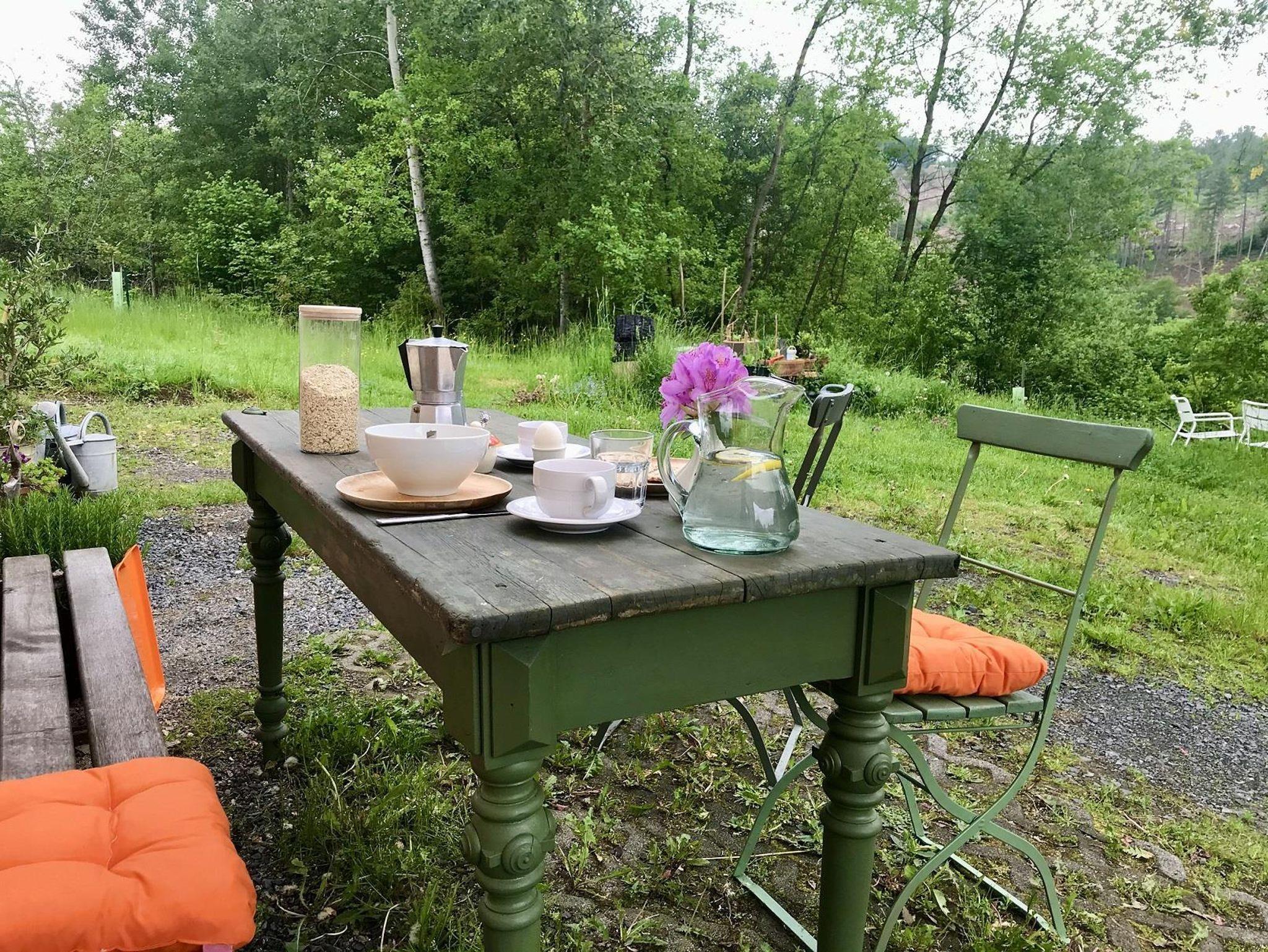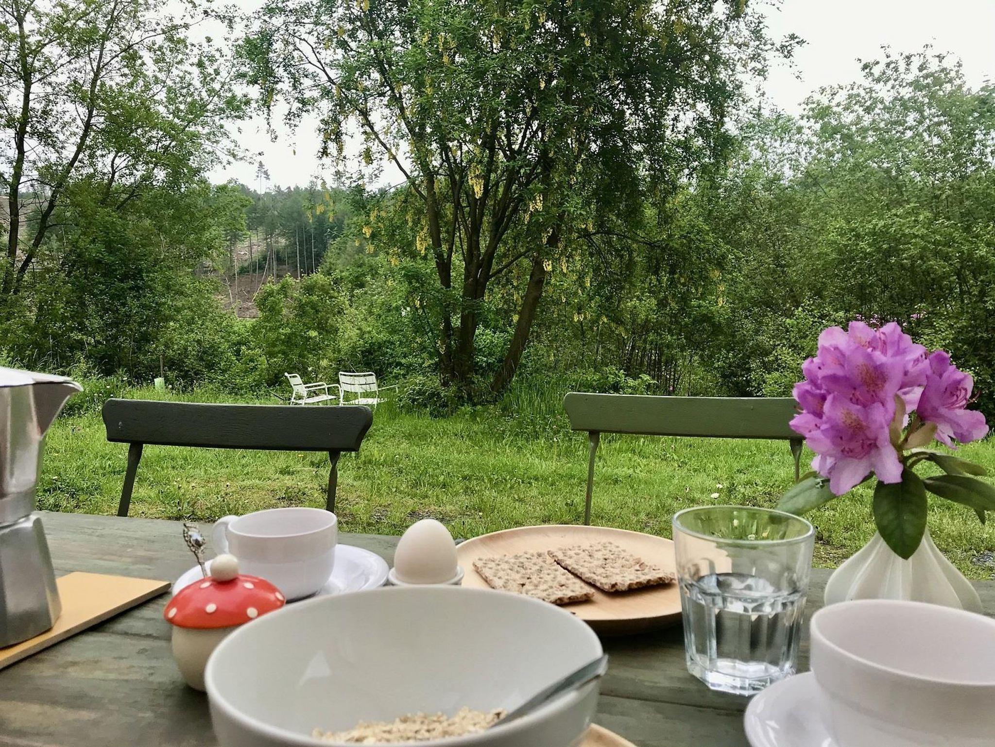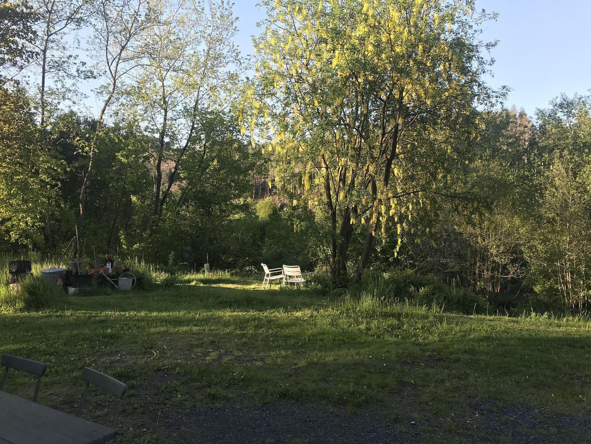 Direkt ans Haus schließen eine zugehörige Wiese und ein kleines „Wäldchen“ an, hier könnt Ihr versteckte Ruheplätze, inmitten von Bäumen, Sträuchern und duftenden Rankpflanzen finden.Wer einen kurzgemähten Rasen mit Blumenrabatten erwartet wird enttäuscht sein, hier darf fast alles wachsen wie es möchte und wird lediglich leicht im Zaum gehalten. Die Feuerschale und das dazugehörige Brennholz liegen für Euch bereit.