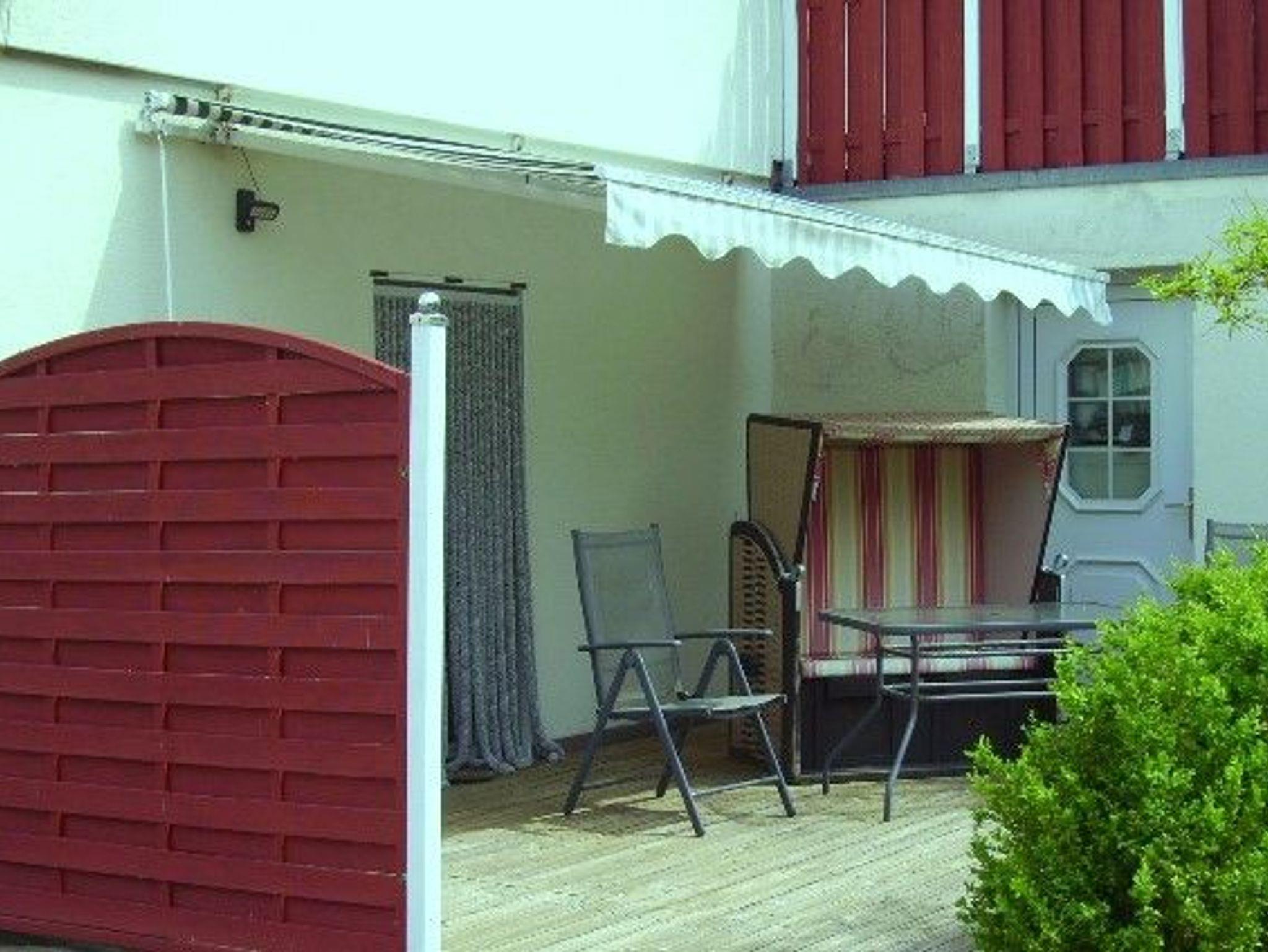 • Terrasse mit Strandkorb, Gartenmöbeln und Grill