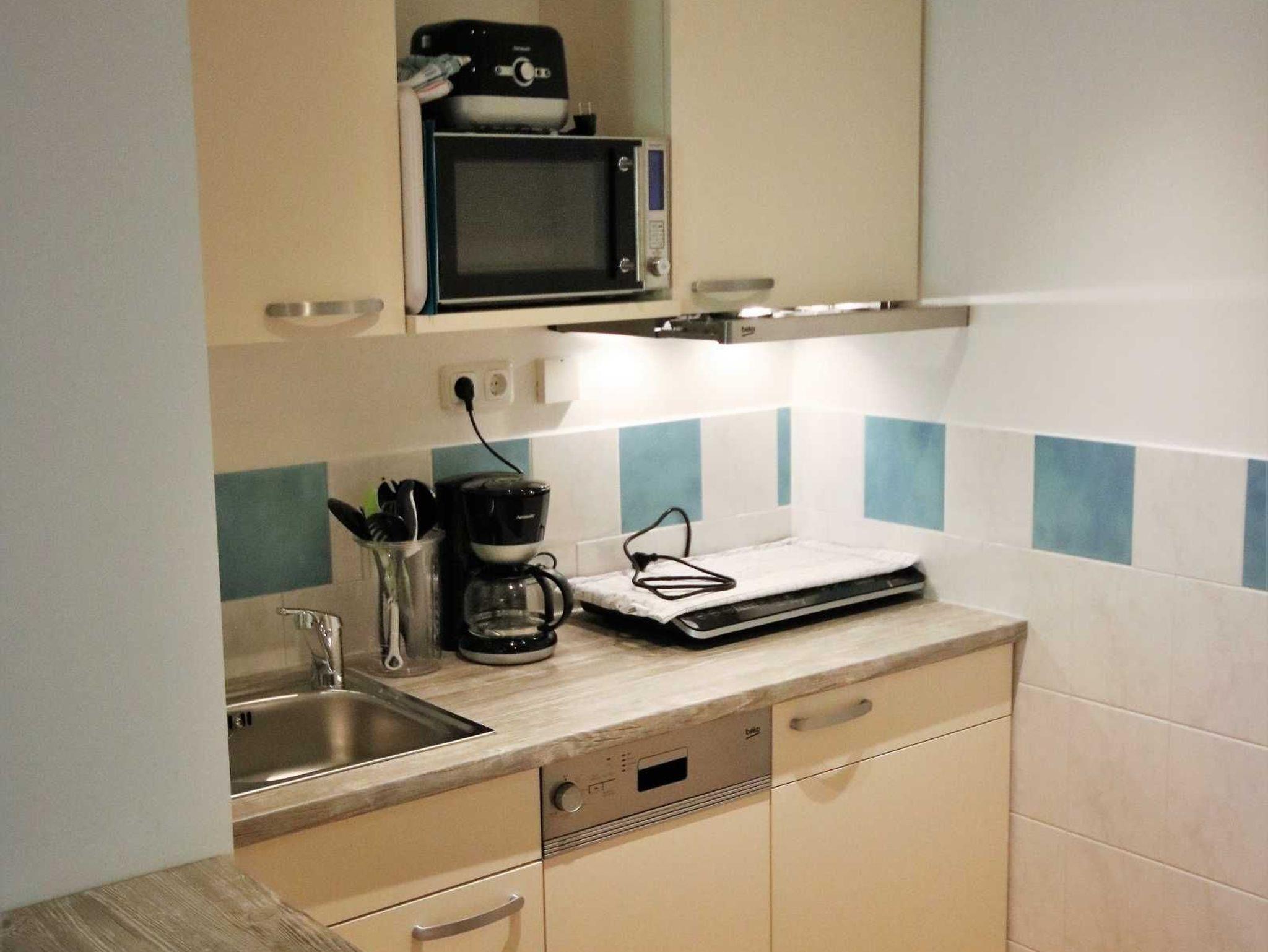 Die moderne Einbauküche bietet einen Kühlschrank mit Tiefkühlfach, einen Geschirrspüler, Kaffeemaschine, Wasserkocher, Toaster, Mikrowelle mit Grillfunktion, 2- Platten- Induktionsfeld sowie reichlich Geschirr.