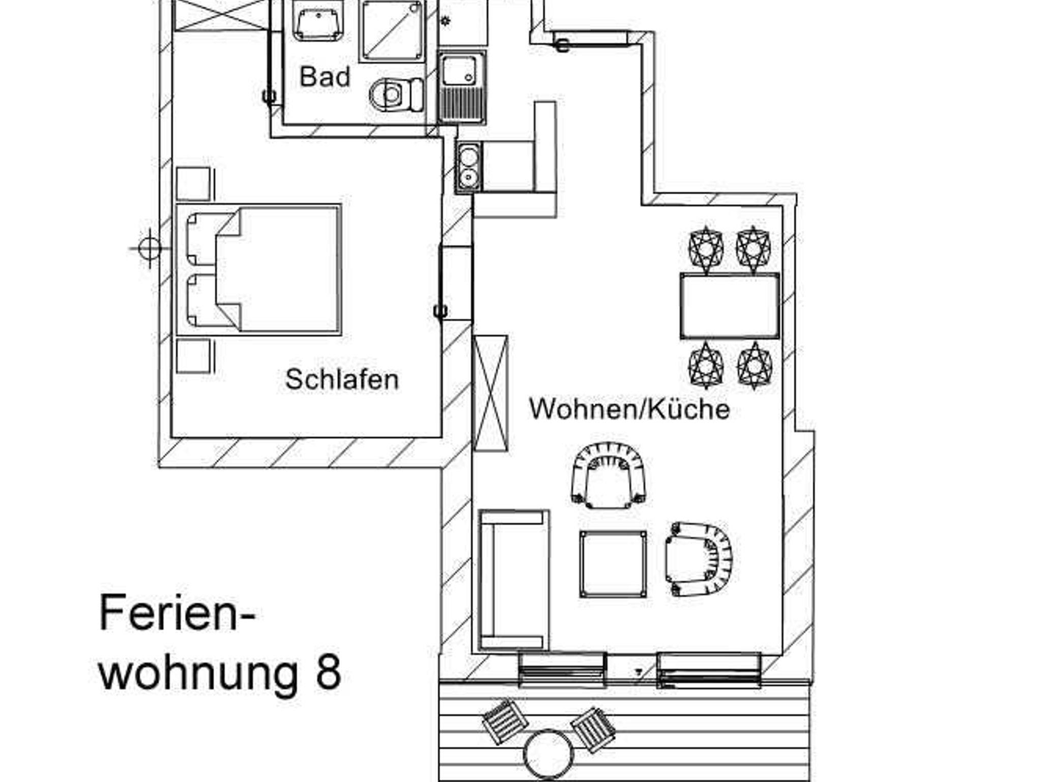 Die 43 m² große Nichtraucher- Ferienwohnung 8 mit eigenem PKW- Stellplatz befindet sich im ersten Obergeschoss des kleinen Hauses und verfügt über einen offenen Wohnraum mit einer modernen Küchenzeile, einem gemütlichen Wohnbereich mit Sofa und Sessel, einem Essplatz mit Seeblick, ein Schlafzimmer mit einem Doppelbett sowie ein Bad mit Dusche und WC. Vom großen Süd-Balkon haben Sie einen herrlichen Blick über den Dreier See; aber auch wenn das Wetter einmal nicht so schön sein sollte, werden Sie sich in den freundlich eingerichteten, lichtdurchfluteten Räumen wohlfühlen.