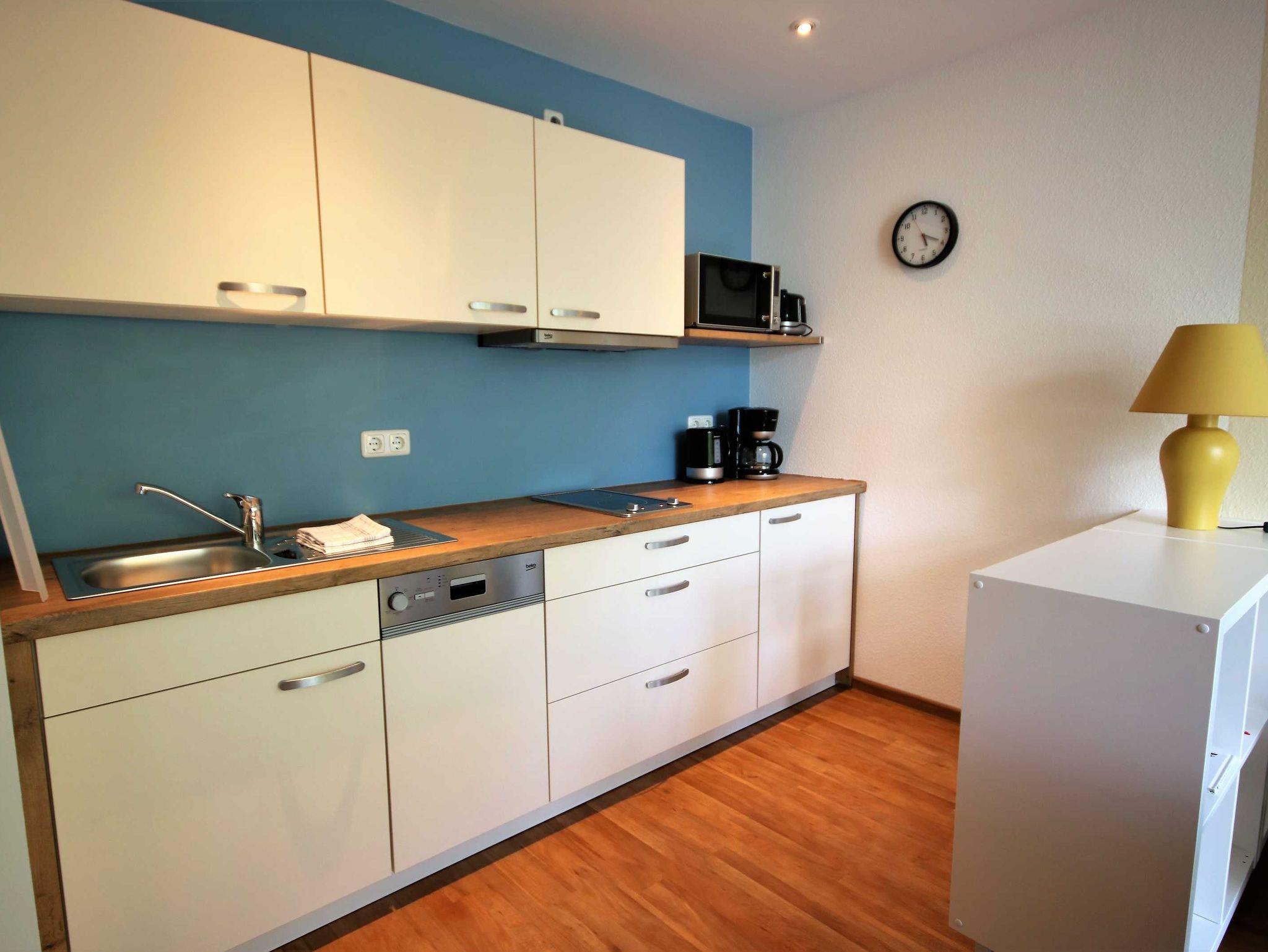 Die moderne Einbauküche bietet einen Kühlschrank mit Tiefkühlfach, einen Geschirrspüler, Kaffeemaschine, Wasserkocher, Toaster, Mikrowelle mit Grillfunktion, 2- Platten- Ceranfeld sowie reichlich Geschirr.