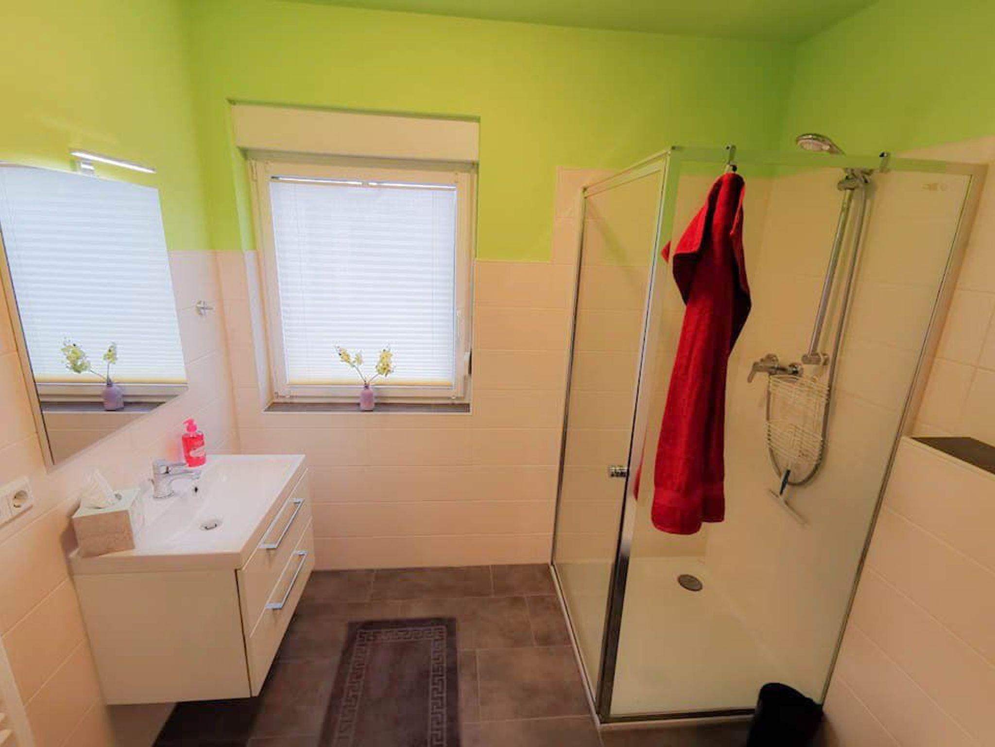 Das neu sanierte Badezimmer ist modern ausgestattet mit Waschtisch, Dusche, WC und Handtuchtrockner.