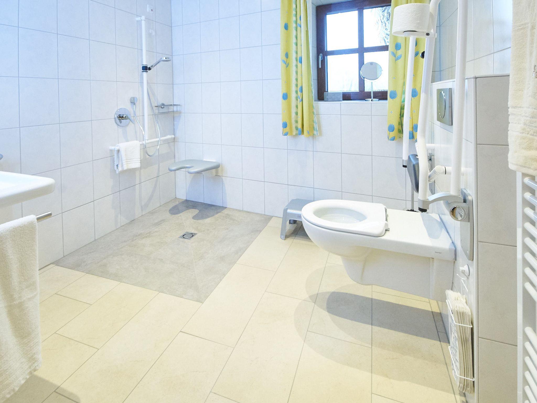 Die barrierefreie Ferienwohnung Unterstadel bietet mit einer Größe von 37 ² ausreichend Platz für einen Urlaub mit 1 bis 3 Personen. Gemütlichkeit wird in der modern eingerichteten Ferienwohnung groß geschrieben. In der komplett ausgestatteten Wohn-Küche finden Sie alles, was Sie für Ihren Urlaub in Altötting benötigen - darunter auch eine gemütliche Sitzgruppe inklusive Flat-TV. Schon bei der Ankunft werden Sie die Vorzüge unserer barrierefreien Ferienwohnung genießen, denn Sie können mit dem Auto direkt vor der Wohnungstüre parken. In der Wohnung haben wir breite Türen (90 cm) eingebaut und alle Räume schwellenlos gestaltet, damit Sie mit Ihrem Rollstuhl bequem und ungehindert alle Bereiche erreichen können. Im Badezimmer stehen eine befahrbare, schwellenlose Dusche (1,2 x 1,2 m) mit Haltegriffen und einem Duschstuhl für Sie bereit. Das Waschbecken ist höhenverstellbar und unterfahrbar. Das behindertengerechte WC ist mit einer Halterung und klappbaren Haltegriffen mit Spülung ausgestattet. Um sich für den Urlaubstag in Altötting so richtig schick zu machen, können Sie sich im behindertengerechten Spiegel mit einer Höhe von 1 m bequem stylen.