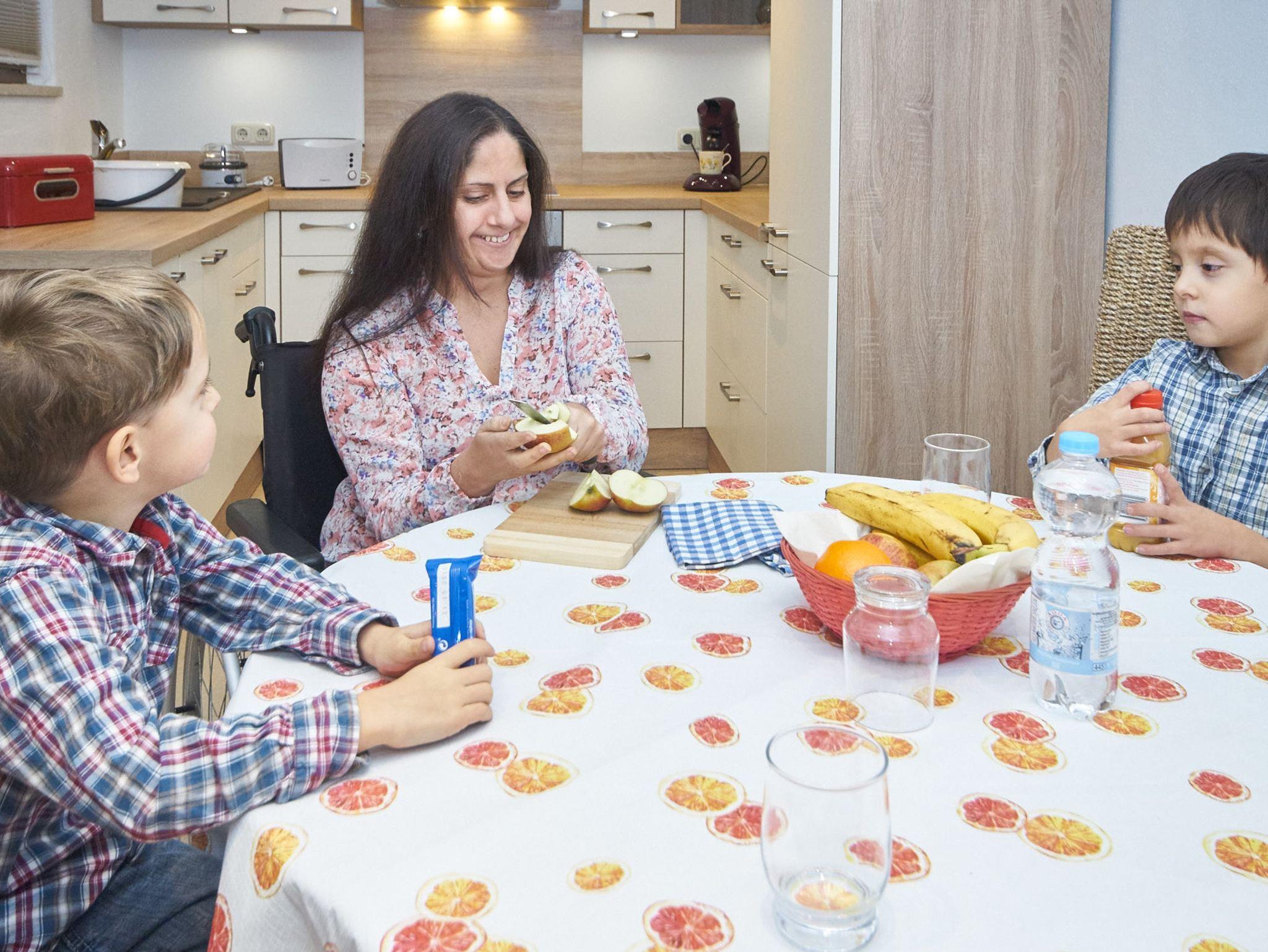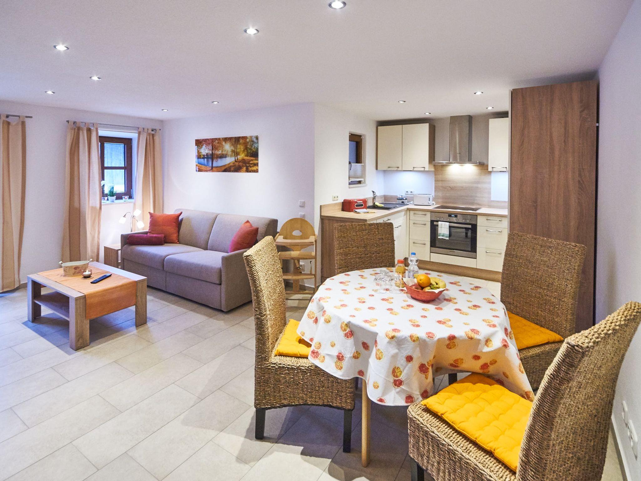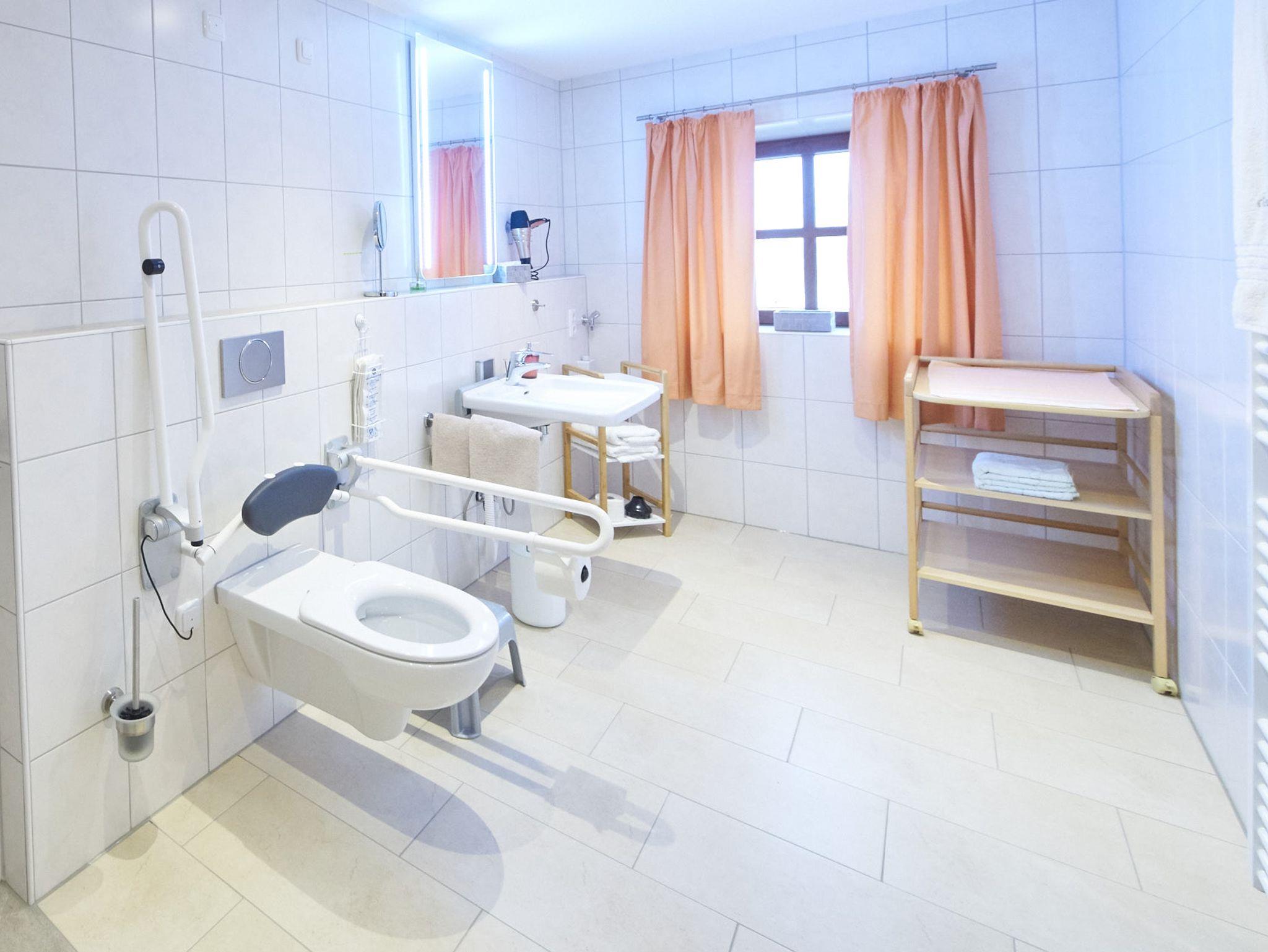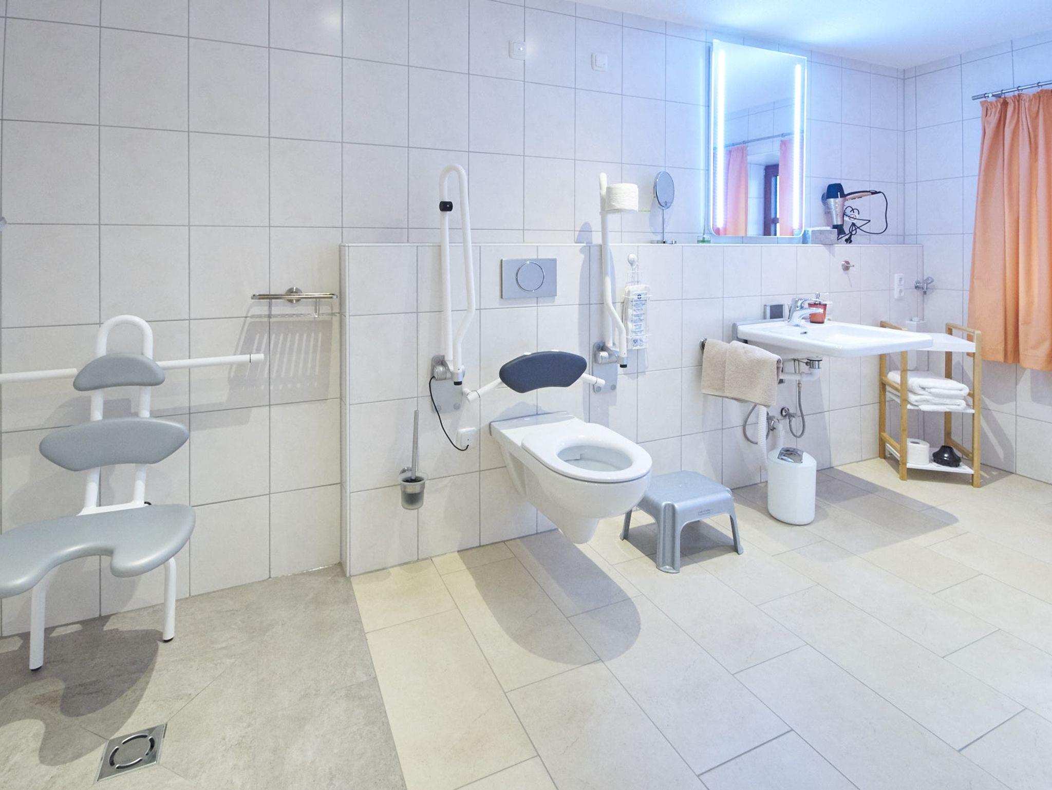 Mit 52 ² ist die barrierefreie Ferienwohnung Oberstadel für 1 bis 4 Personen geeignet. Die modern ausgestattete Ferienwohnung bietet nicht nur ein echtes Wohlfühlambiente, sondern auch alle Annehmlichkeiten die Sie sich für einen entspannten Urlaub in Altötting wünschen. Beim Neubau unserer Ferienwohnung haben wir auf eine barrierefreie Einrichtung geachtet. Konkret bedeutet dies, dass Sie mit dem Auto direkt bis zur Eingangstür der Ferienwohnung fahren können. Die gesamte Wohnung ist schwellenlos und alle Türen weisen eine Breite von 90 cm auf, damit Sie mit dem Rollstuhl bequem und ohne Stolpersteine alle Bereiche erreichen. Im Badezimmer sorgen eine befahrbare, schwellenlose Dusche mit 1,2 x 1,2 m Größe, Haltegriffen und Duschstuhl für einen hohen Komfort. Das Waschbecken ist unterfahrbar und auch die Höhe können Sie ganz nach Ihren Wünschen einstellen. Das behindertengerechte WC verfügt über Halterungen und einer Spülung direkt am Haltegriff. Auch der 1 m hohe Spiegel im Badezimmer ist für die Bedürfnisse von Rollstuhlfahrern angepasst.