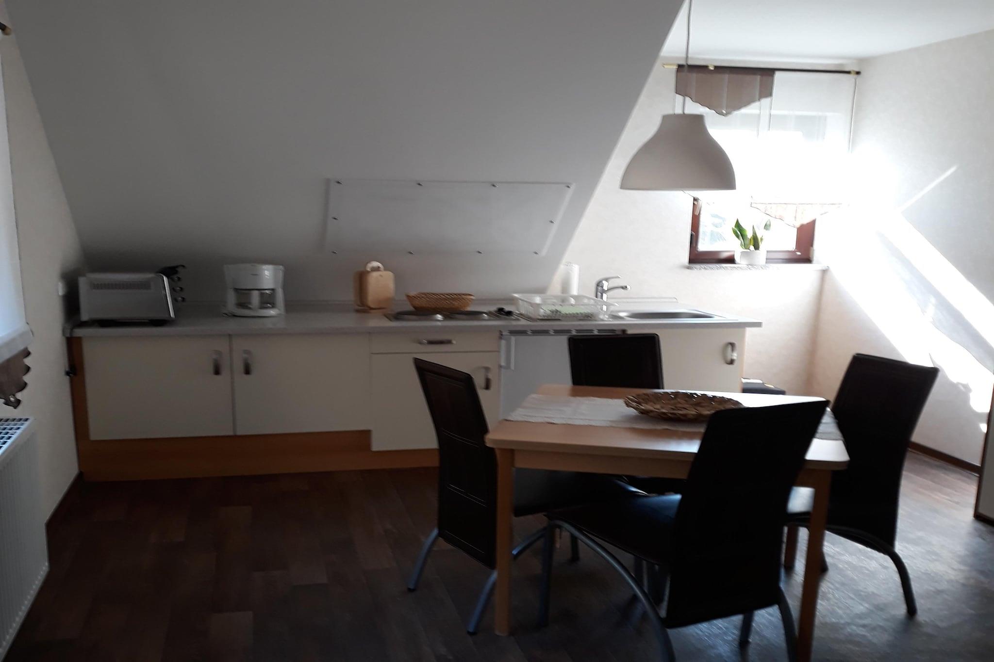 In der 1. Etage: (offene Küche(Esstisch, Kochplatte(2 Kochplatten, elektrisch), Wasserkocher, Toaster, Kaffeemaschine, Kühl-/Gefrierkombination), Wohn/Esszimmer(Doppelschlafcouch, TV(Satellit), Radio), Schlafzimmer(Doppelbett), Badezimmer(Dusche, Toilette)) Sitzecke, Heizung(Öl), Garten, Gartenmöbel, Parkplatz, Hochstuhl, Babybett (kostenlos)