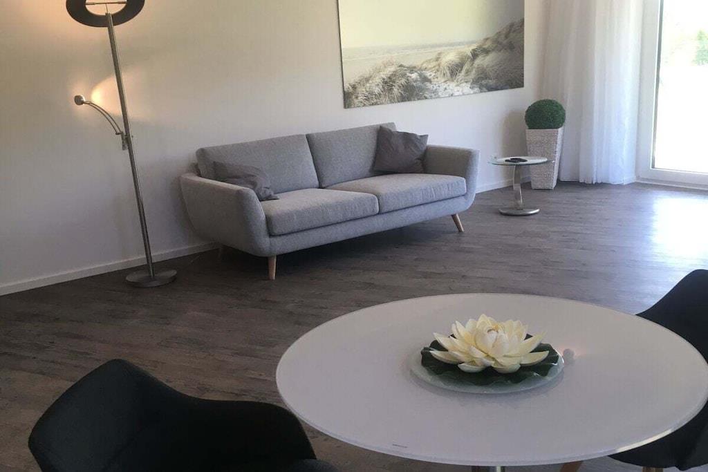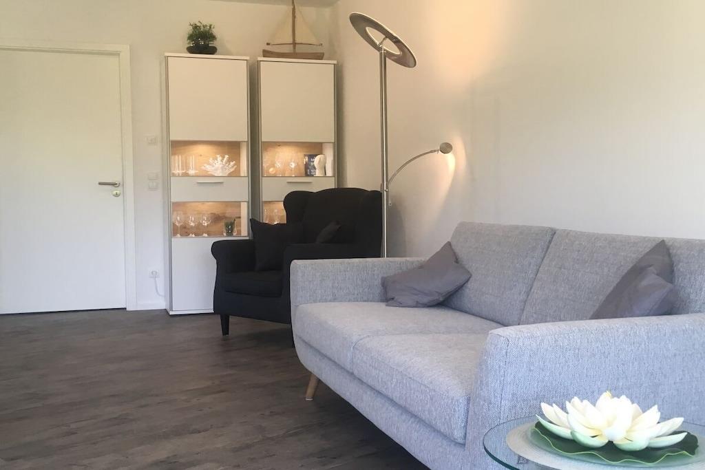 Die 2-Zimmer Ferienwohnung ist im Jahr 2018 fertiggestellt worden. Sie ist exklusiv und individuell ausgestattet. Die Wohnfläche beträgt ca. 64m², die sich auf 2 Zimmer, eine offene Küche, Diele und Bad verteilen. Das Wohnzimmer ist hell und freundlich mit Lichteinfall von zwei Seiten. Durch zwei Flügeltüren hindurch treten Sie vom Wohnzimmer aus auf die Terrasse und können es sich dort auf den Gartenstühlen gemütlich machen. Im Schlafzimmer empfängt Sie ein großes Doppelbett (2,00m x 1,80m) mit komfortablen Federkernmatratzen. Das Badezimmer verfügt über keramische Fliesen und Fußbodenheizung.