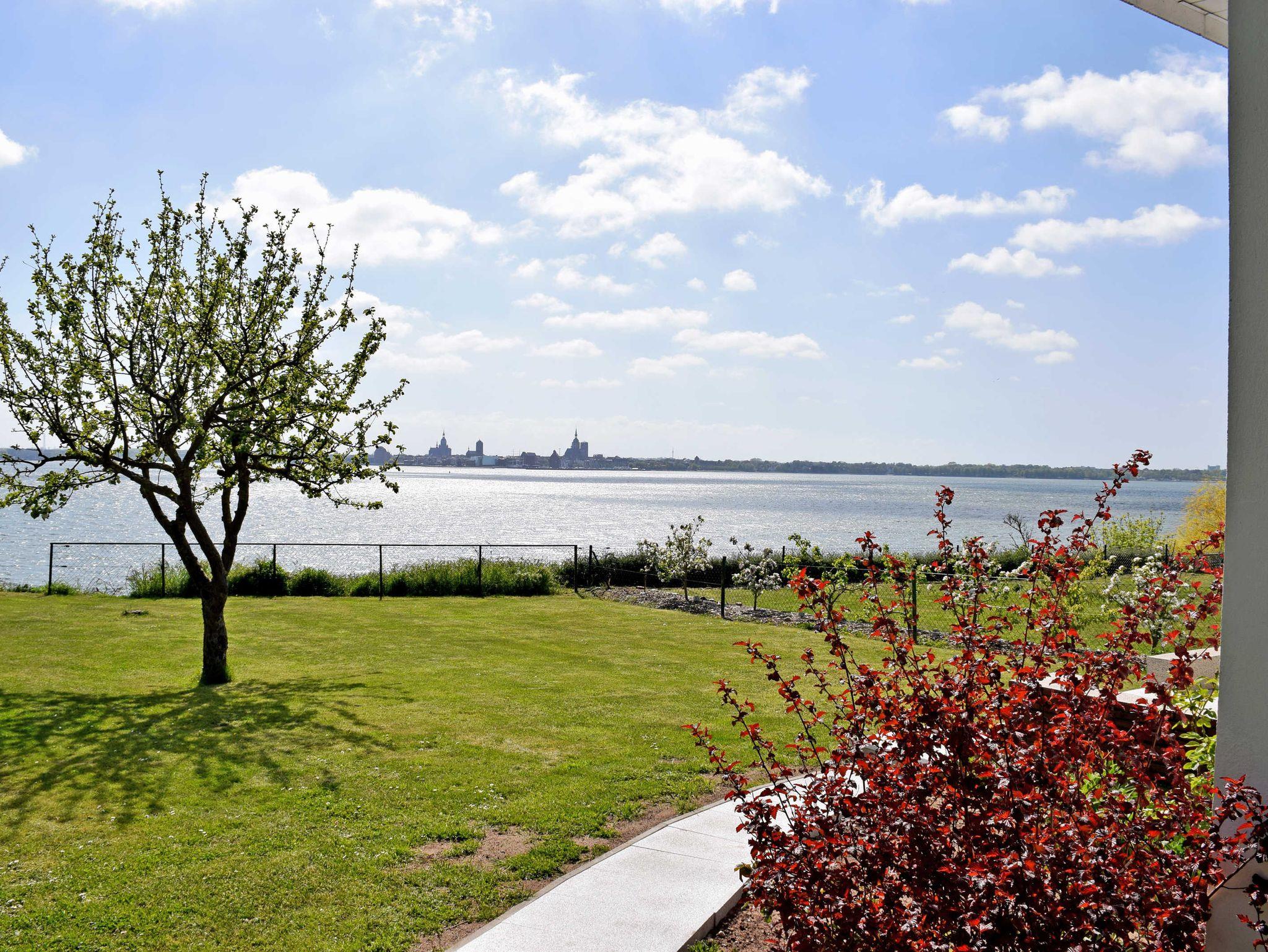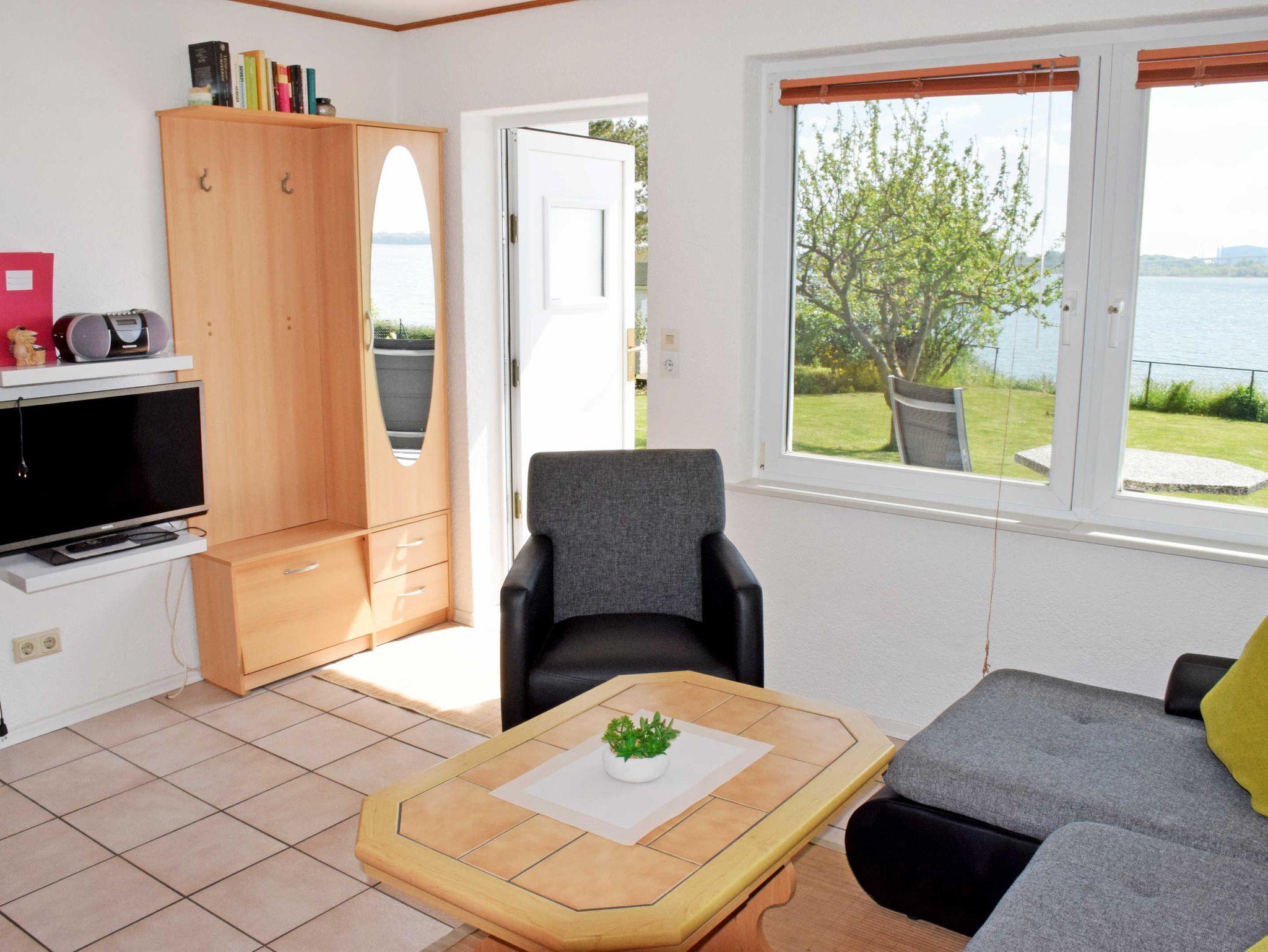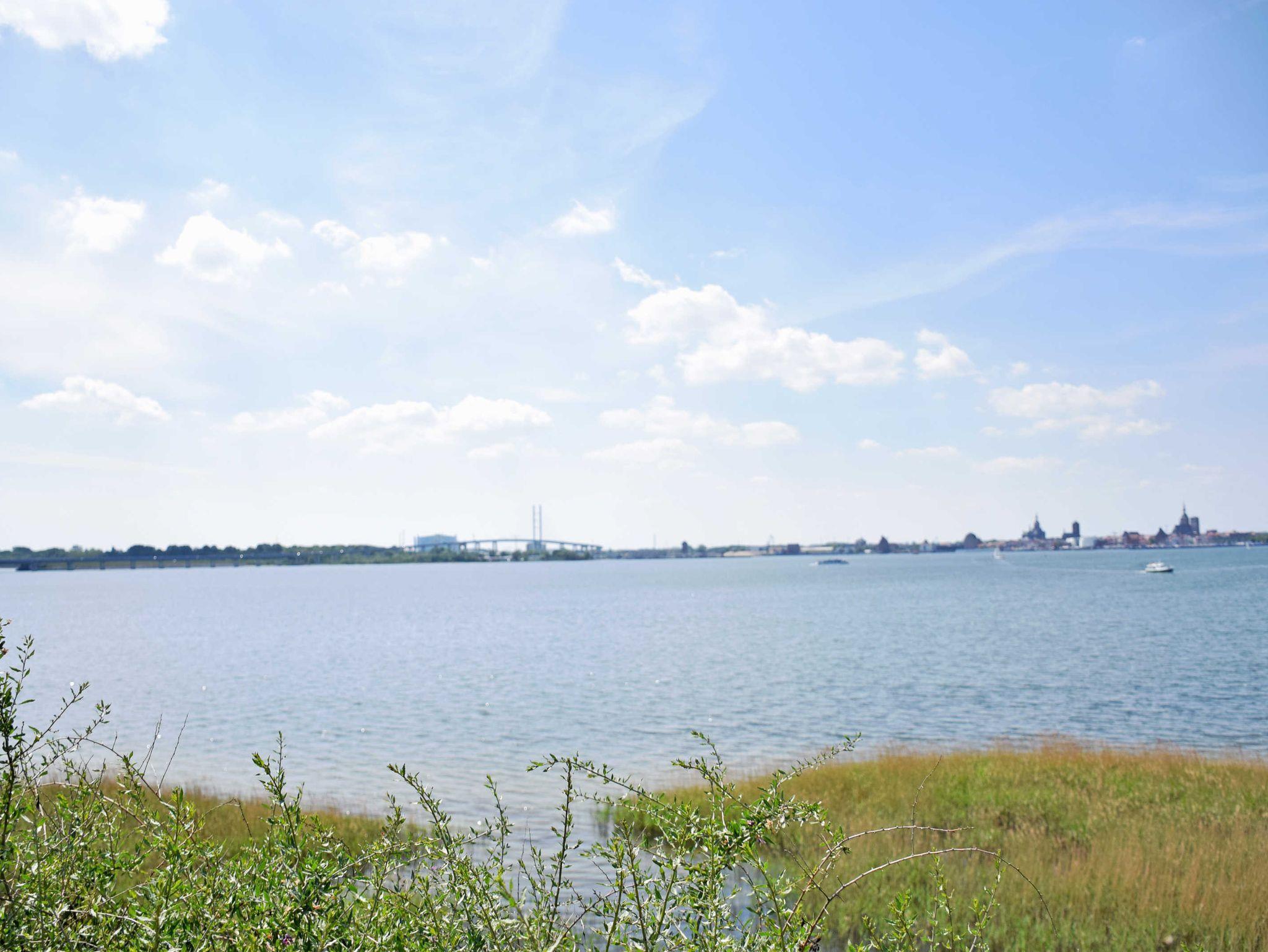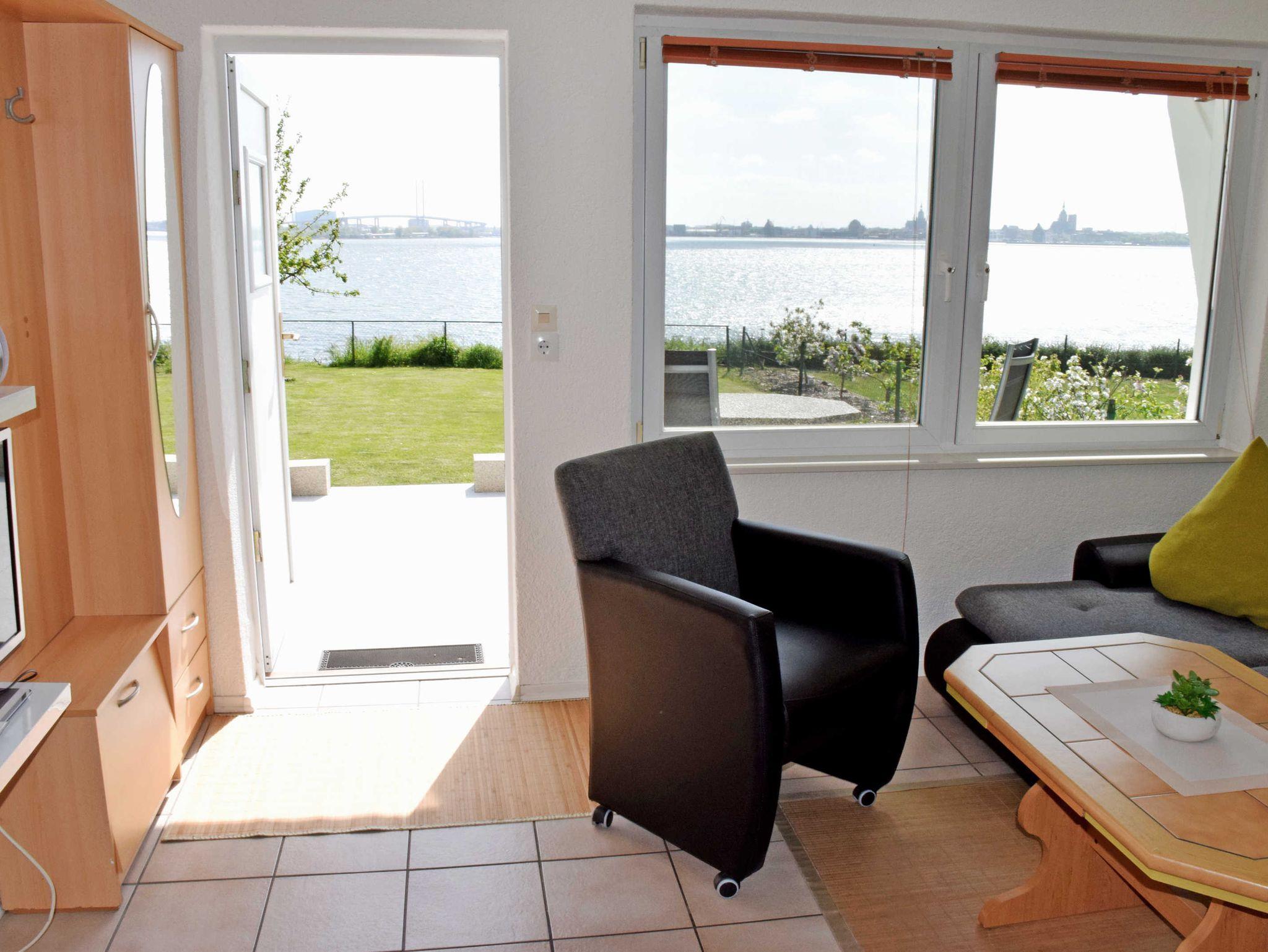 Im Wohnzimmer stehen eine Couch, Sessel und Tisch sowie und ein modernes Flachbild-TV-Gerät. Hier steht auch ein Esstisch mit Stühlen. Aus dem Wohnzimmer heraus hat man einen schönen Ausblick über den Sund nach Stralsund. WLAN kann kostenfreu mitgenutzt werden.