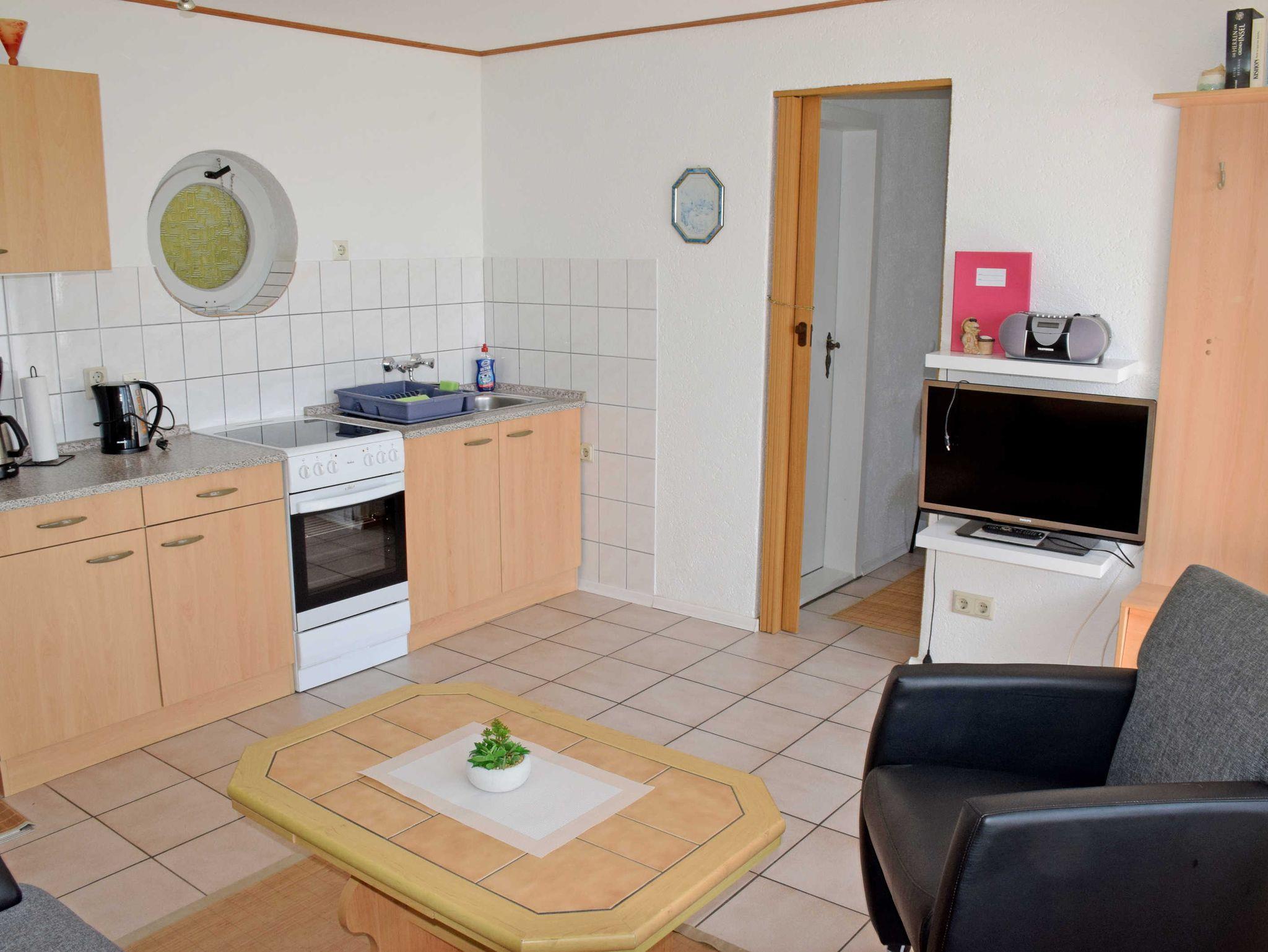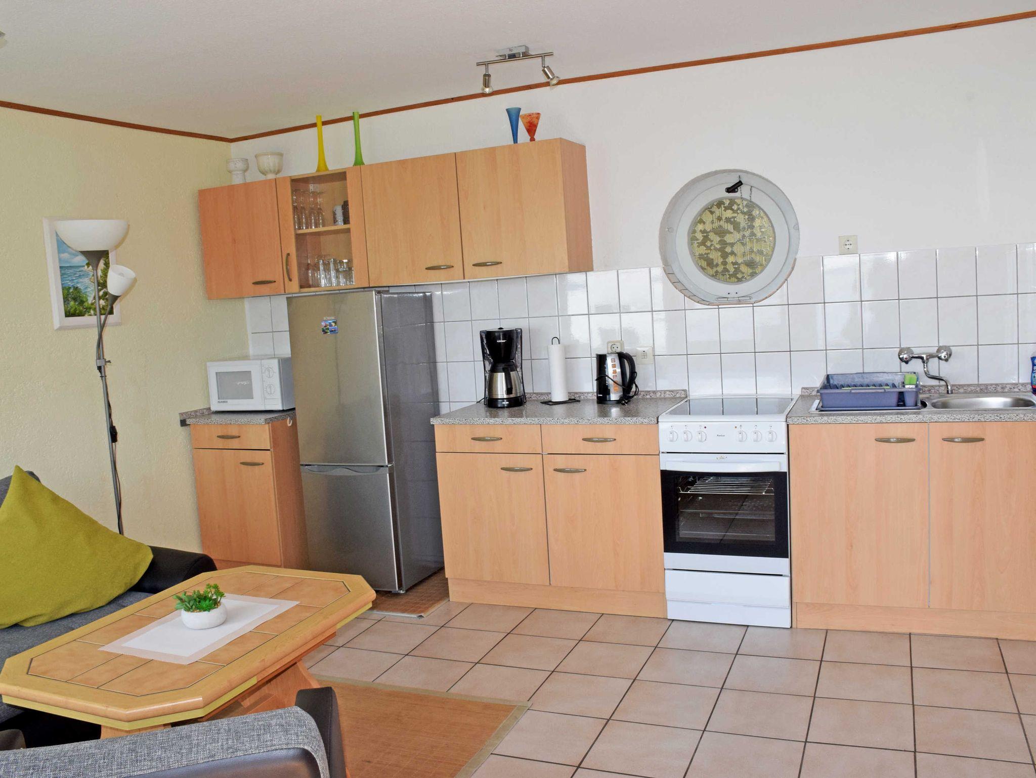 Die kleine Küchenzeile ist mit einem Herd, Backofen, Mikrowelle, Wasserkocher, Kaffeemaschine, Toaster und Kühlschrank mit Gefrierfach komplett ausgestattet.