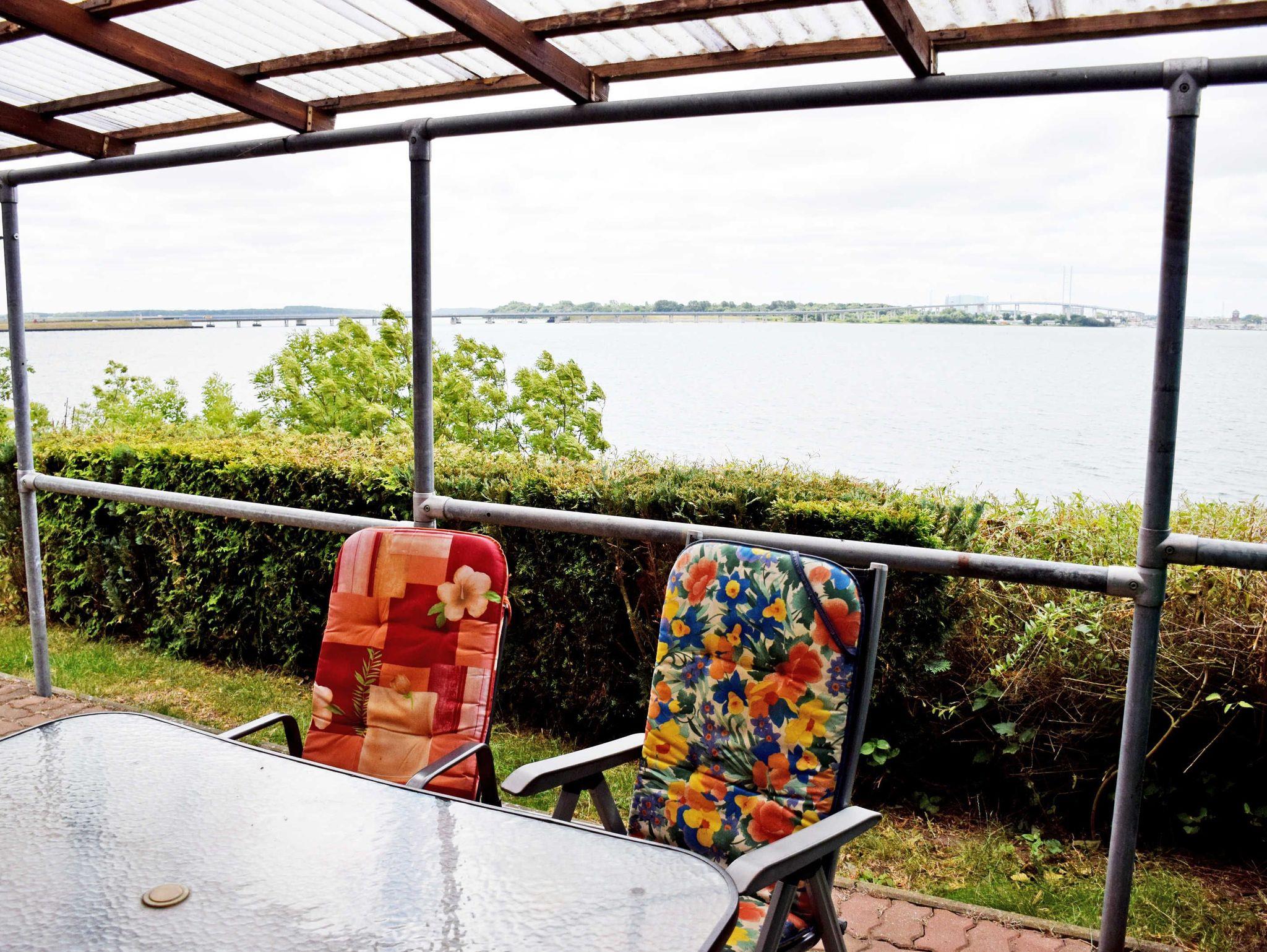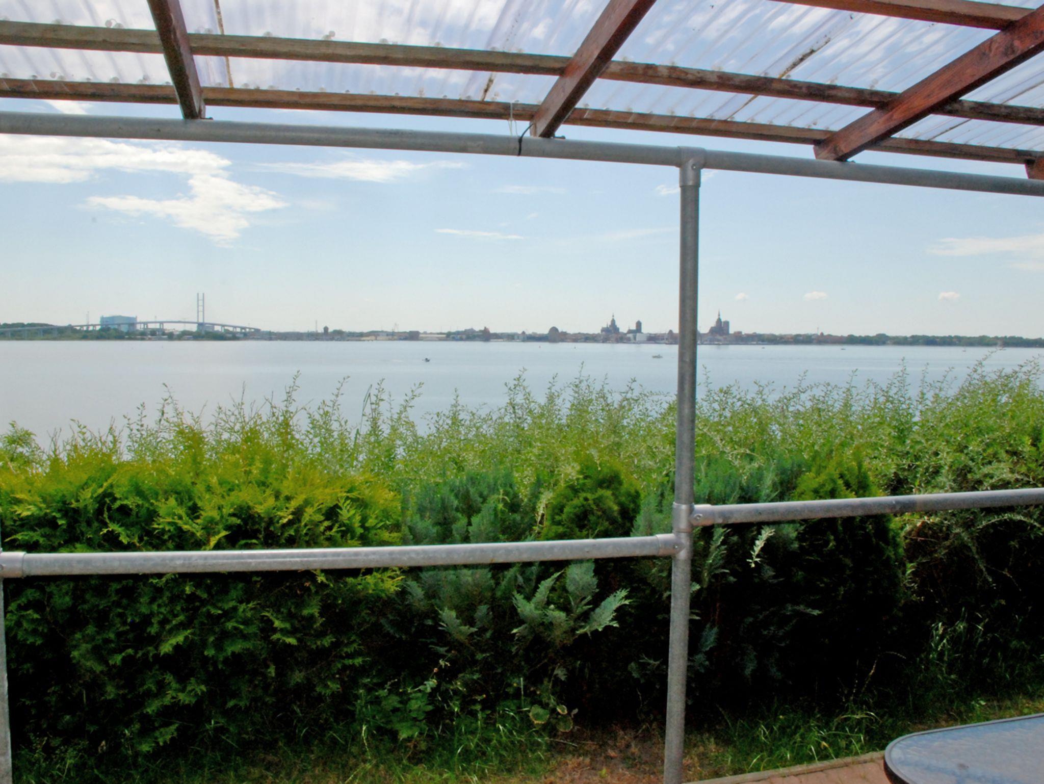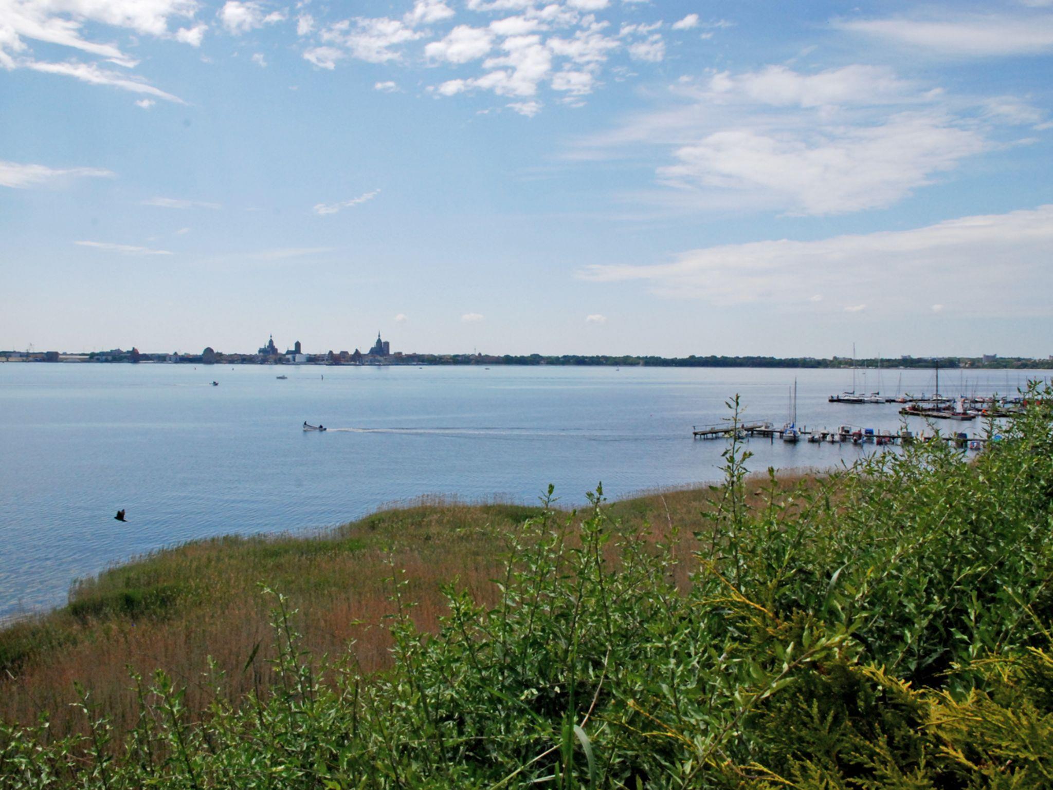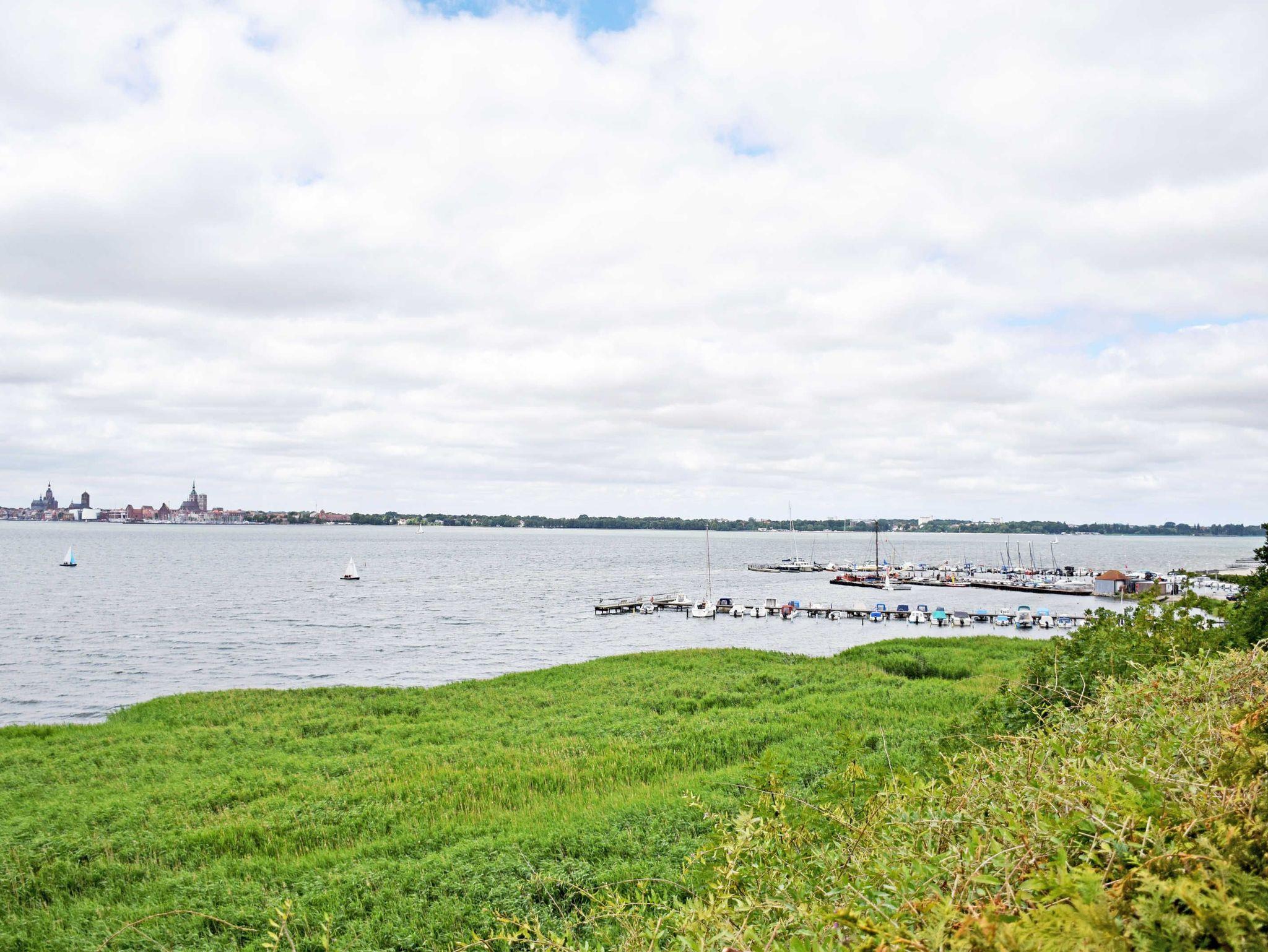 Gartenmöbel, Hollywoodschaukel, Grill und Spielmöglichkeiten für die Kinder finden Sie im angrenzenden, ruhigen, großen Garten, traumhaften Blick auf den Strelasund hinüber zur historischen Stadtsilhouette der Hansestadt Stralsund und zur neuen Rügenbrücke. Die Terrasse mit dem schönen Sundblick erreichen Sie nach dem Durchgang einer Scheune in ca. 50 m Entfernung vom Wohnungseingang.