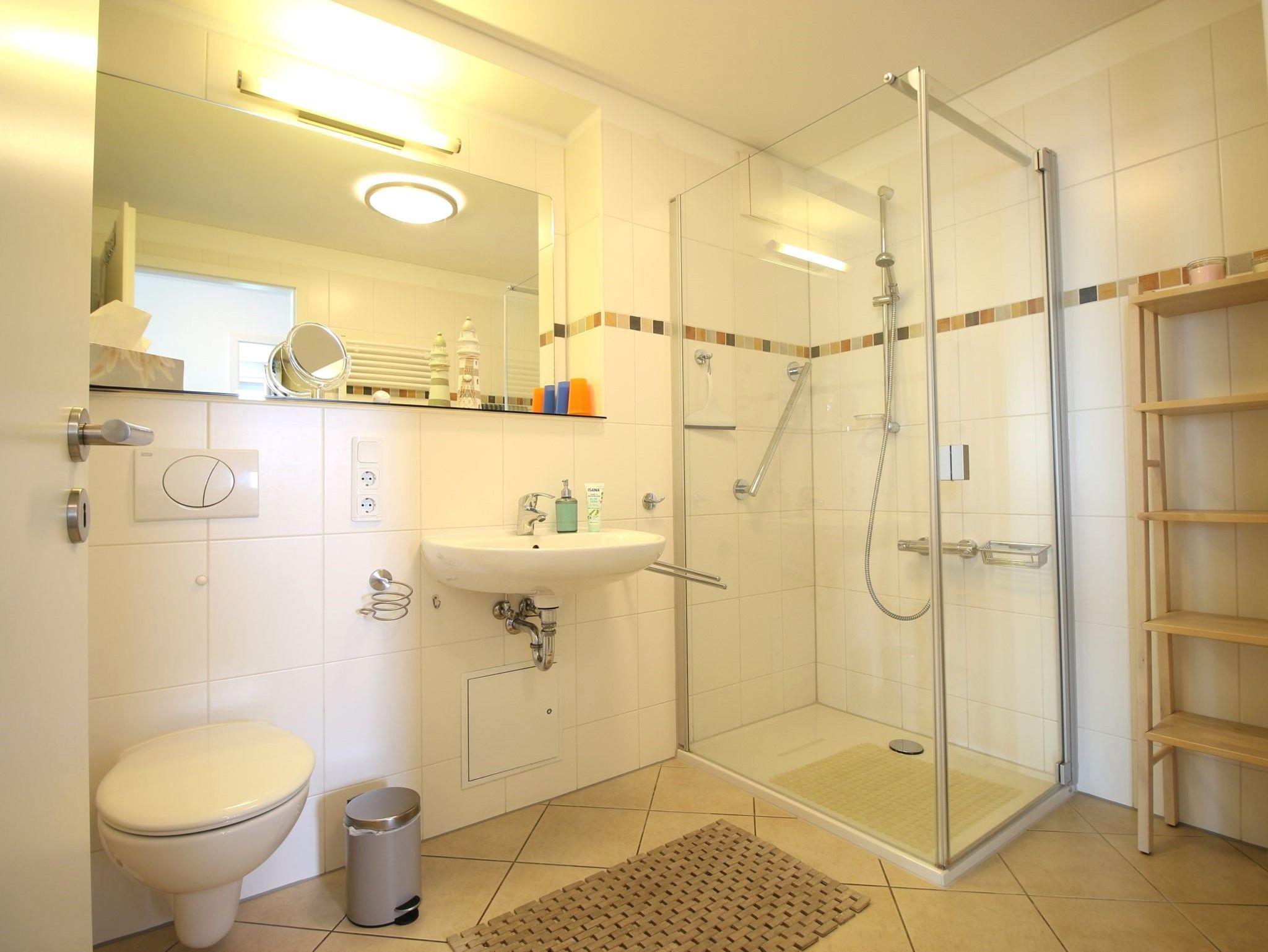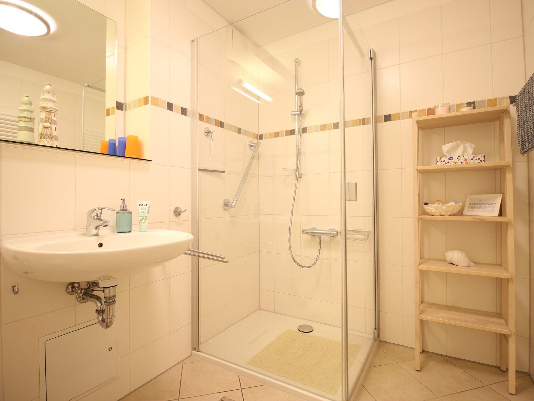 Das geräumige Bad verfügt über eine große Dusche mit Glasabtrennung und ebenerdigen Einstieg, Föhn, Waage und Vergrößerungsspiegel.