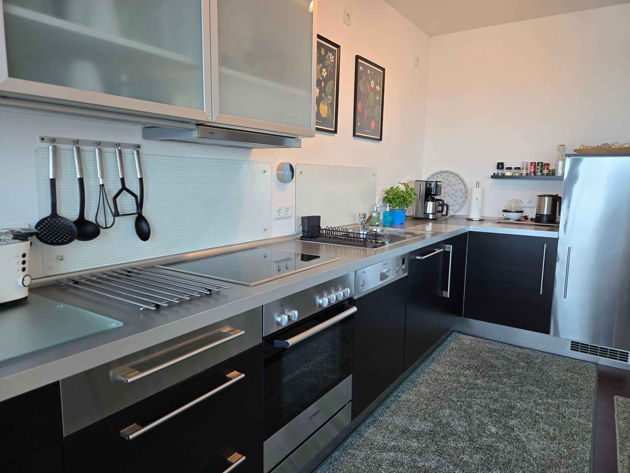 Der großzügige offene Wohn-, Ess- und Küchenbereich von ca. 30 qm verfügt über eine komplett ausgestattete Einbauküche mit Herd und Backofen, Dunstabzug, Mikrowelle, Spülmaschine, Kühlschrank mit 3-Sterne Gefrierfach, Kaffeemaschine, Toaster, Wasser- und Eierkocher.