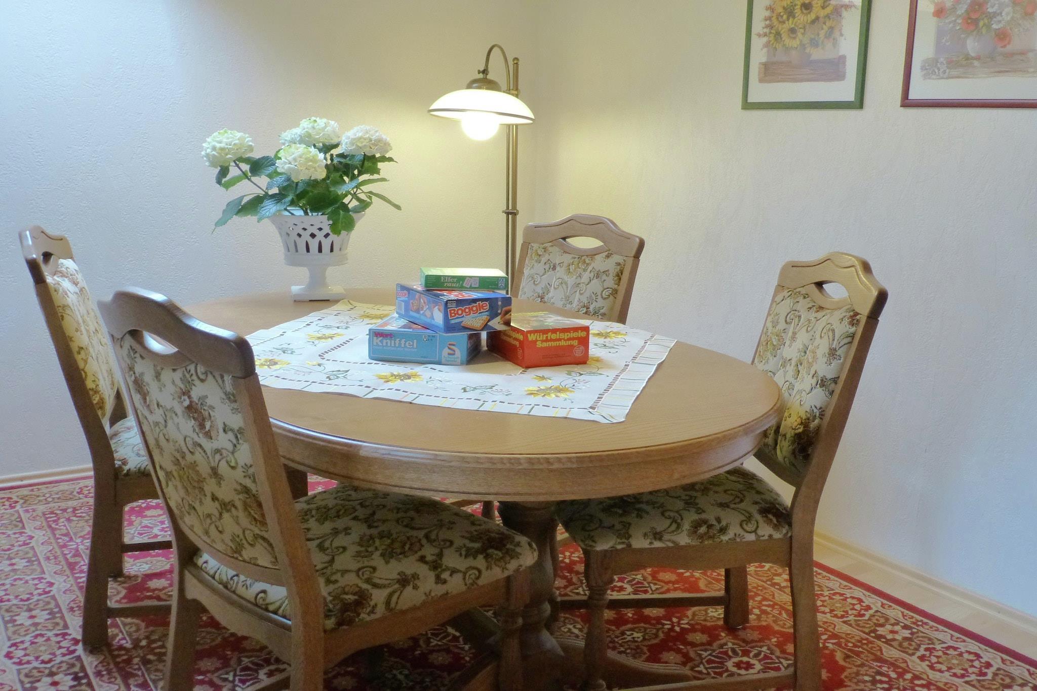 In der 1. Etage: (Küche(Wasserkocher, Kochherd(4 Kochplatten, Ceranfeld), Kaffeemaschine(Filter), Backofen, Mikrowelle, Spülmaschine, Kühl-/Gefrierkombination), Wohn/Esszimmer(TV(Satellit), Kaminofen, DVD-Spieler, CD-Spieler), Schlafzimmer(Doppelbett(200 x 200 cm)), Badezimmer(Badewanne mit Dusche, Waschbecken, Toilette, Föhn)) Waschmaschine(gegen Gebühr), Balkon, Heizung, Gartenmöbel, Parkplatz, Gesellschaftsspiele