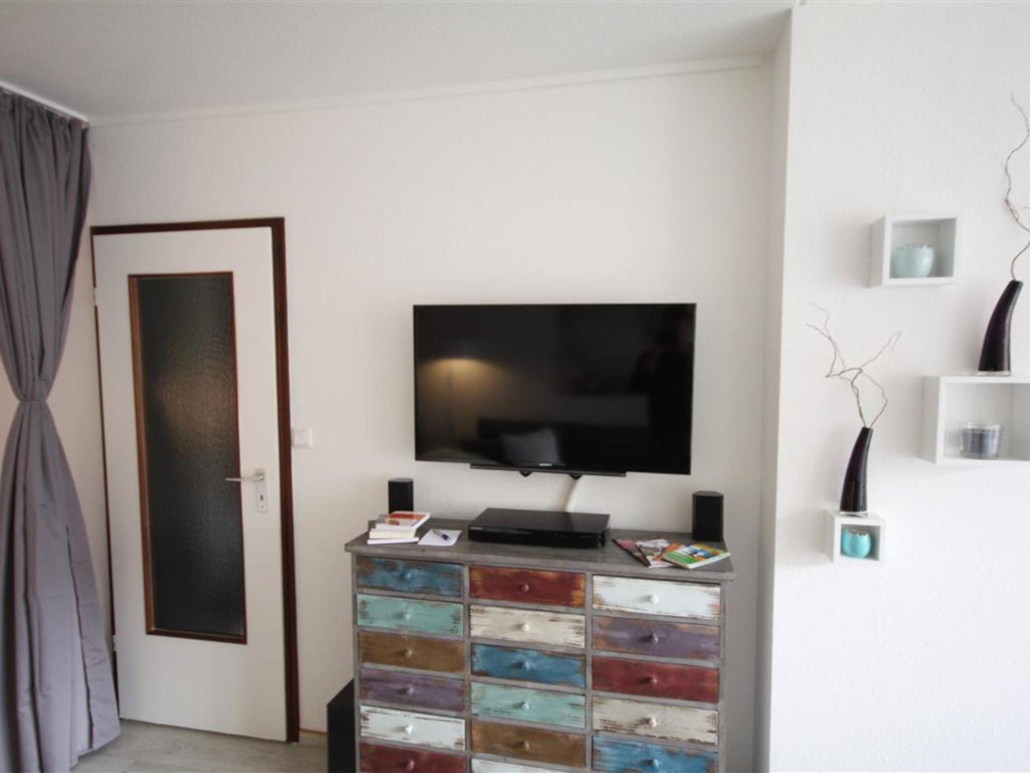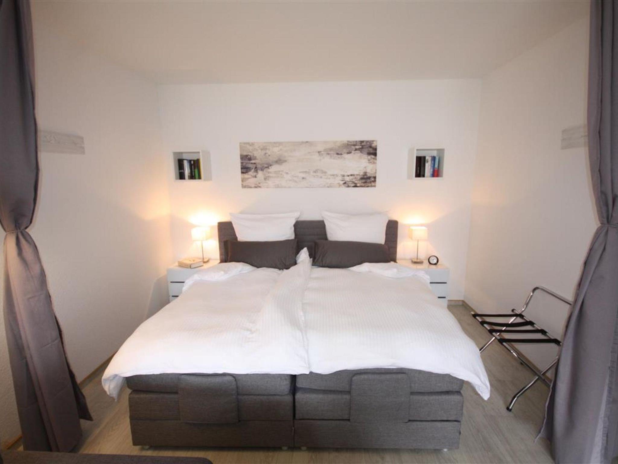 Schlafnische (durch Vorhang abtrennbar) mit Doppelboxspringbett, Sofa, Couchtisch, Flat-TV, Blu-Ray-Player, Spielekonsole und CD-Radio