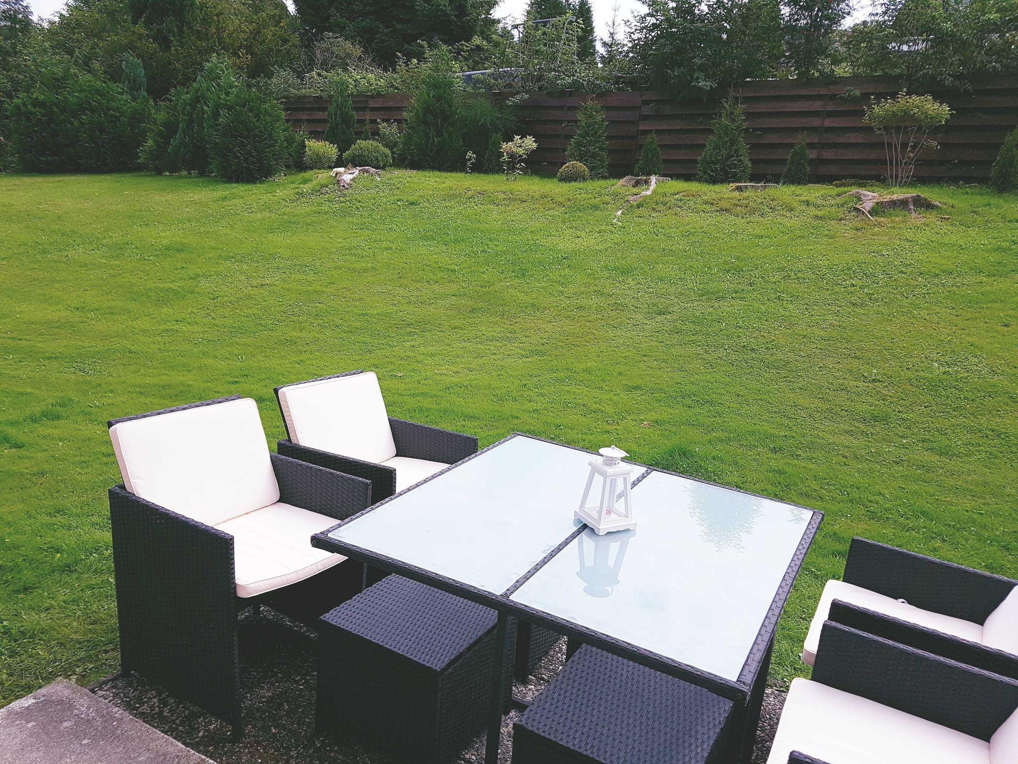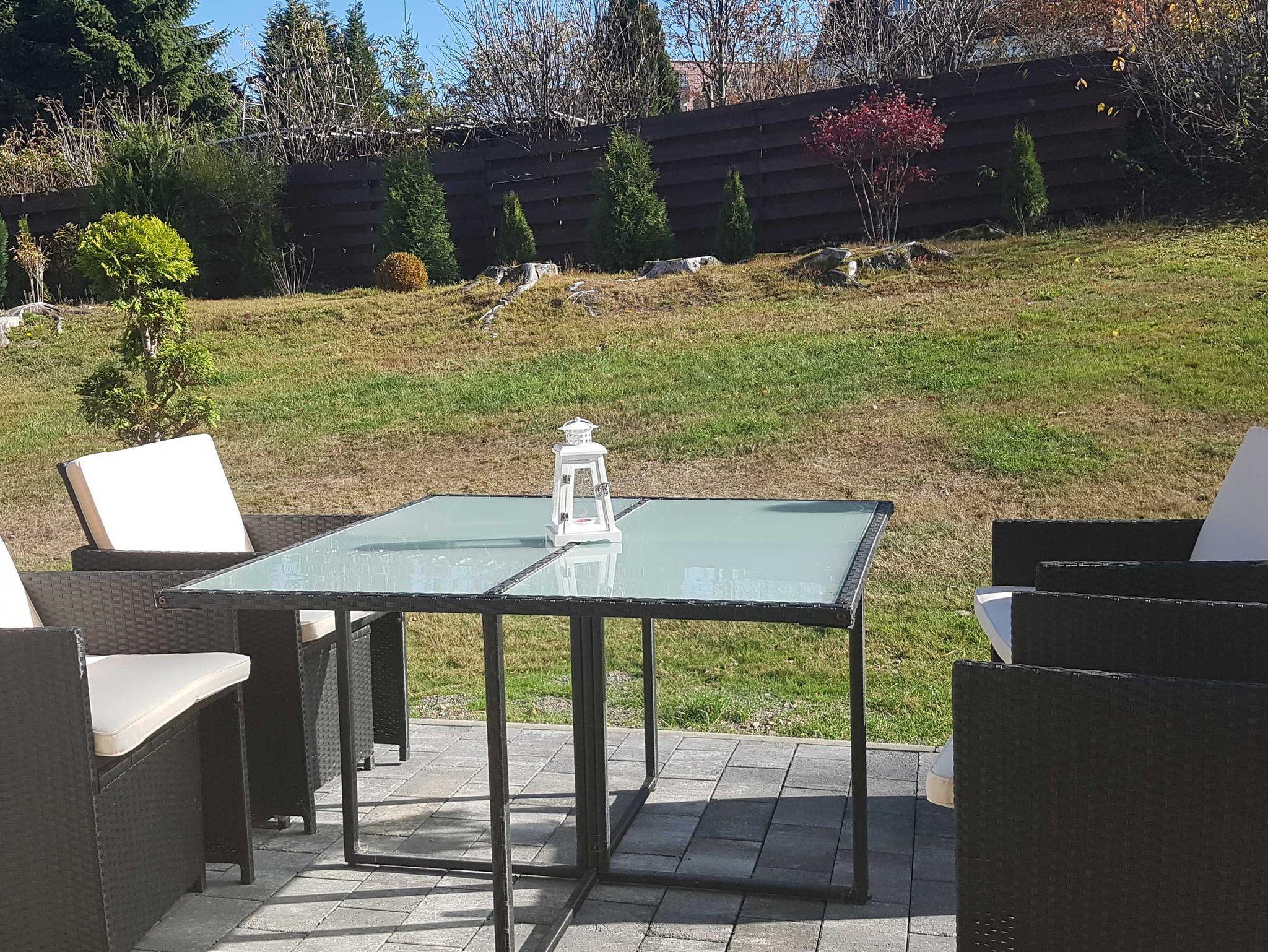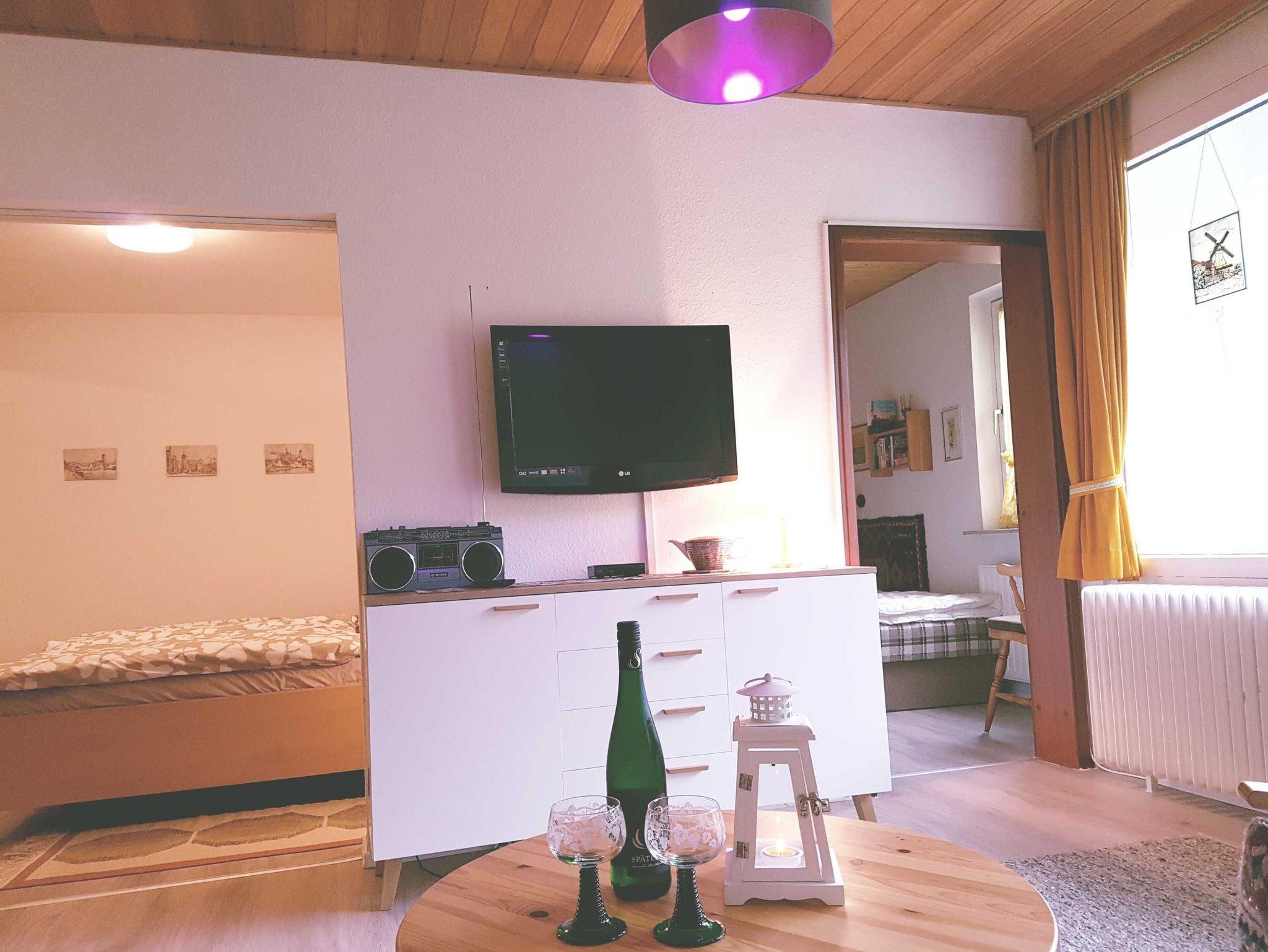 Die Ausstattung der Ferienwohnung Kleine Hexe ist gemütlich und zweckmäßig. Die Küche verfügt über einen Backofen, Herdplatten, eine Kaffeemaschine, einen Wasserkocher, eine Spüle, einen Toaster sowie auch eine Dolce Gusto Kaffemaschine. Das Bad ist mit WC, Dusche und Waschbecken ausgestattet außerdem ist ein Haarfön und ein Spiegelschrank vorhanden. Im Wohnbereich befindet sich ein Flachbildfernseher mit SAT-TV, eine gemütliche Essecke sowie auch ein Radio und eine gemütliche Sitzecke mit einem Schlafsofa. Vom Wohnbereich kommt man auf die nach Süden ausgerichtete Terasse. Das Schlafzimmer mit Doppelbett und großem Spiegelschrank ist durch einen Vorhang vom Wohnbereich getrennt. Das Kinderzimmer bzw. Zweibettzimmer ist mit einer Tür vom Wohnbereich getrennt. Weiterhin beinhaltet die Ferienwohnung einen Hochstuhl und ein Babyreisebett für die kleinen Gäste.