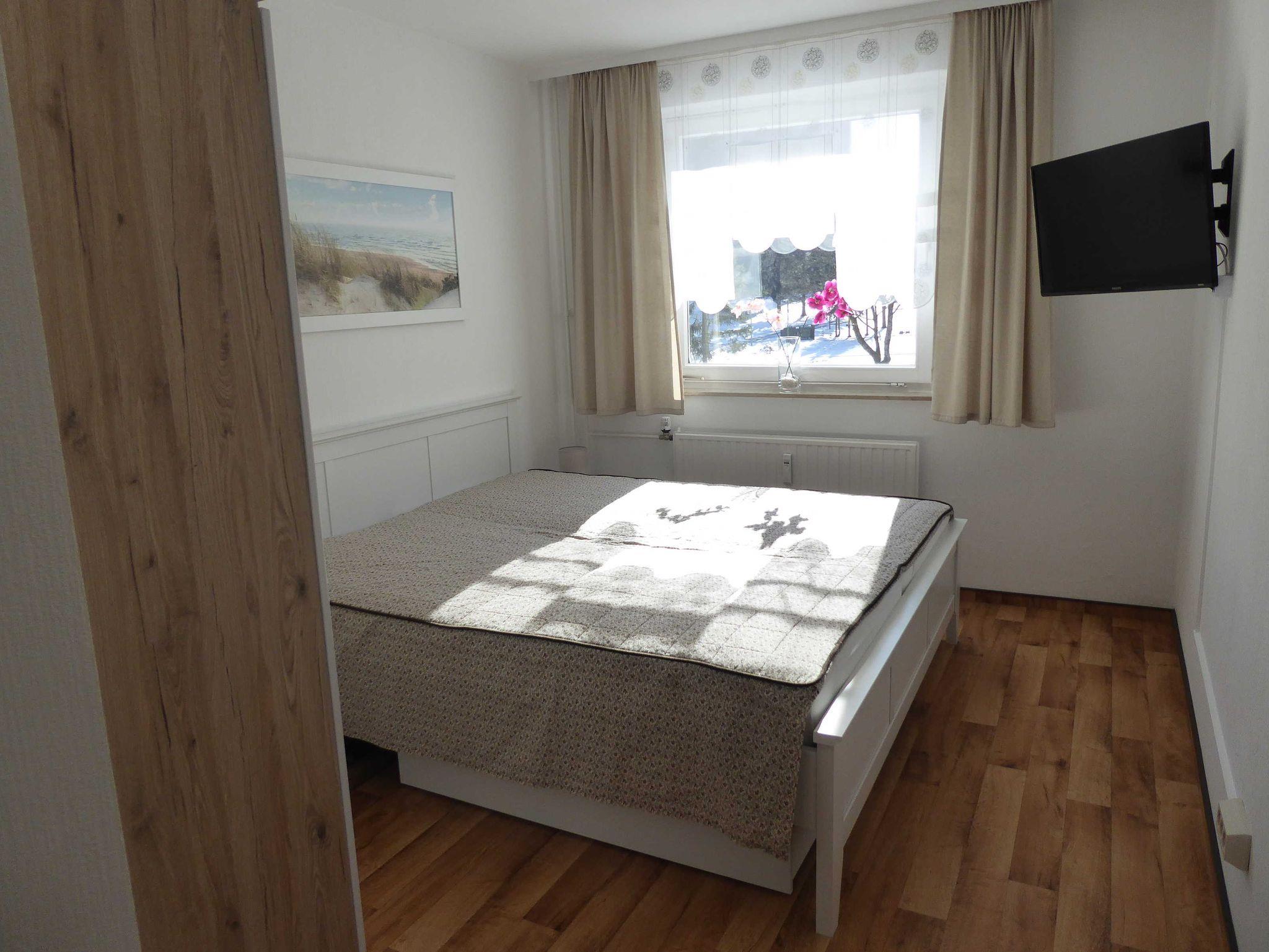 Ein offenes Schlafzimmer mit einem Doppelbett 1,80 x 2,00 m