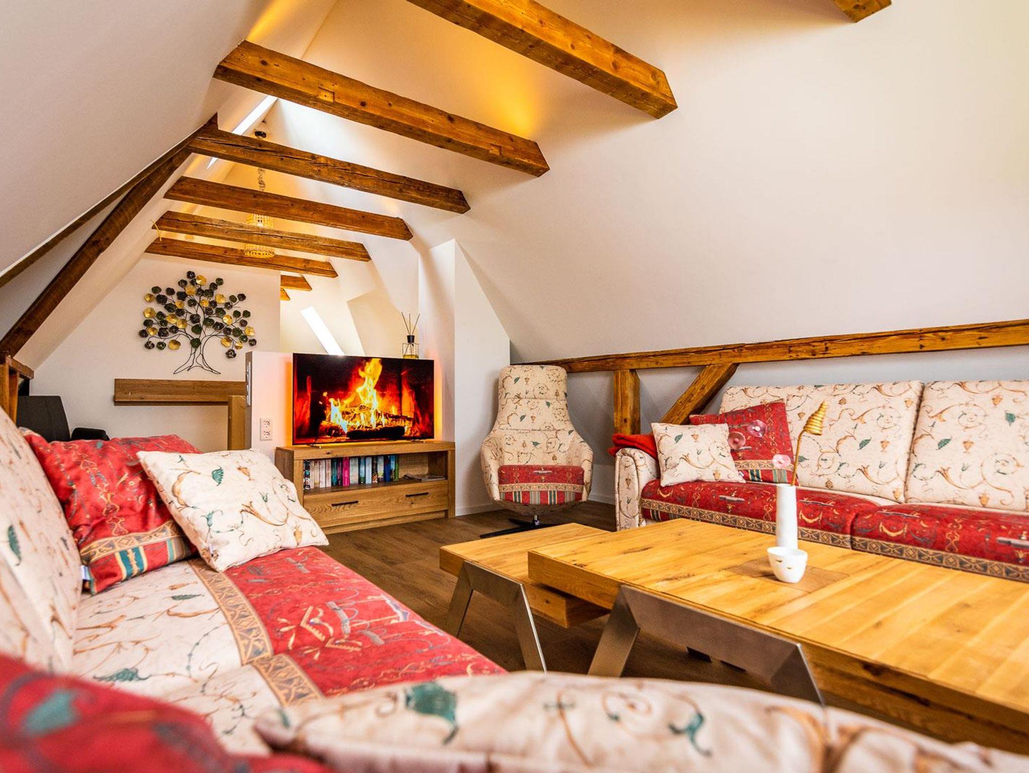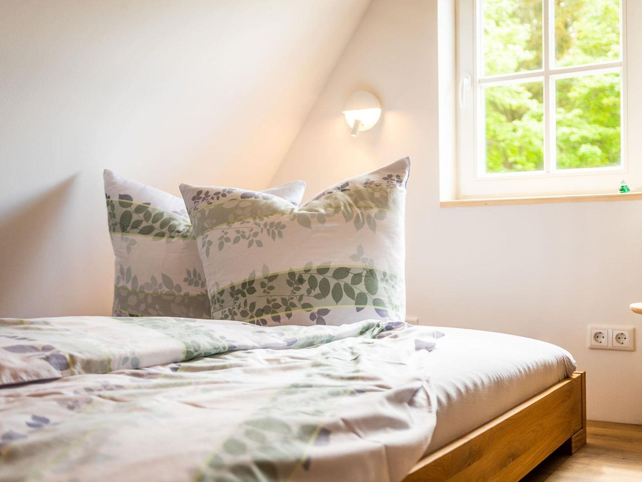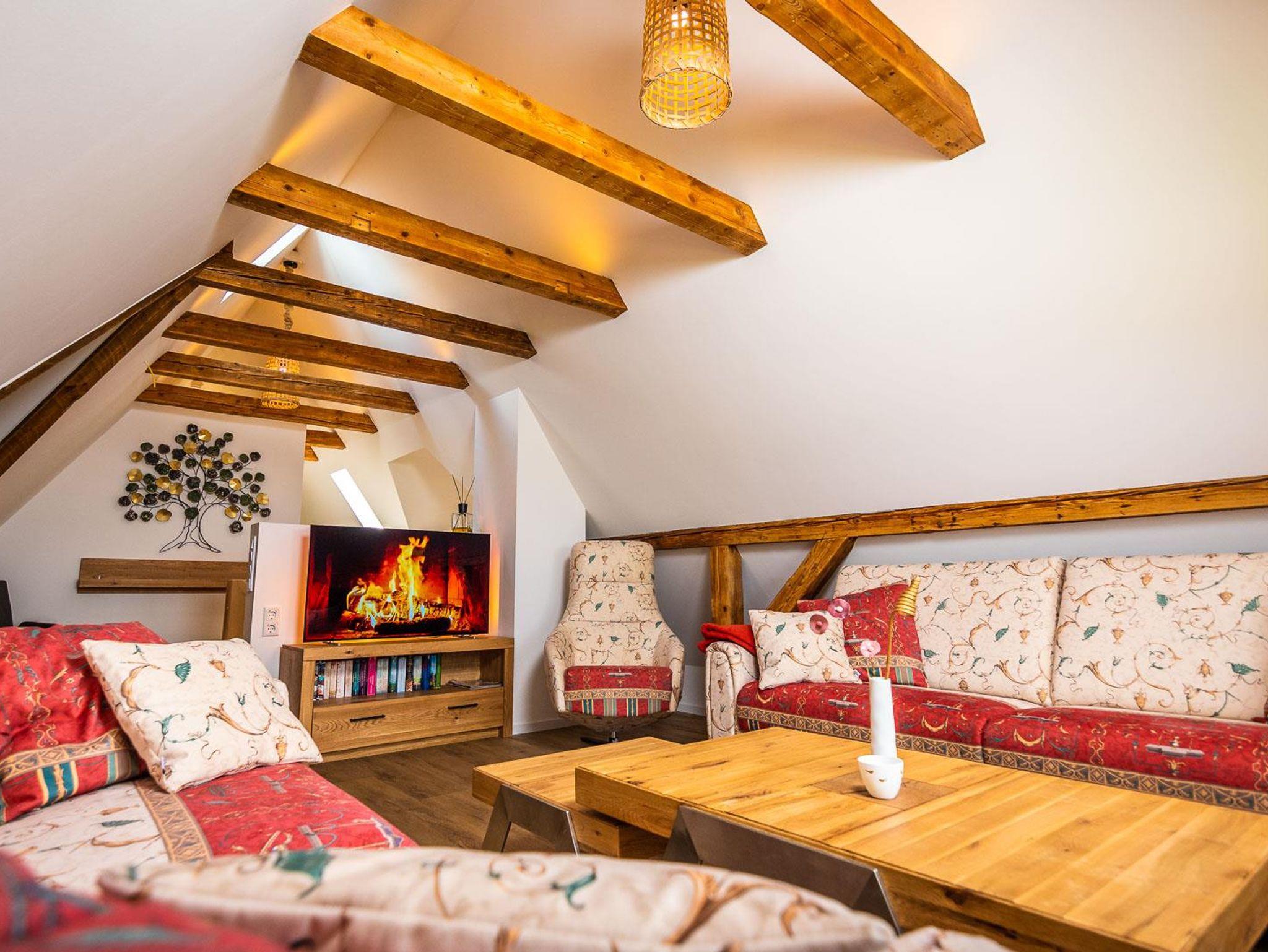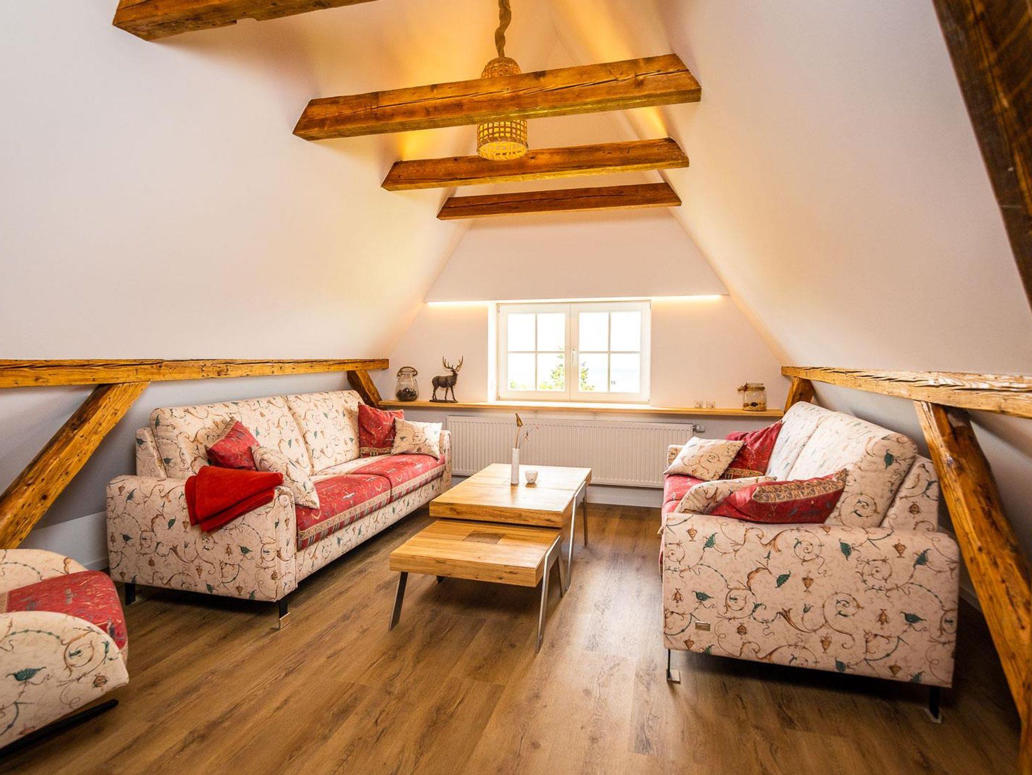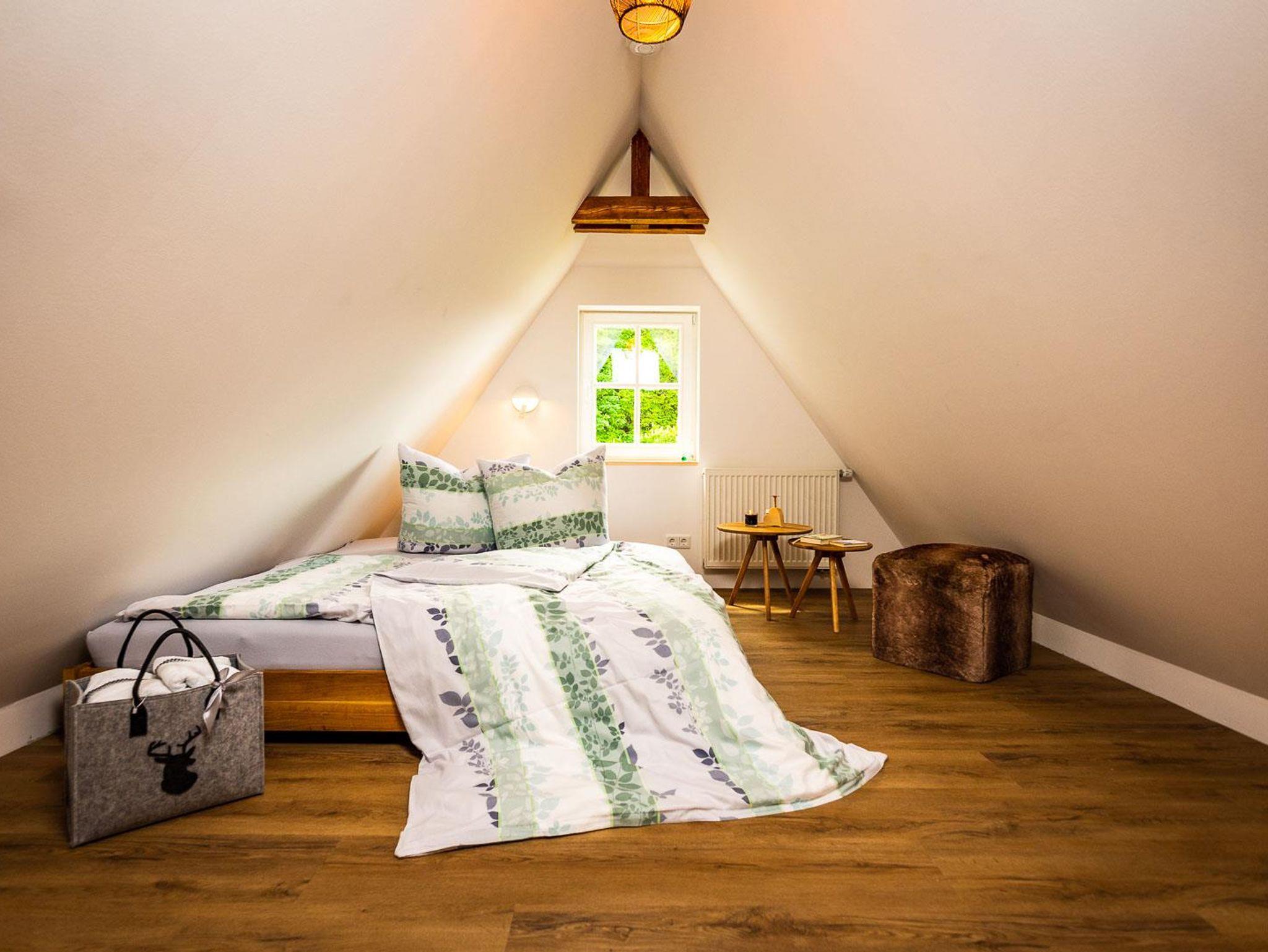 Die neue Ferienwohnung entstand 2022 durch Instandsetzung der Räume im Dachgeschoss. Das Ergebnis ist ein attraktives Appartment mit 95 qm Größe, welches durch einen eigenen Flur in der 1. Etage betreten wird. Von dort erreicht man das Dachgeschoss, indem ein großzügiger und offener Wohnbereich (nach Norden) und die Küche mit hochwertiger Einbauküche und Speisebereich (nach Süden, Vollausstattung) aufwartet. Ergänzt durch zwei Schlafbereiche (1 x Doppelbett nach Westen; 2 Einzelbetten sowie eine Aufbettung nach Osten - keine Türen), sowie das Badezimmer. Bis in die Dachspitze durchdacht unser herrliches Urlaubs- oder eben Himmelreich!?