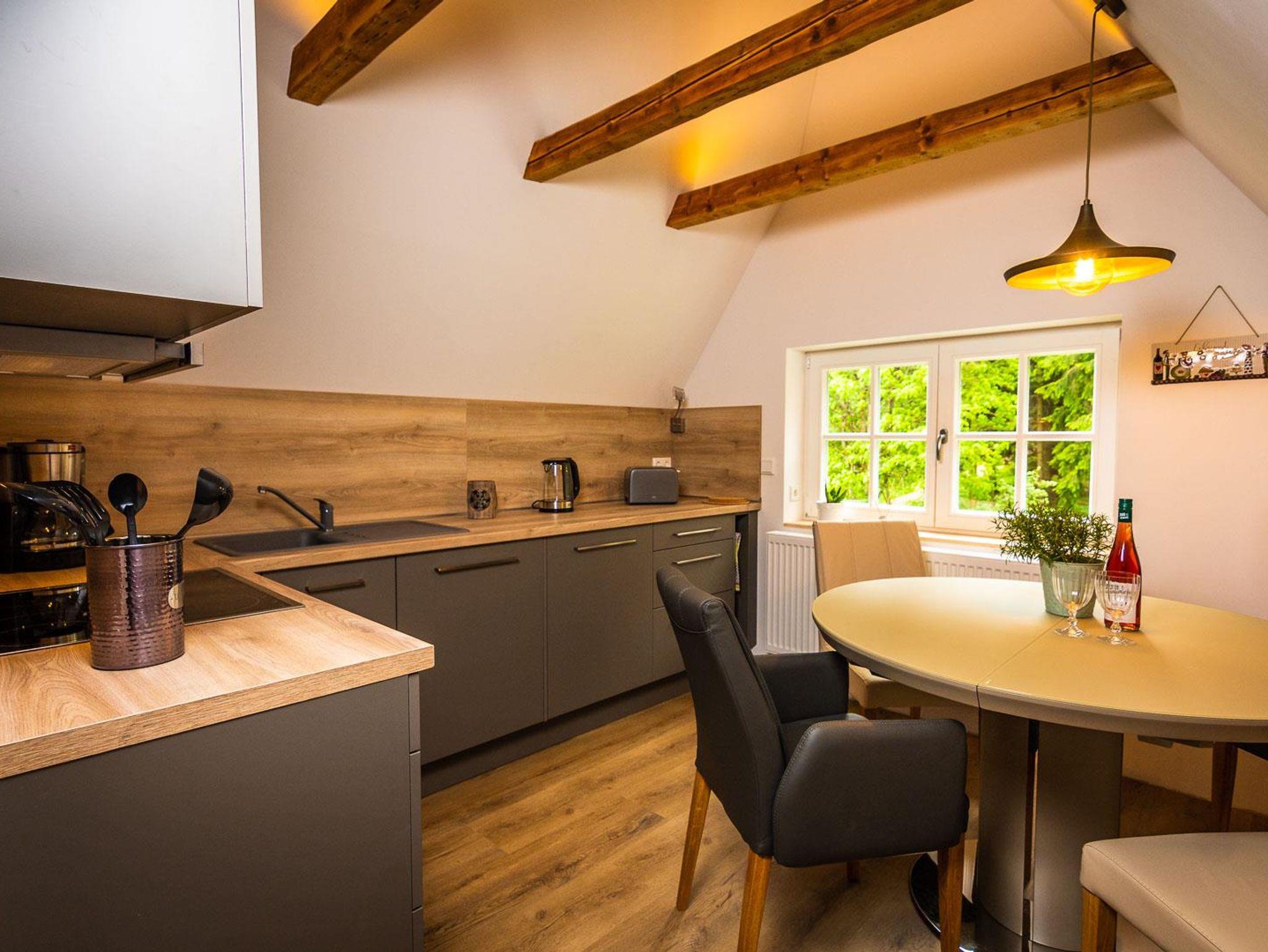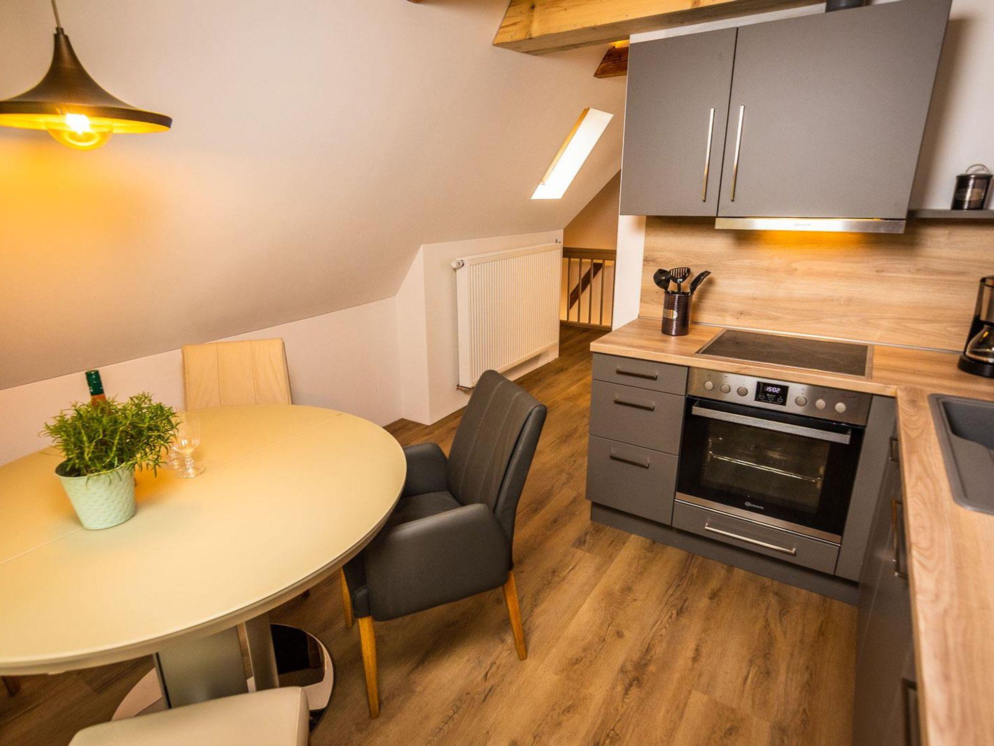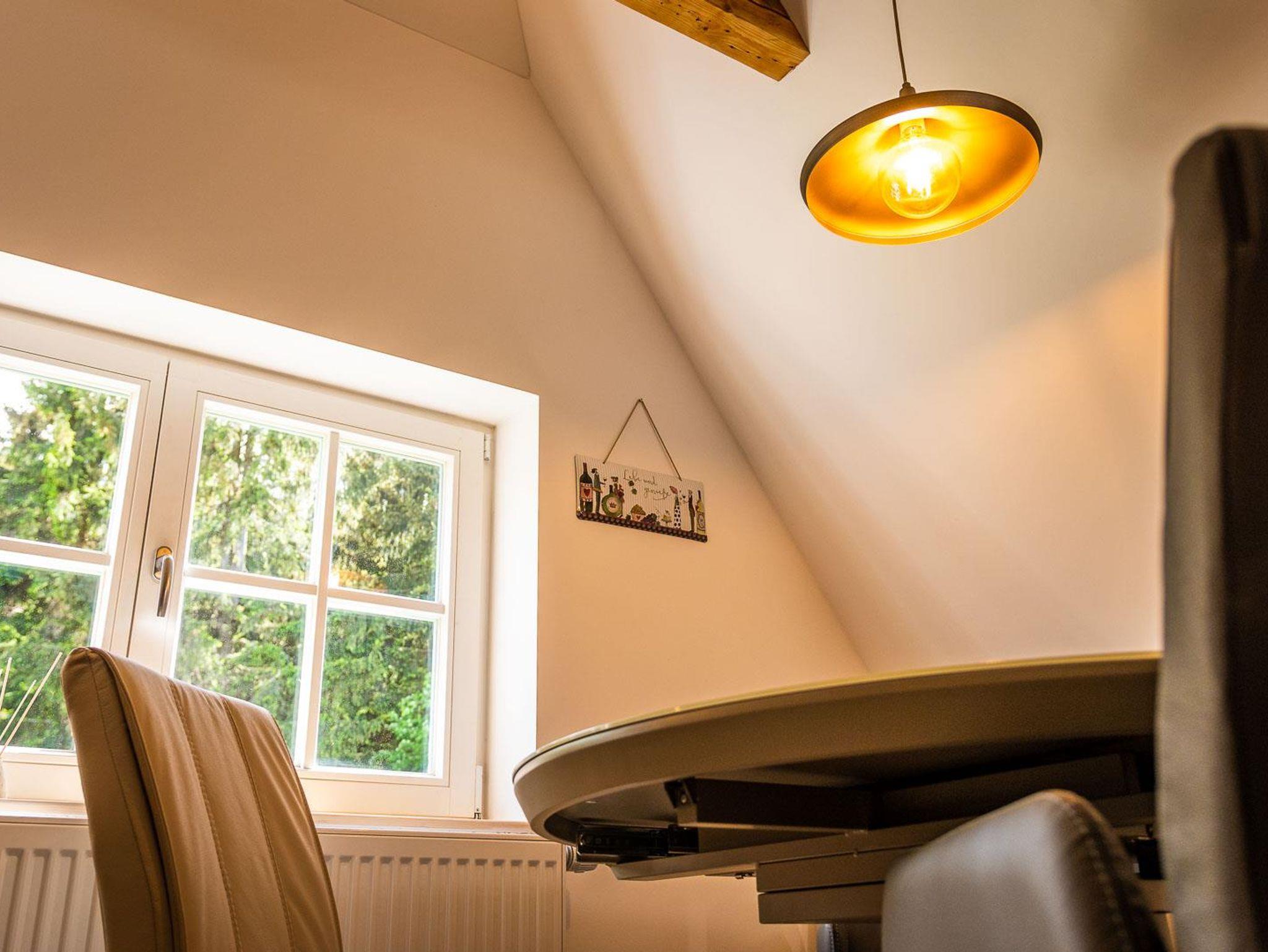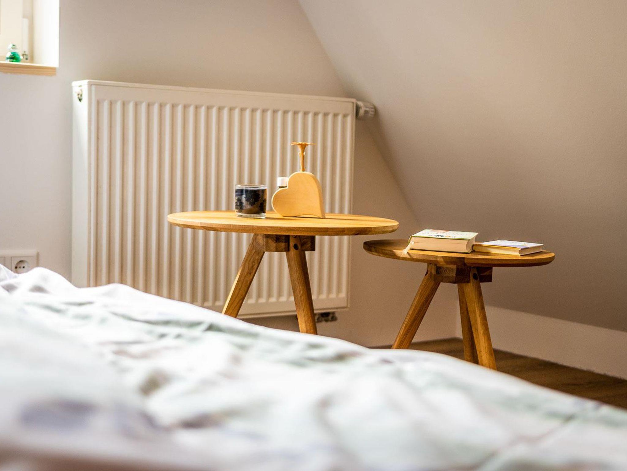 Die neue Ferienwohnung entstand 2022 durch Instandsetzung der Räume im Dachgeschoss. Das Ergebnis ist ein attraktives Appartment mit 95 qm Größe, welches durch einen eigenen Flur in der 1. Etage betreten wird. Von dort erreicht man das Dachgeschoss, indem ein großzügiger und offener Wohnbereich (nach Norden) und die Küche mit hochwertiger Einbauküche und Speisebereich (nach Süden, Vollausstattung) aufwartet. Ergänzt durch zwei Schlafbereiche (1 x Doppelbett nach Westen; 2 Einzelbetten sowie eine Aufbettung nach Osten - keine Türen), sowie das Badezimmer. Bis in die Dachspitze durchdacht unser herrliches Urlaubs- oder eben Himmelreich!?
