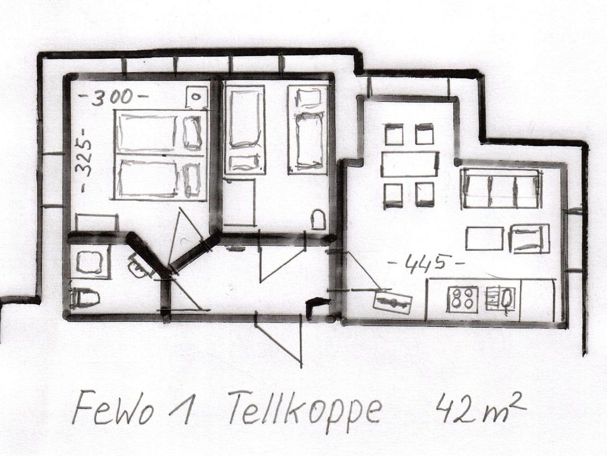 Die Ferienwohnung 1 Tellkoppe (4 Sterne DTV), Größe ca. 42 m², befindet sich im Erdgeschoss (Hochparterre) mit separatem Eingang und verfügt über zwei getrennte Schlafräume, einen Wohnraum mit Küchenzeile, DU/WC, Korridor und ist geeignet bis zu 4 Personen.