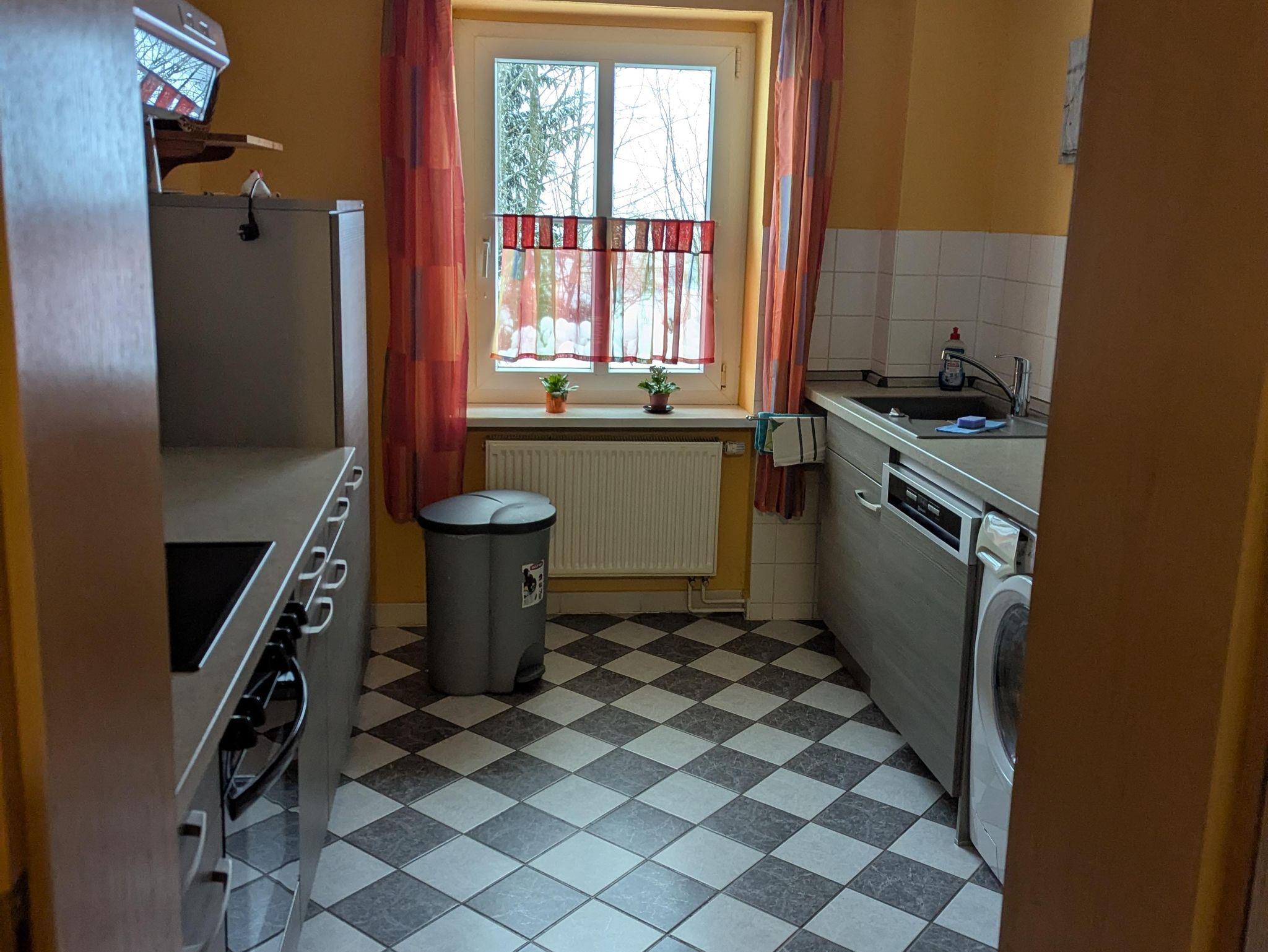 In der modern eingerichtete Küche finden Sie den Ceranherd mit Backofen, Kühlschrank mit Gefrierfach, Kaffeemaschine, Mikrowelle, Toaster und Geschirrspüler sowie eine Waschmaschine mit Trockner (Waschtrockner).
