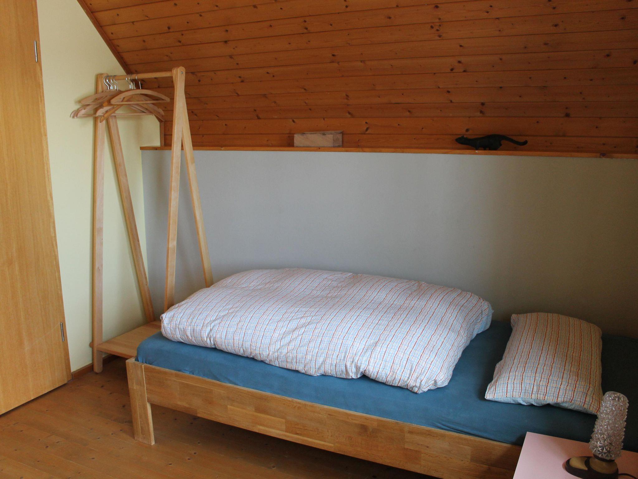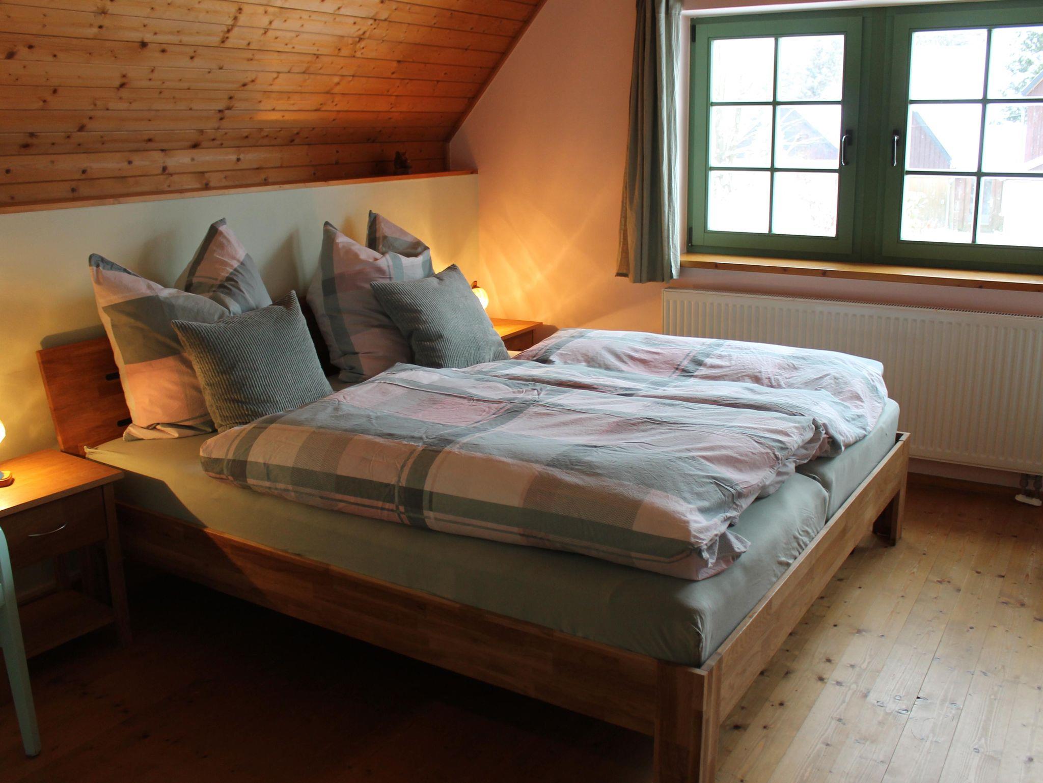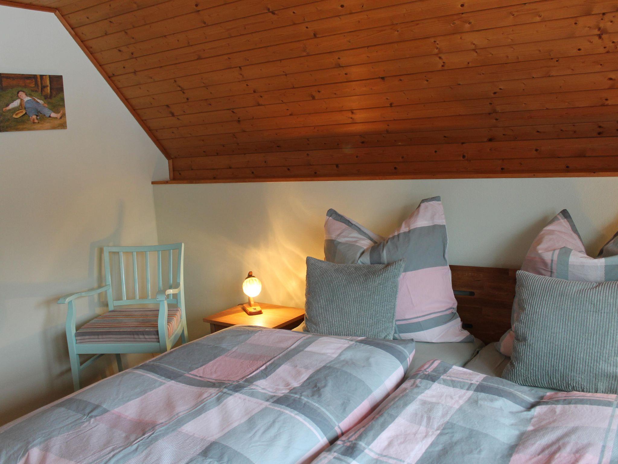 Ein Zimmer ist mit einem großen Doppelbett 1,80 m ausgestattet. Das zweite Zimmer hat ein 1,60 m breites Doppelbett und das kleinste Zimmer hat ein Einzelbett und ein 1,40 m breitet Doppelbett. (2 Decken in Überlänge 155 x 220 cm vorhanden) Ein Babybett und weitere Kleinkind-Utensilien stehen auf Anfrage zur Verfügung. Im Dachgeschoss befinden sich neben einem weiten Schlafplatz ein kleiner Schreibtisch und eine Couch.