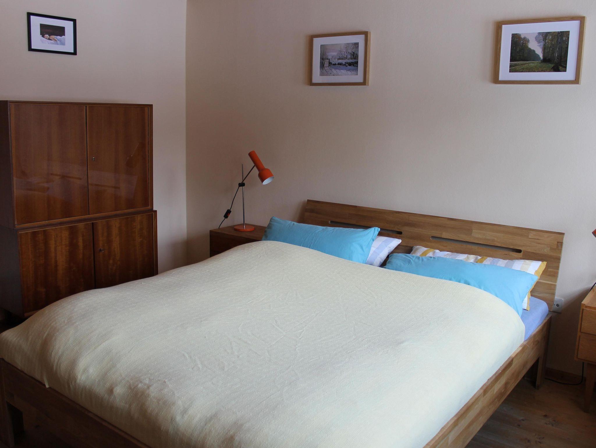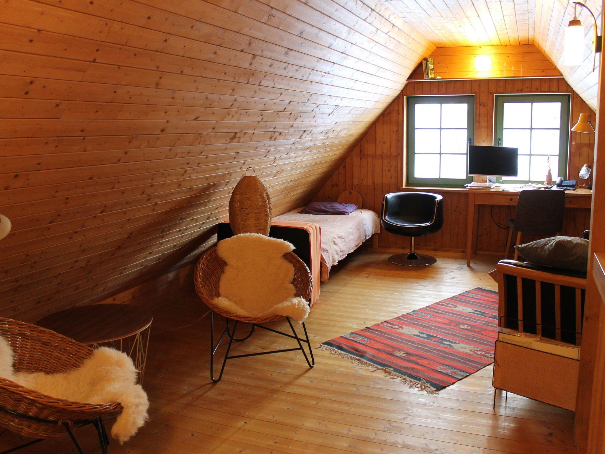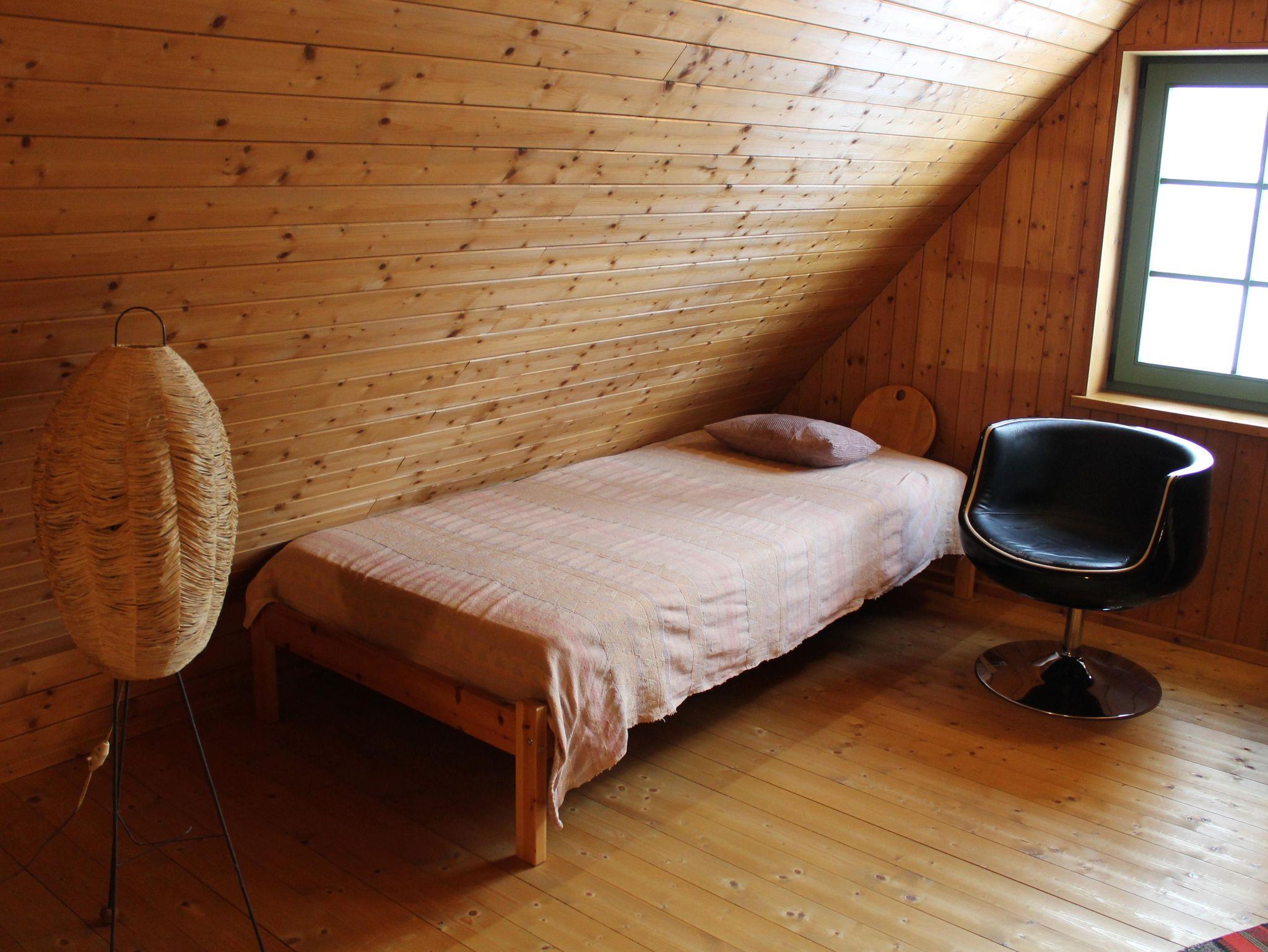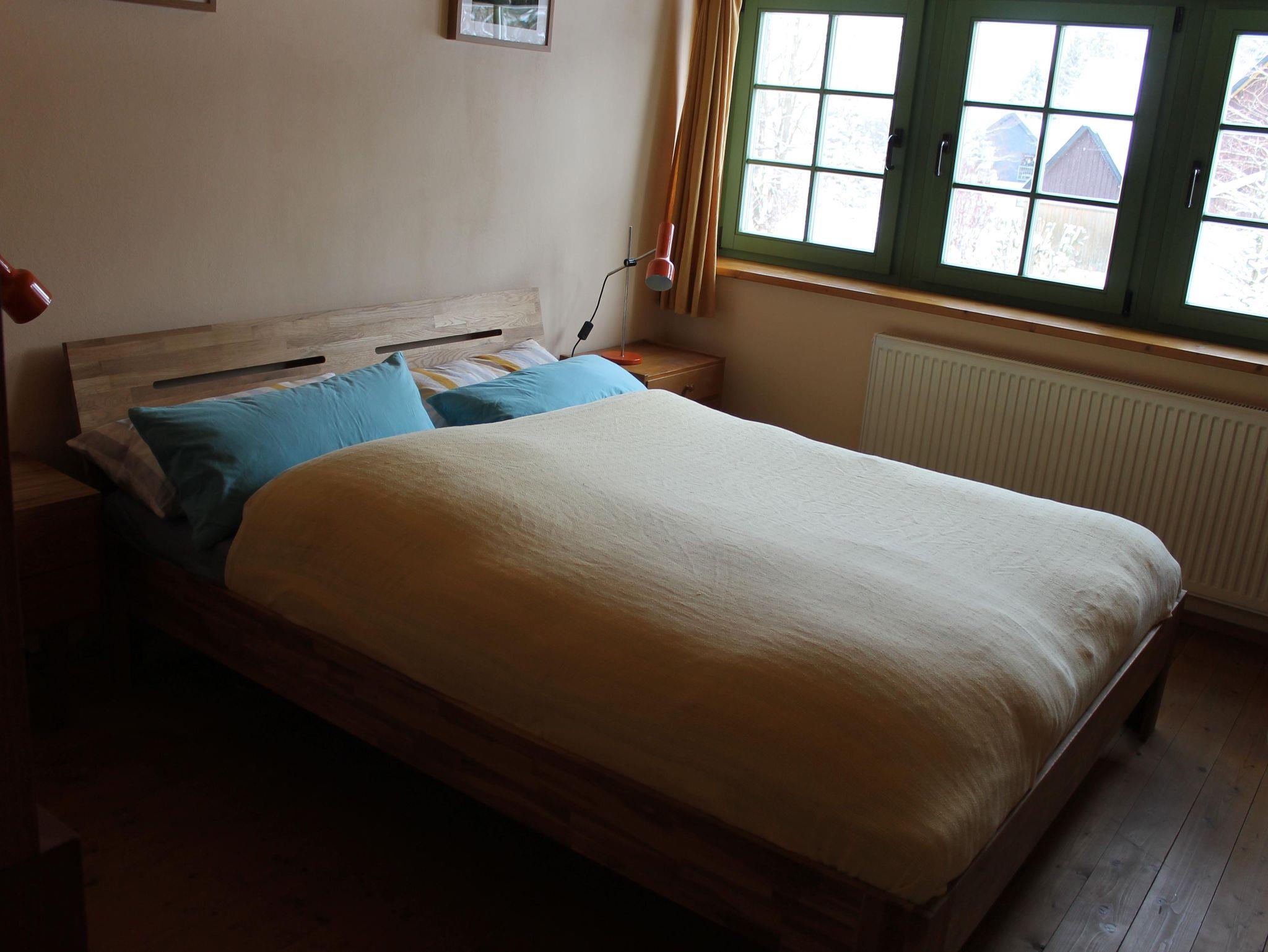 Ein Zimmer ist mit einem großen Doppelbett 1,80 m ausgestattet. Das zweite Zimmer hat ein 1,60 m breites Doppelbett und das kleinste Zimmer hat ein Einzelbett und ein 1,40 m breitet Doppelbett. (2 Decken in Überlänge 155 x 220 cm vorhanden) Ein Babybett und weitere Kleinkind-Utensilien stehen auf Anfrage zur Verfügung. Im Dachgeschoss befinden sich neben einem weiten Schlafplatz ein kleiner Schreibtisch und eine Couch.