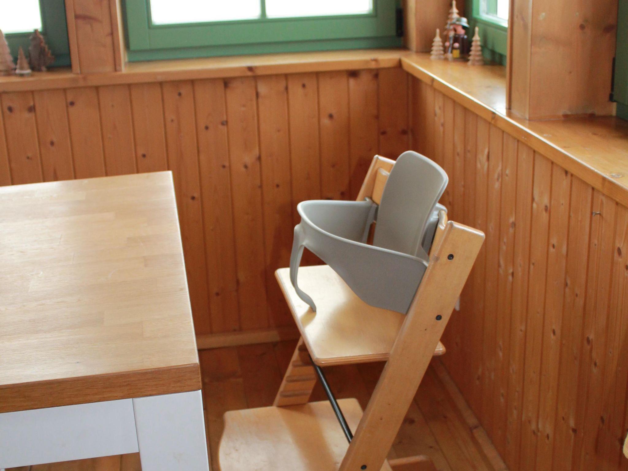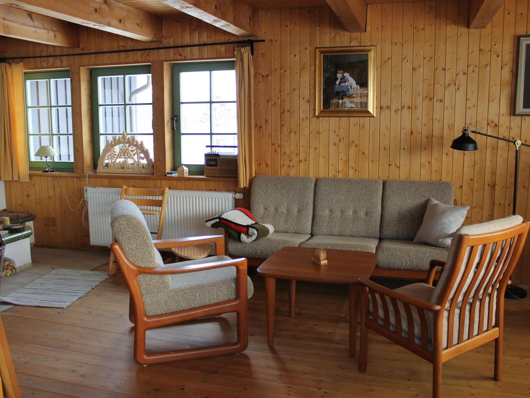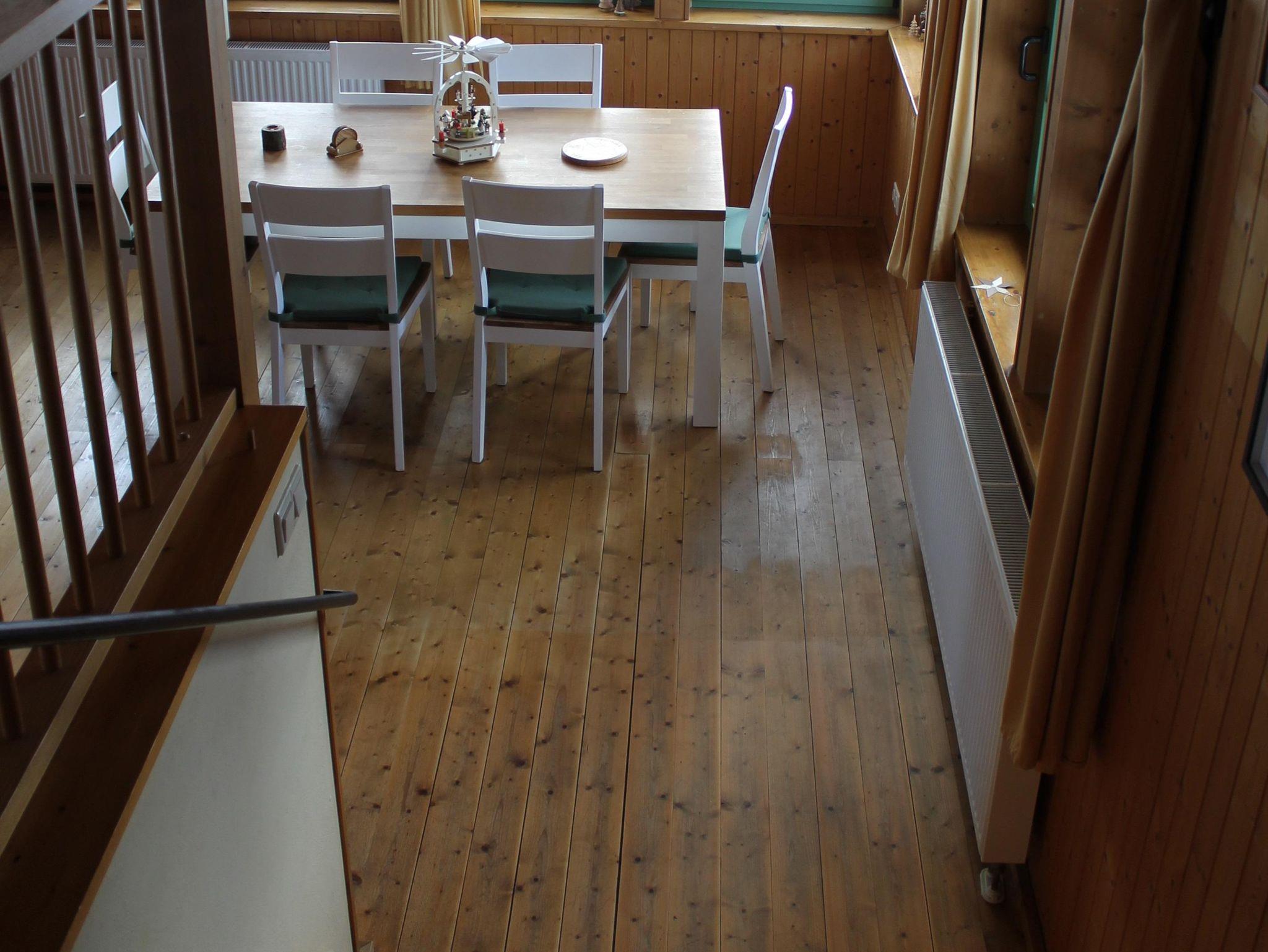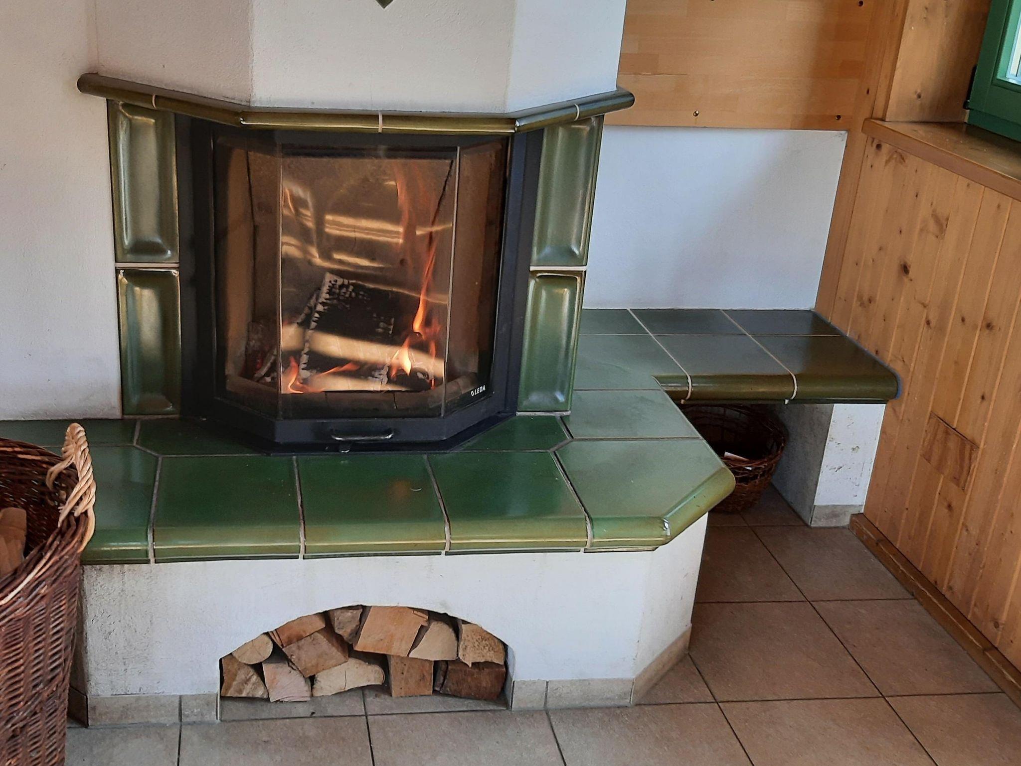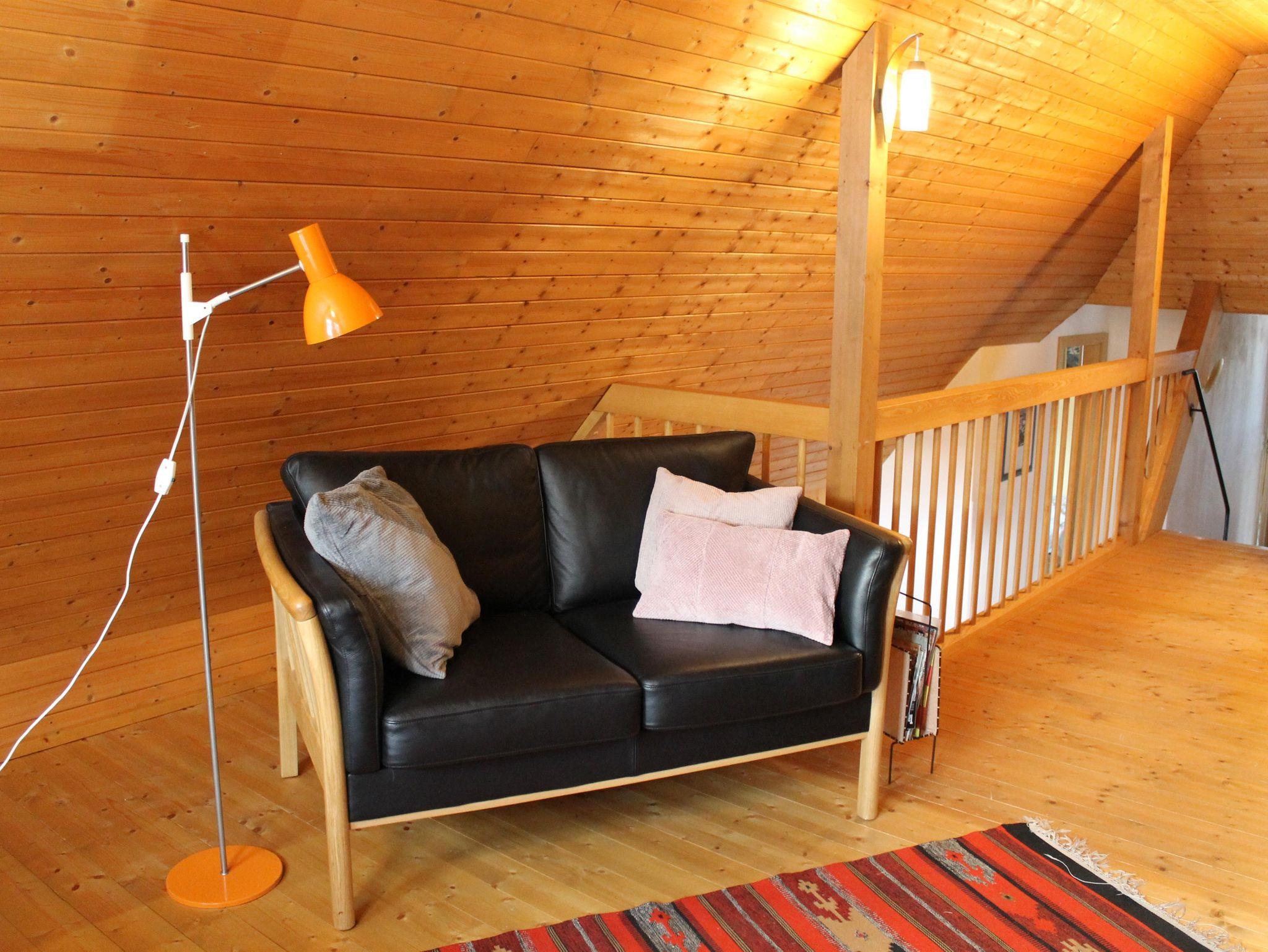 Der Kamin im Wohnzimmer wärmt Wohnzimmer und Obergeschoss. Hier befindet sich auch der große Esstisch, an dem bis zu 10 Personen bequem Platz haben.