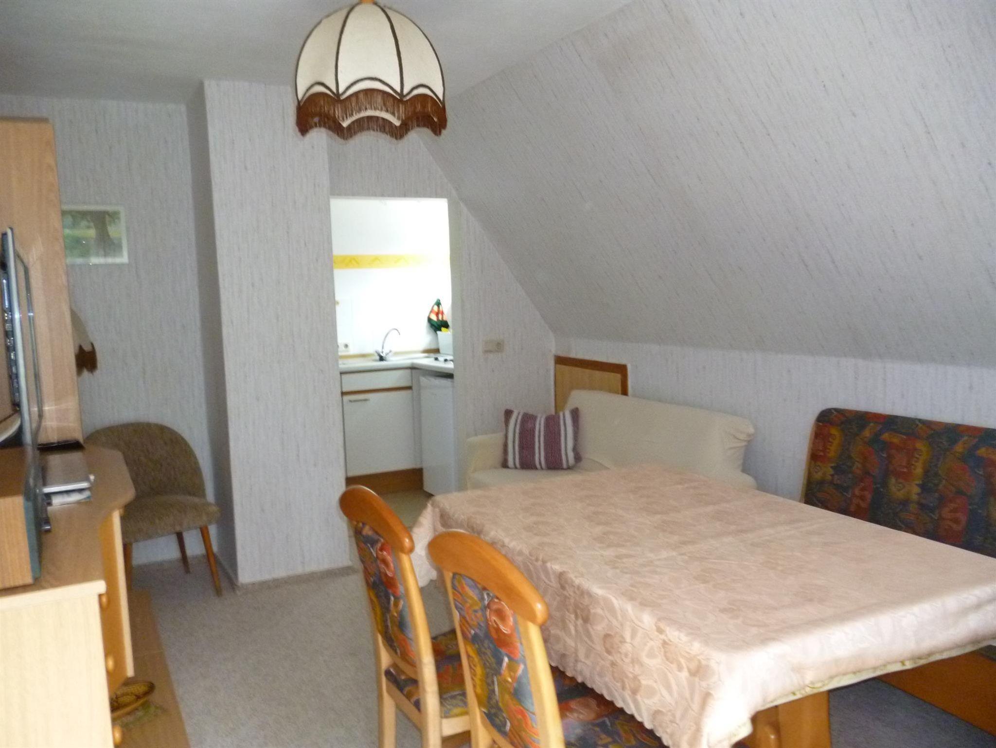 Fewo 2 mit Balkon für 2 - 3 Personen, mit Schlafraum (Doppelbett und Schlafcouch 1,20 breit als Aufbettung für Kind), Küche, Wohnraum mit grosssem Essplatz, Dusche / WC, TV, Radio,