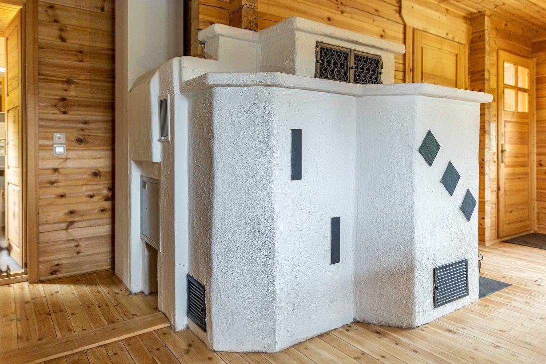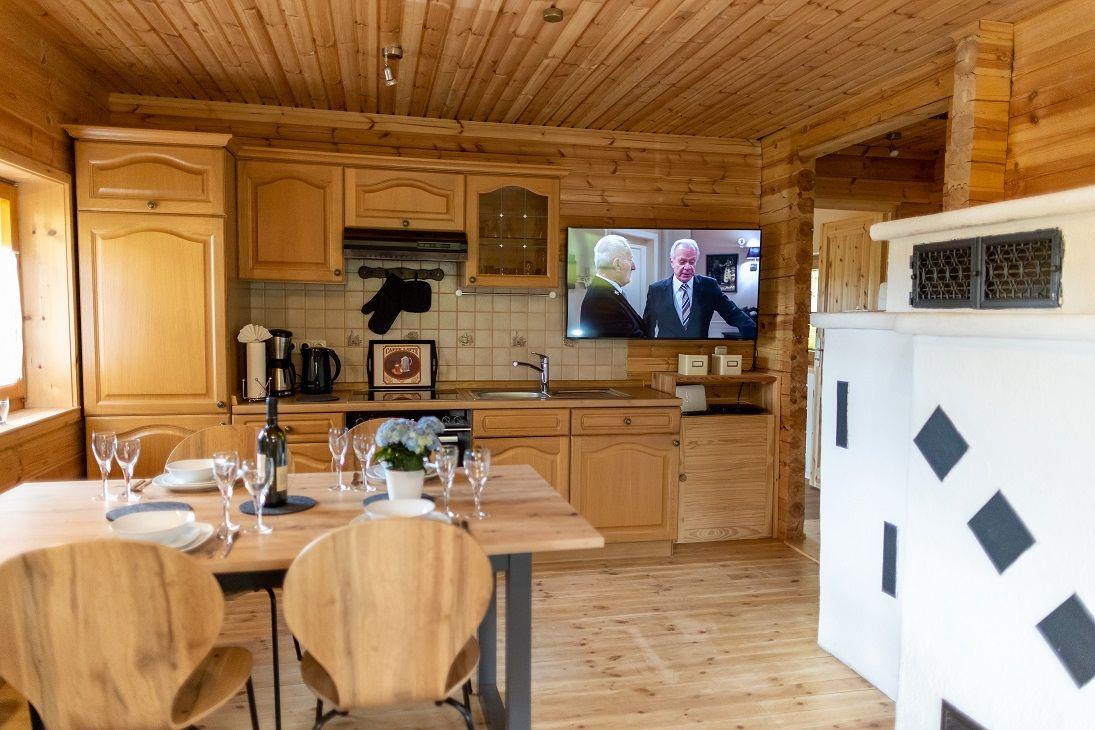 Der Wohn-, Koch- und Essbereich verfügt über eine bequeme Sofaecke, ein TV- Gerät, eine rustikale Küchenzeile und einem Essbereich mit 6 Stühlen. Das Zentrum des Ferienhauses bildet der sehr schöne Ofen. Er spendet in den kalten Jahreszeit gemütliche Wärme. Das Holz wird kostenlos zur Verfügung gestellt.