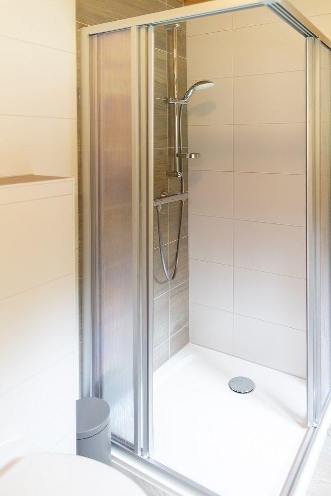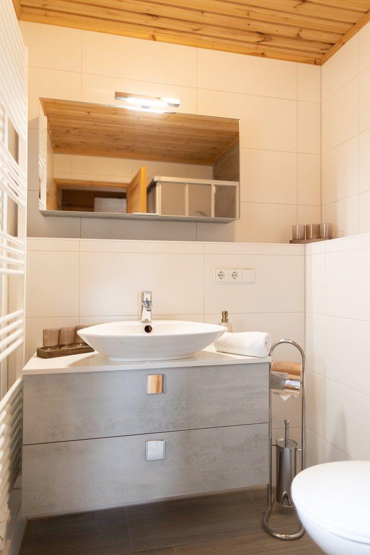 Das Tageslichtbad ist mit einer bodengleichen Dusche, einem Waschbecken, einer Toilette und einem großen Spiegel ausgestattet.