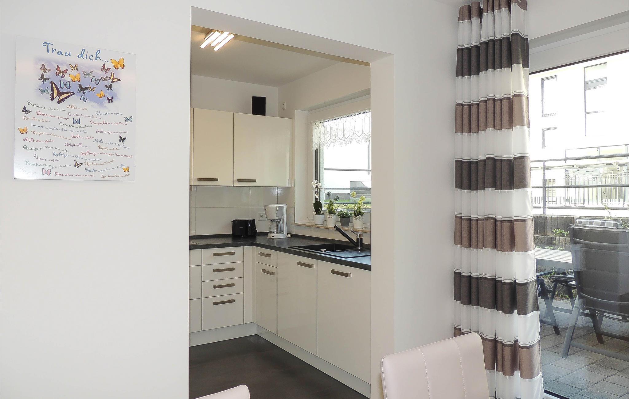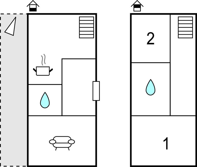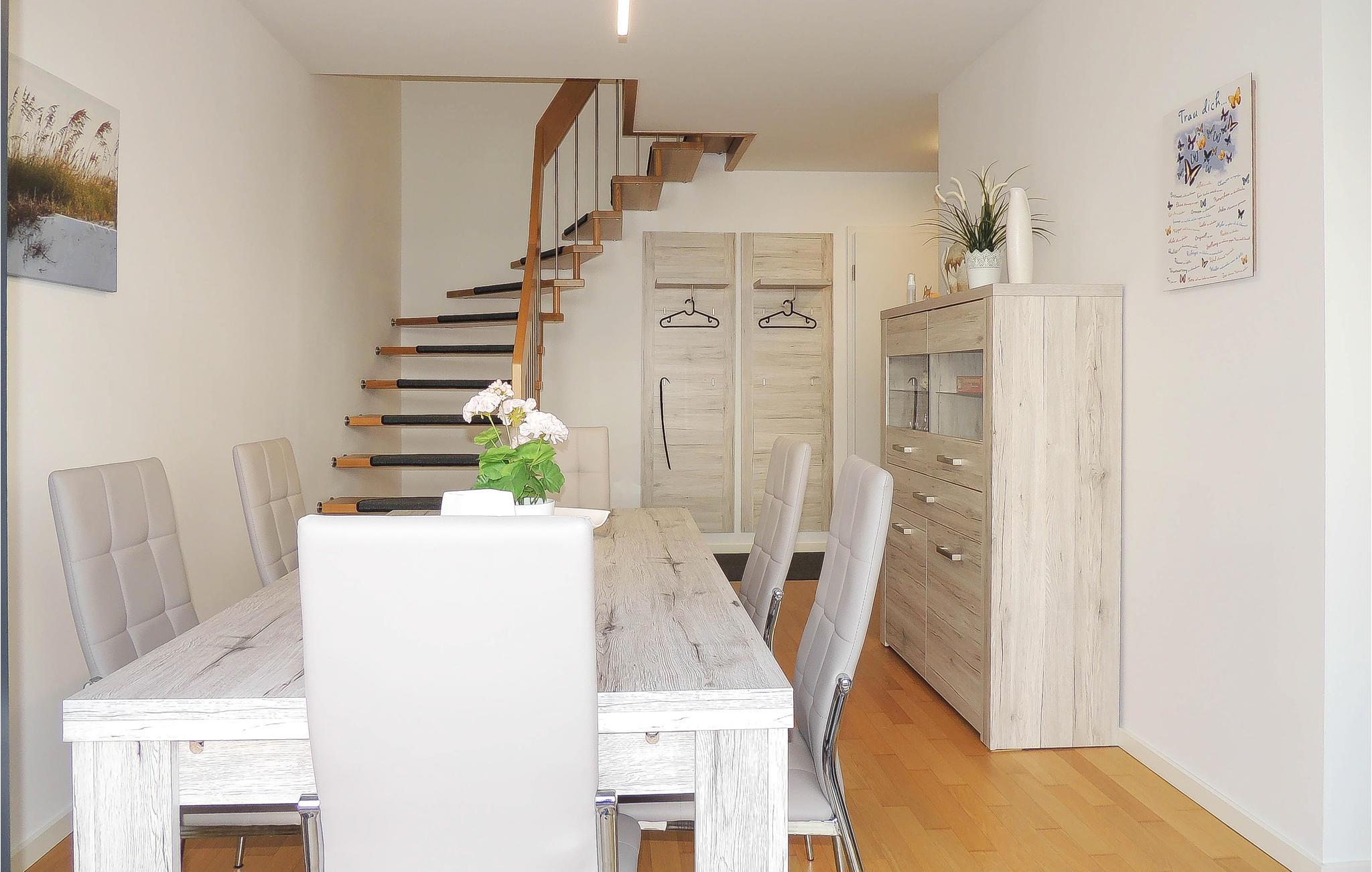Die moderne Küche ist mit allen Annehmlichkeiten ausgestattet. Vom Essbereich aus führt eine Treppe ins obere Stockwerk, indem sich die beiden Schlafzimmer (mit Verdunklungsrollos) und das Badezimmer befinden.