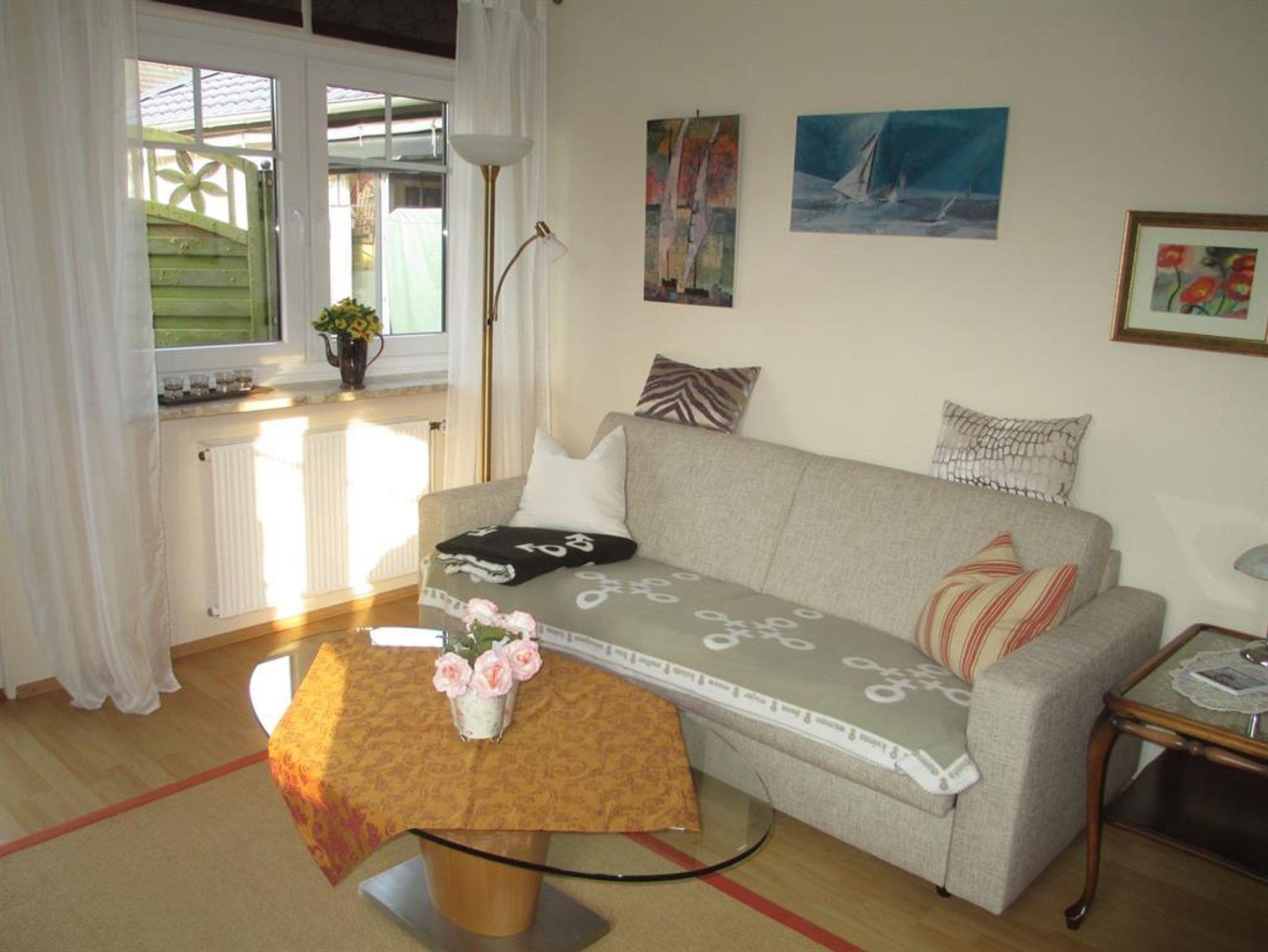 Das Wohnzimmer ist folgendermaßen ausgestattet: CO²-und Rauchmelder, Terrassentür auf ebener Erde, eine Couch, die zur Schlafcouch (2x2 m) umgerüstet werden kann , Sat-TV Flachbildschirm mit Netflix-Programm, 110 cm, Kennwood Stereo-Receiver, DVD/ CD-Player, diverse Spielfilme und Musik-CD's, Brett und Kartenspiele, Leselektüre und Fachliteratur über Schleswig-Holstein u.v.m. Auf der Doppelbettcouch haben 2 Personen ausreichend Platz.