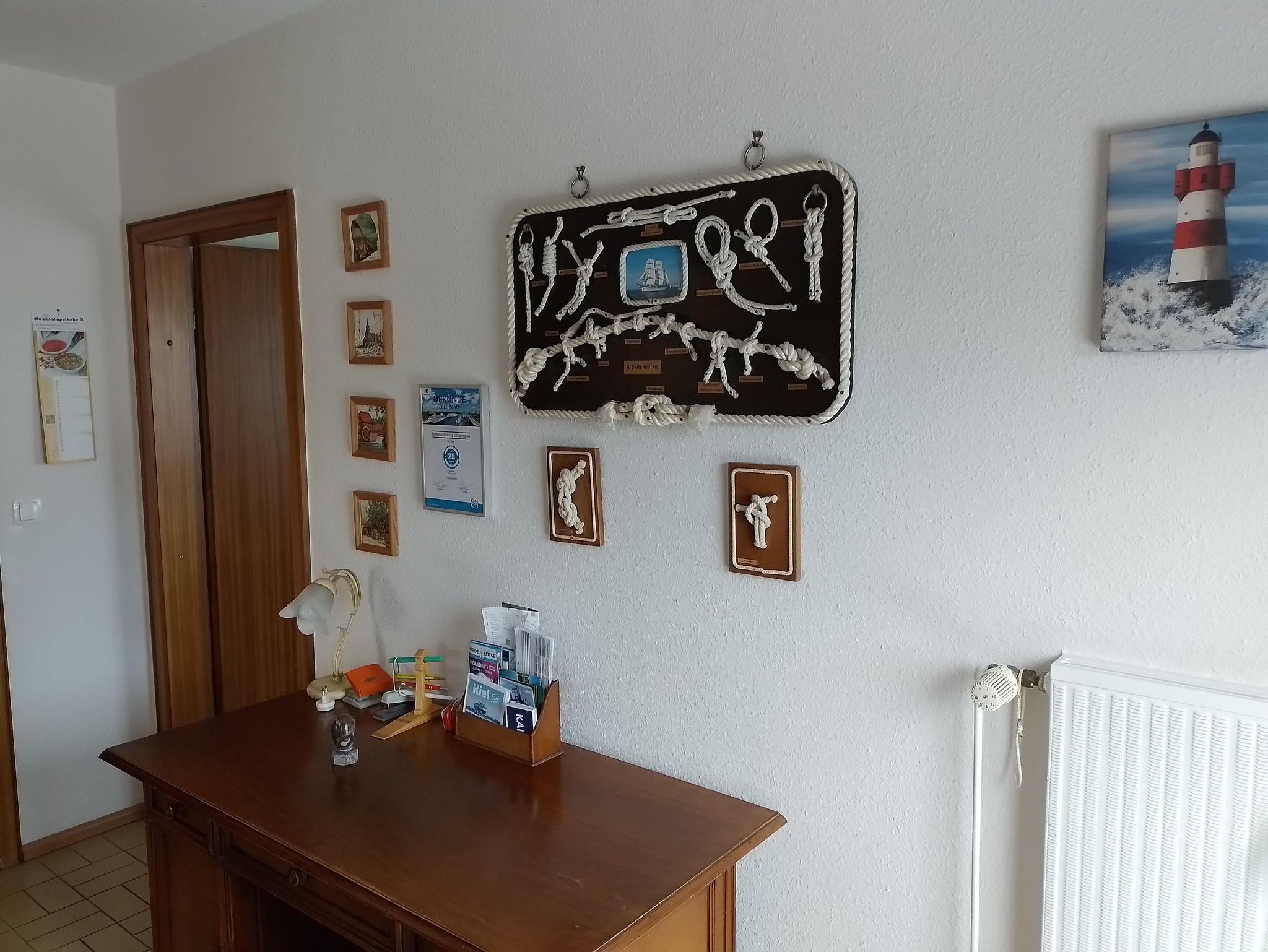 Im Flur sind im Schreibtisch diverse Fahrrad- und Landkarten, Veranstaltungskalender, Fachzeitschriften, Hinweise zu Sehenswürdigkeiten der Region.