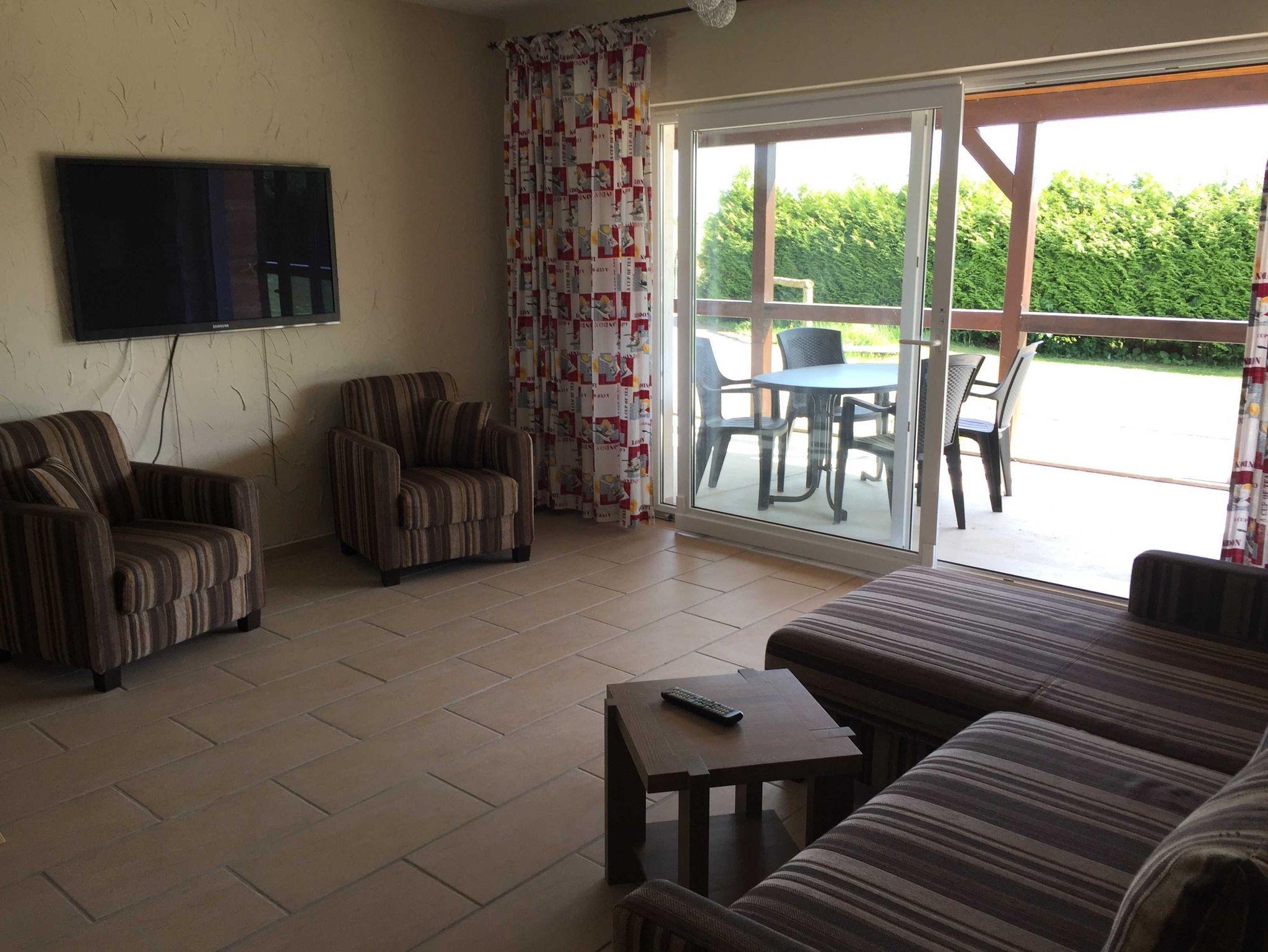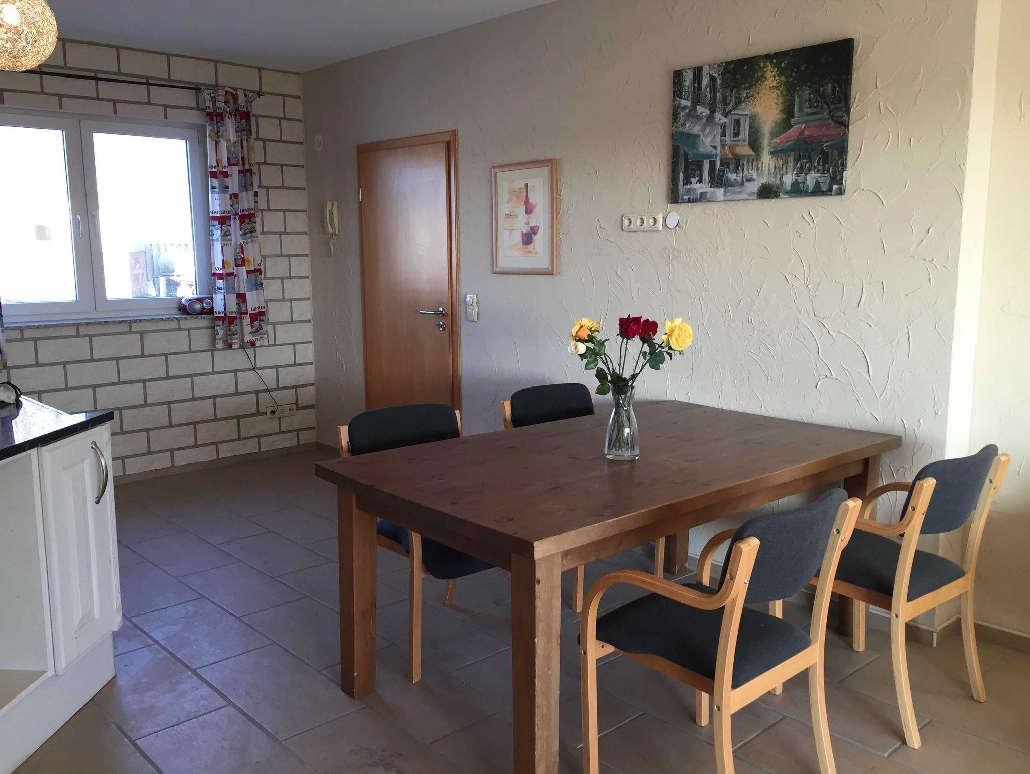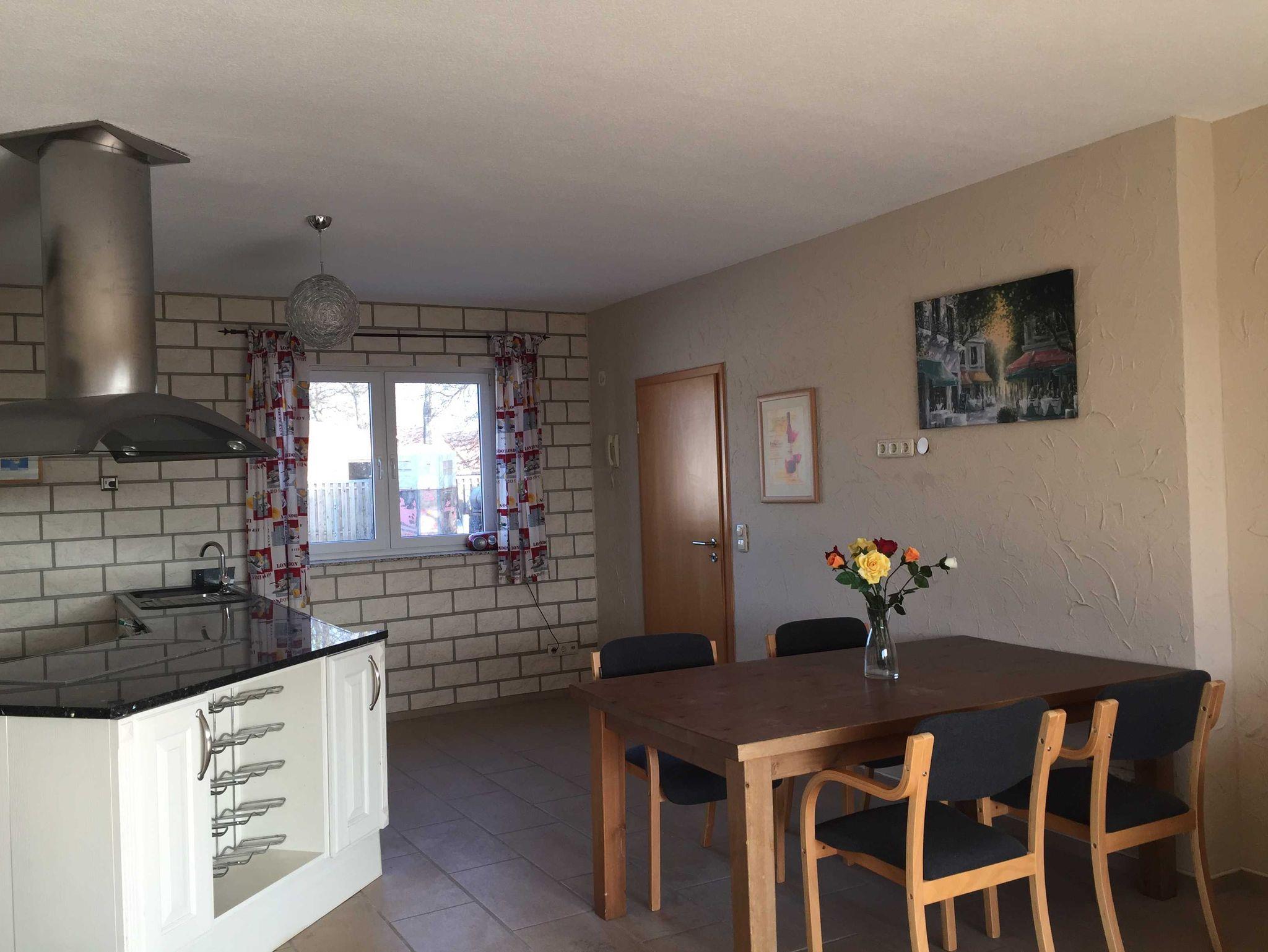 Die Ferienwohnung Star ist für max 6 Personen geeignet und befindet sich ebenerdig, ist 80 m² groß komfortabel und gemütlich ausgestattet: Flur, großer Wohn/ Essraum SAT TV mit Radioempfang, große Fensterfront mit Blick ins Grüne und Zugang zur großen Sonnenterasse mit Gartenmöbeln, und Grillmöglichkeit, eine komplett ausgestattete Einbauküche mit Herd, Cerankochfeld, Kühl-Gefrierkombination, Geschirrspüler, Mikrowelle, Kaffeemaschine für Filterkaffee und eine Tassimo Kaffemaschine, Toaster, Wasserkocher, Essecke, 1.Schlafzimmer mit Doppelbett, 2. Schlafzimmer mit Doppelstockbett, Bad mit Waschbecken Dusche und WC.