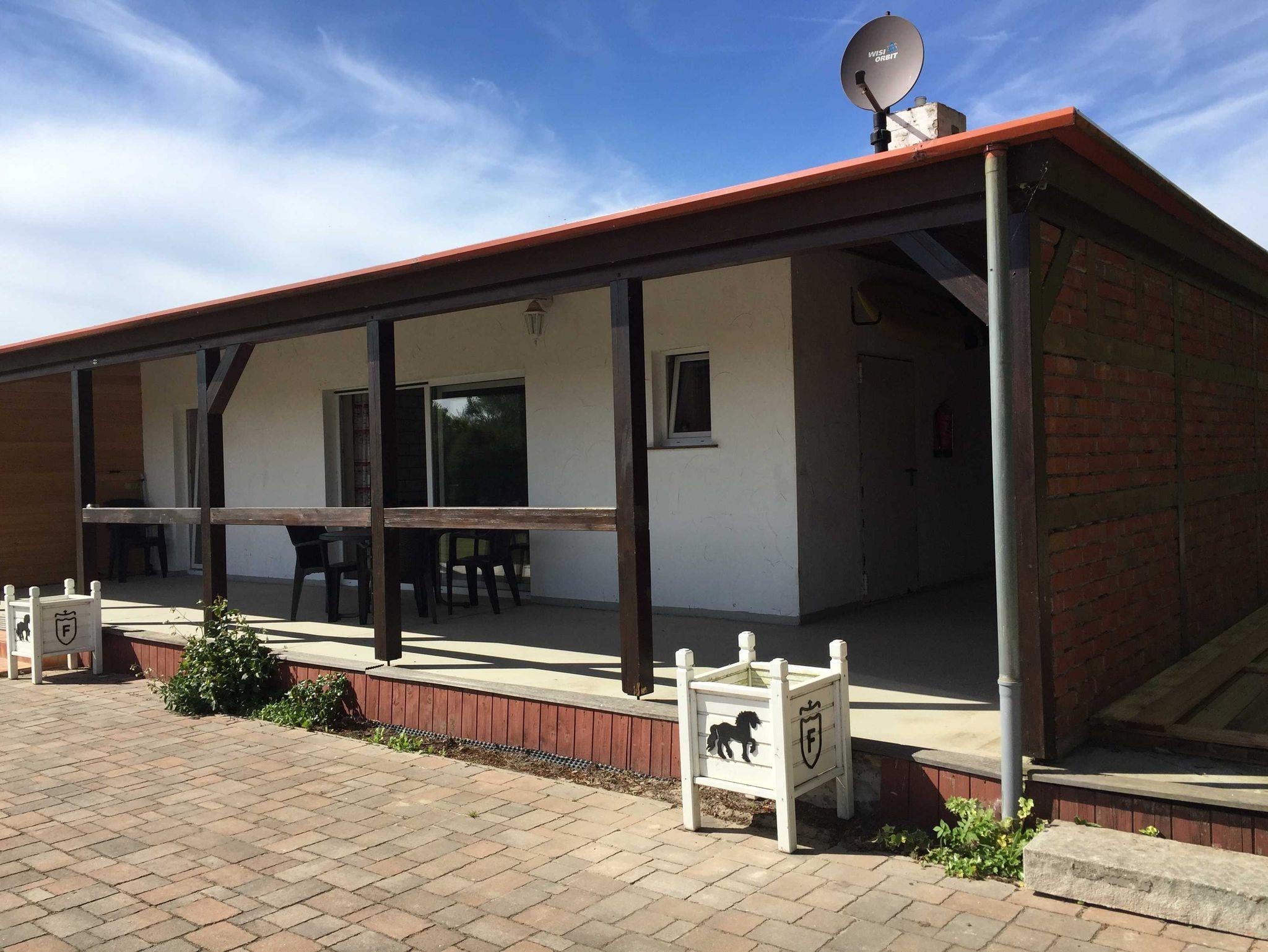 Gemütliche Ferienwohnung auf Windland Ranch mit Terrasse und Blick auf Pferdekoppel, umgeben von Natur und nahe Ostsee.