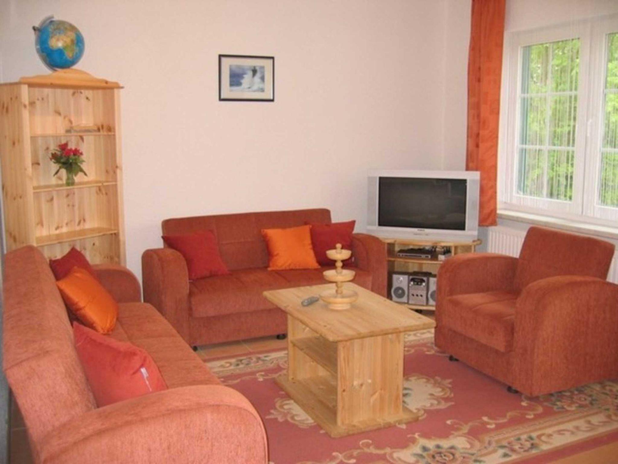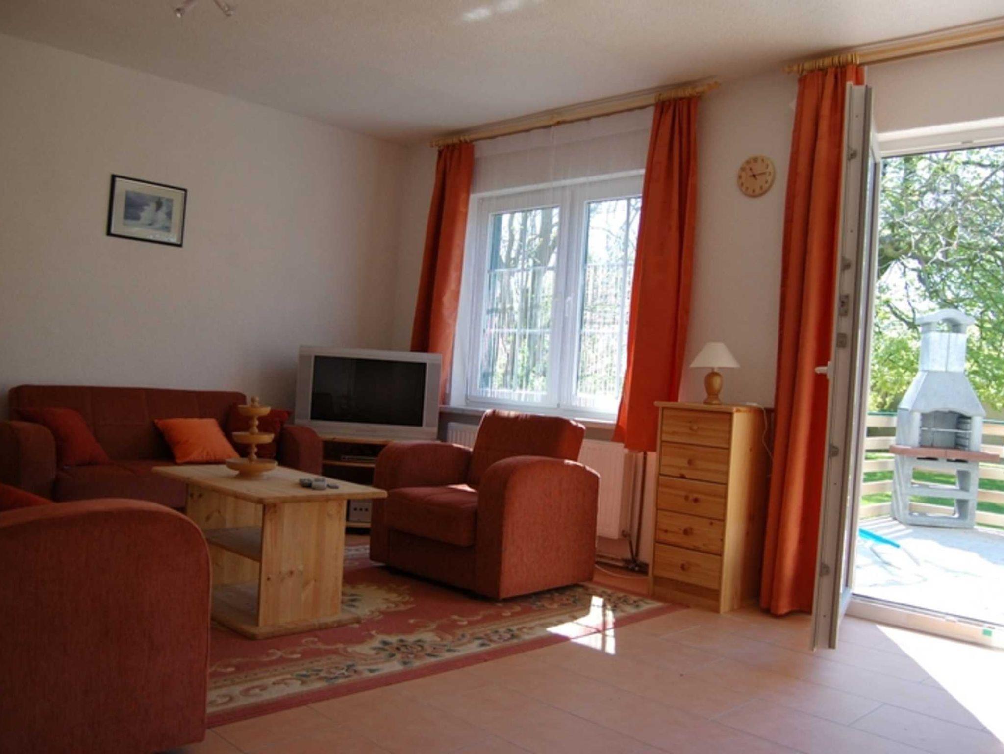 großes Wohnzimmer mit 3-Sitzer-Couch , 2-Sitzer,-Couch und einem Sessel, Aufbettung für 5. Person mit Luftbett möglich, SAT-TV, Radio, CD, große Fensterfront mit Ausgang zur Terrasse mit Gartenmöbeln, Sonnenliege, und Grill.