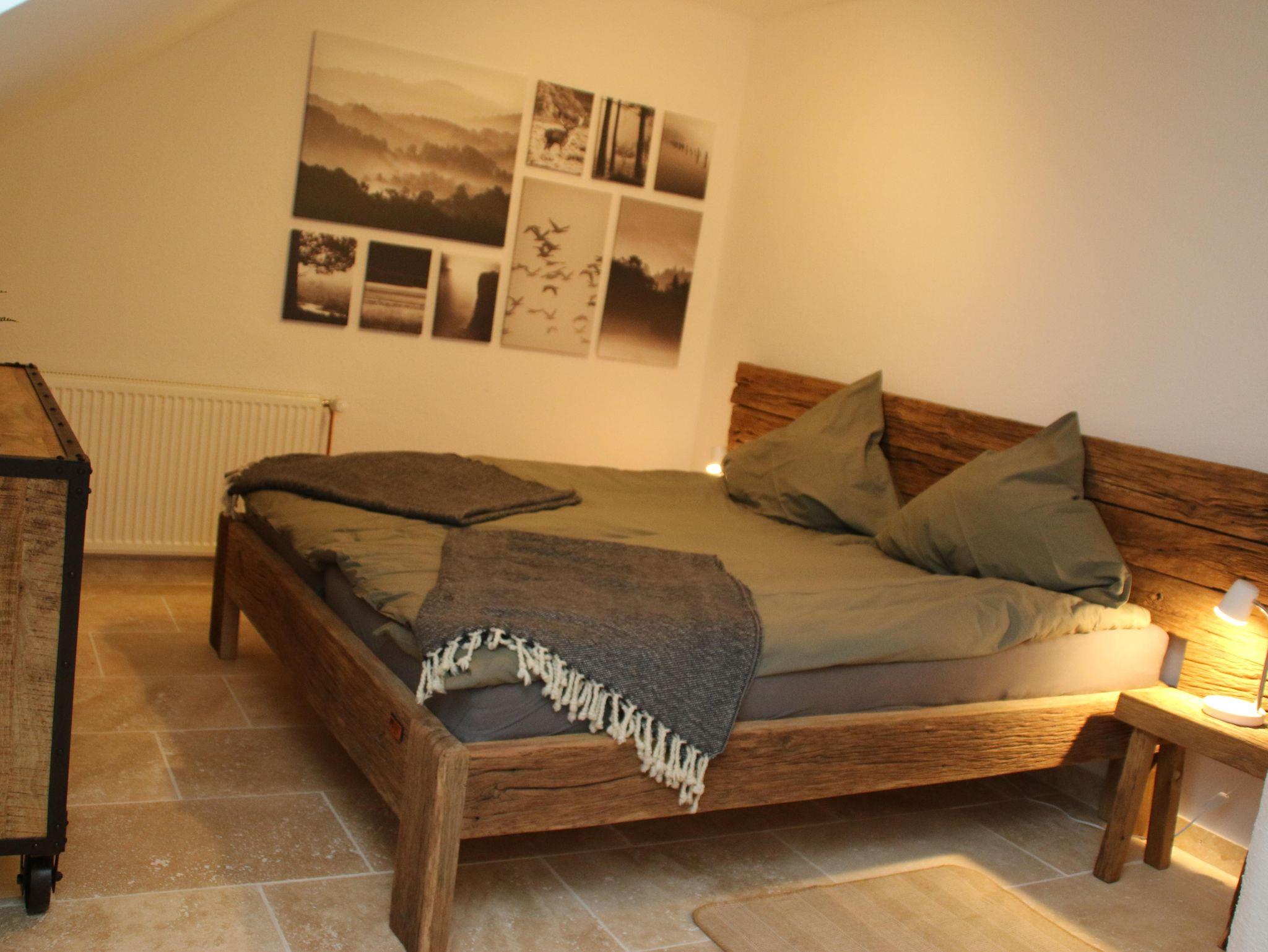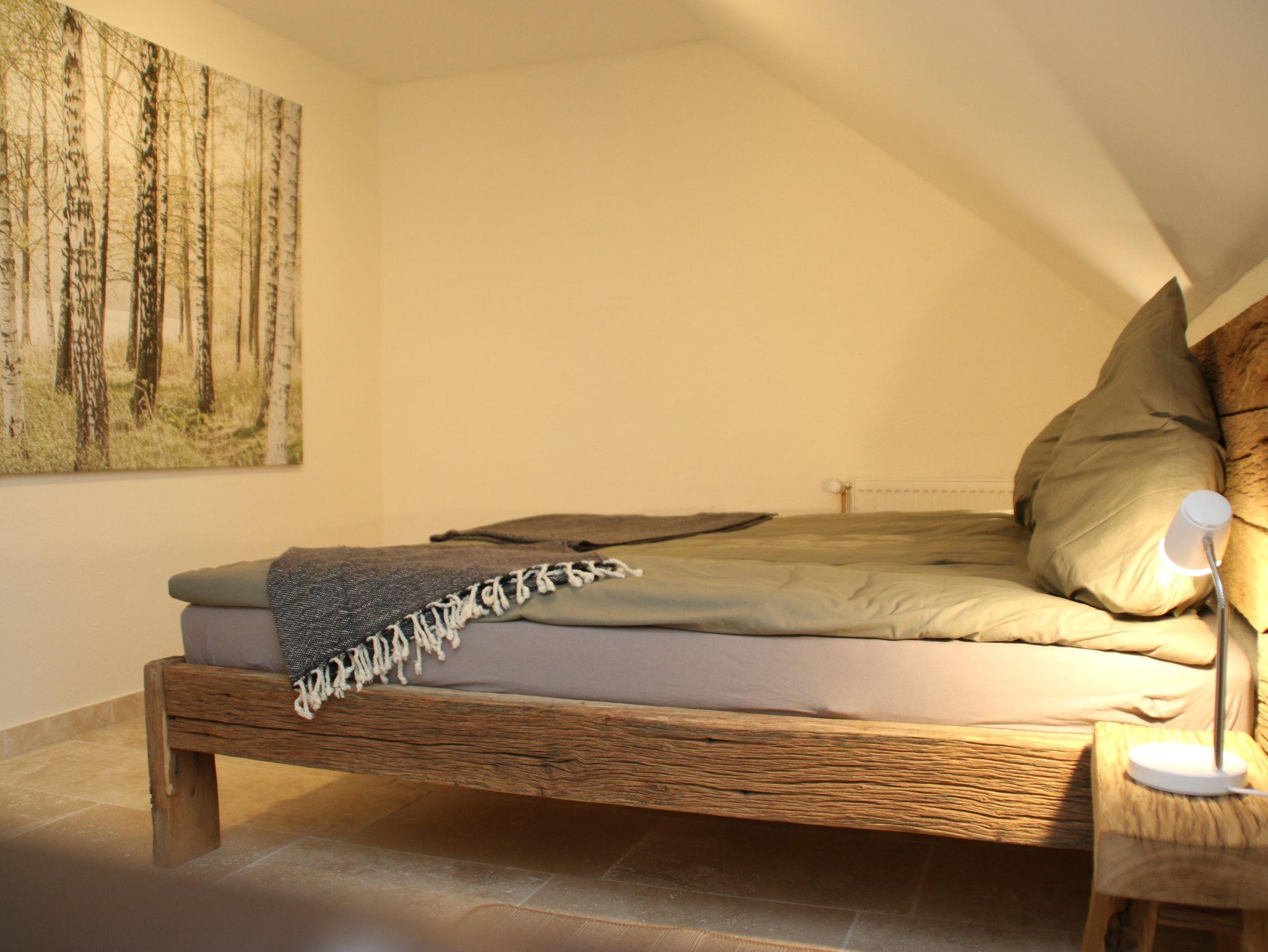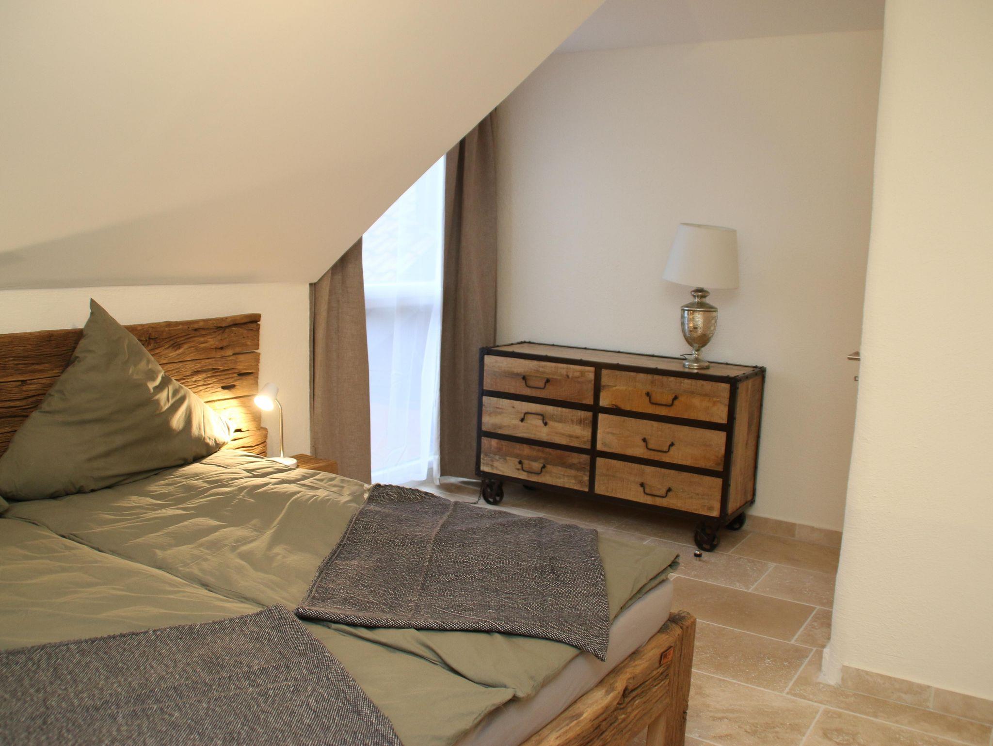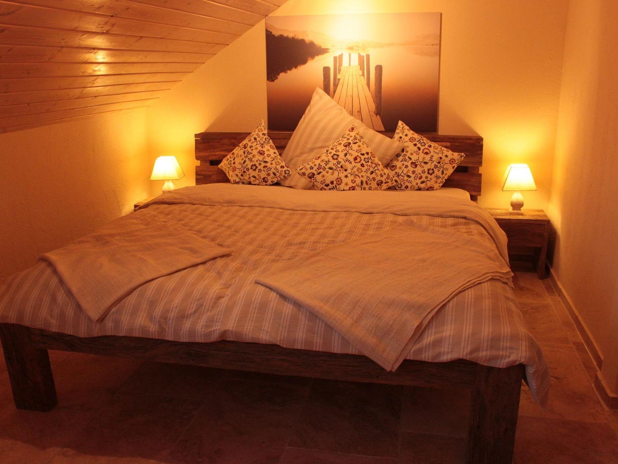 Die Böden der drei Schlafzimmer sind mit hellen Antikmarmor Fliesen aus Travertin belegt. Jeder der 3 Schlafzimmer ist mit einem 180 cm breiten Balkenbett aus urigem wiederverwertetem Holz ausgestattet. Das im „Altbau“ befindliche Schlafzimmer verfügt über ein doppelflügeliges Fenster, welches unmittelbar an den Balkon angrenzt, der jedoch nur für die Nutzung der Gäste des „Spatzennestes“ reserviert ist. Die beiden anderen Schlafzimmer sind jeweils mit einer Gaube mit großem, bodentiefen Fenster versehen.