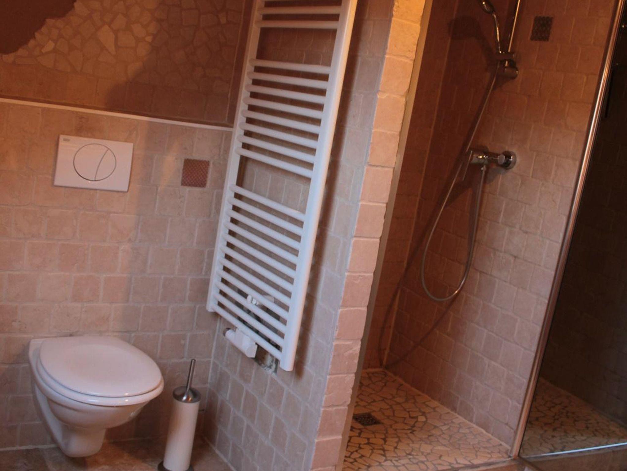 Auch das größere Badezimmer mit Dusche kann sich mit seiner Ausstattung durchaus sehen lassen: Hier sorgen ebenfalls getrommelter Antikmarmor, ein wunderschönes Waschbecken aus Naturstein sowie rustikale Schrankeinbauten für das nötige Ambiente. Vervollständigt wird dieses Bad durch eine Waschmaschine, so dass hier auch bei längeren Aufenthalten für saubere Wäsche gesorgt ist.