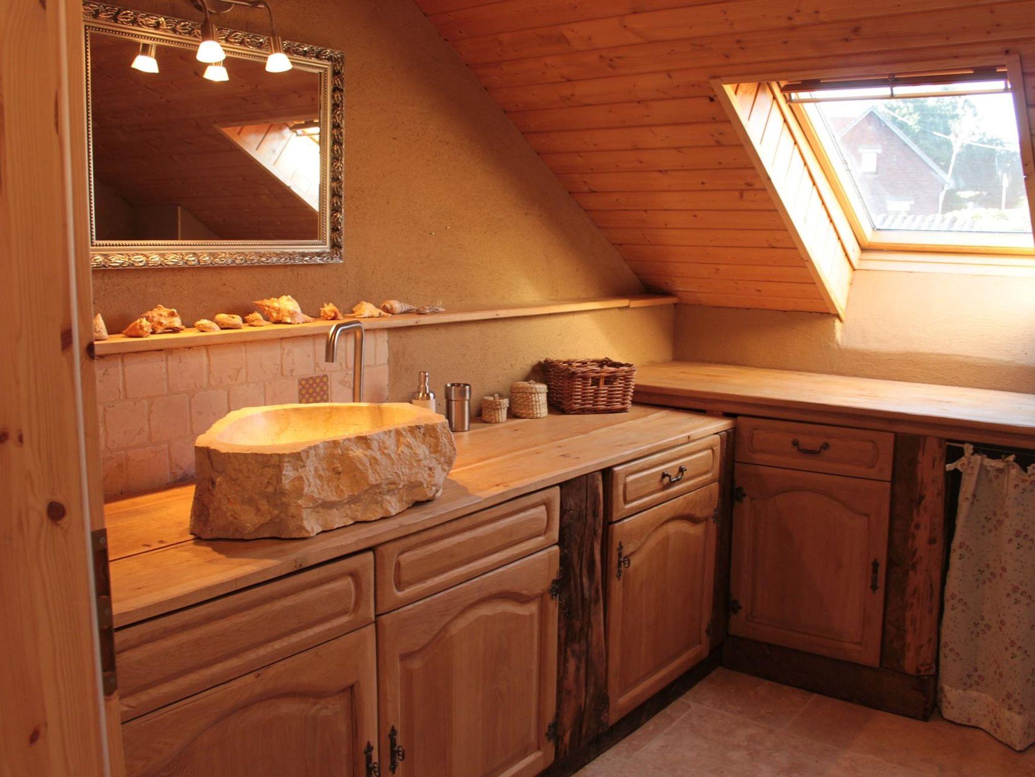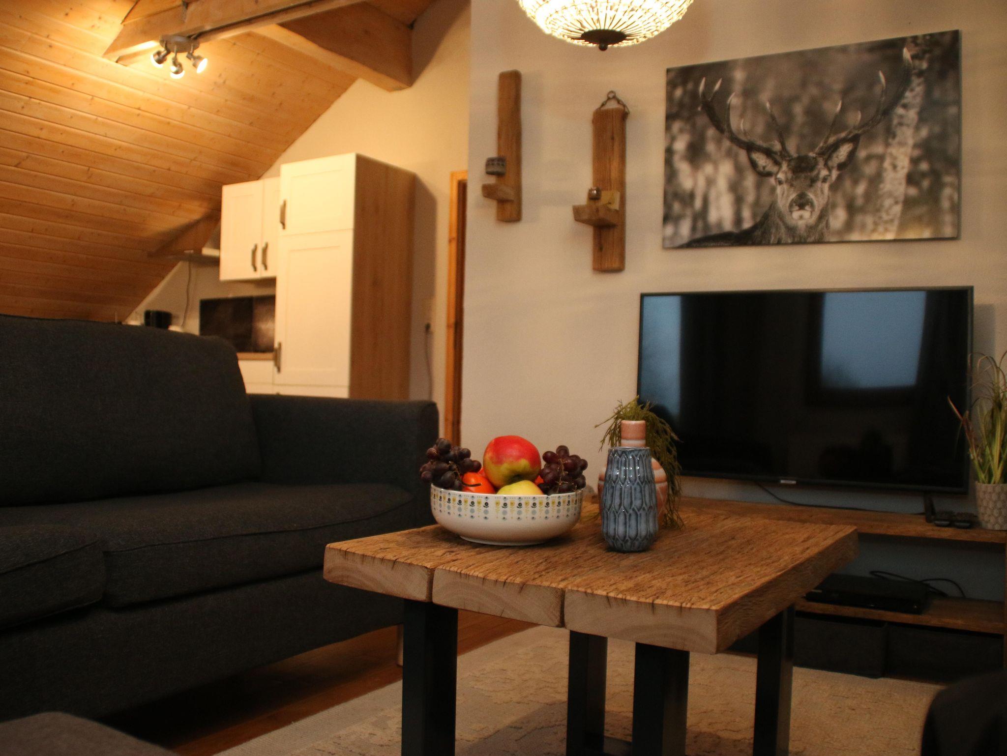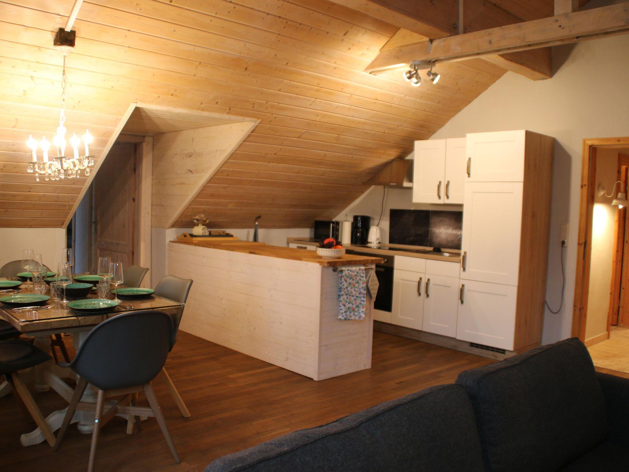 Viel Platz finden Sie in der Wohnküche, die insbesondere durch den bis in die First hin offenen Raum ein sehr großzügiges Wohnvergnügen bietet. Der Boden ist mit massivem Eichenschiffsbodenparkett versehen, die Einbauküche ist mit E Herd, Kühlschrank, Spülmaschine, Microwelle, Toaster, Kaffeemaschine und Wasserkocher ausgestattet. Ein Esstisch für 6 Personen sowie eine Wohnlandschaft mit Flat TV vervollständigen die Ausstattung der Wohnküche.