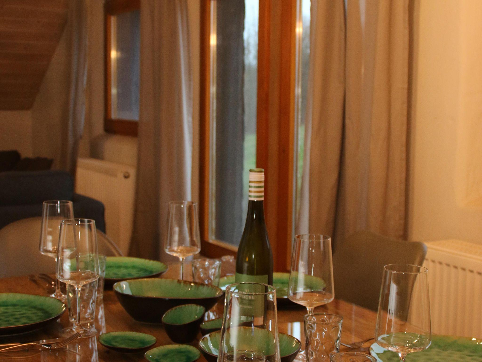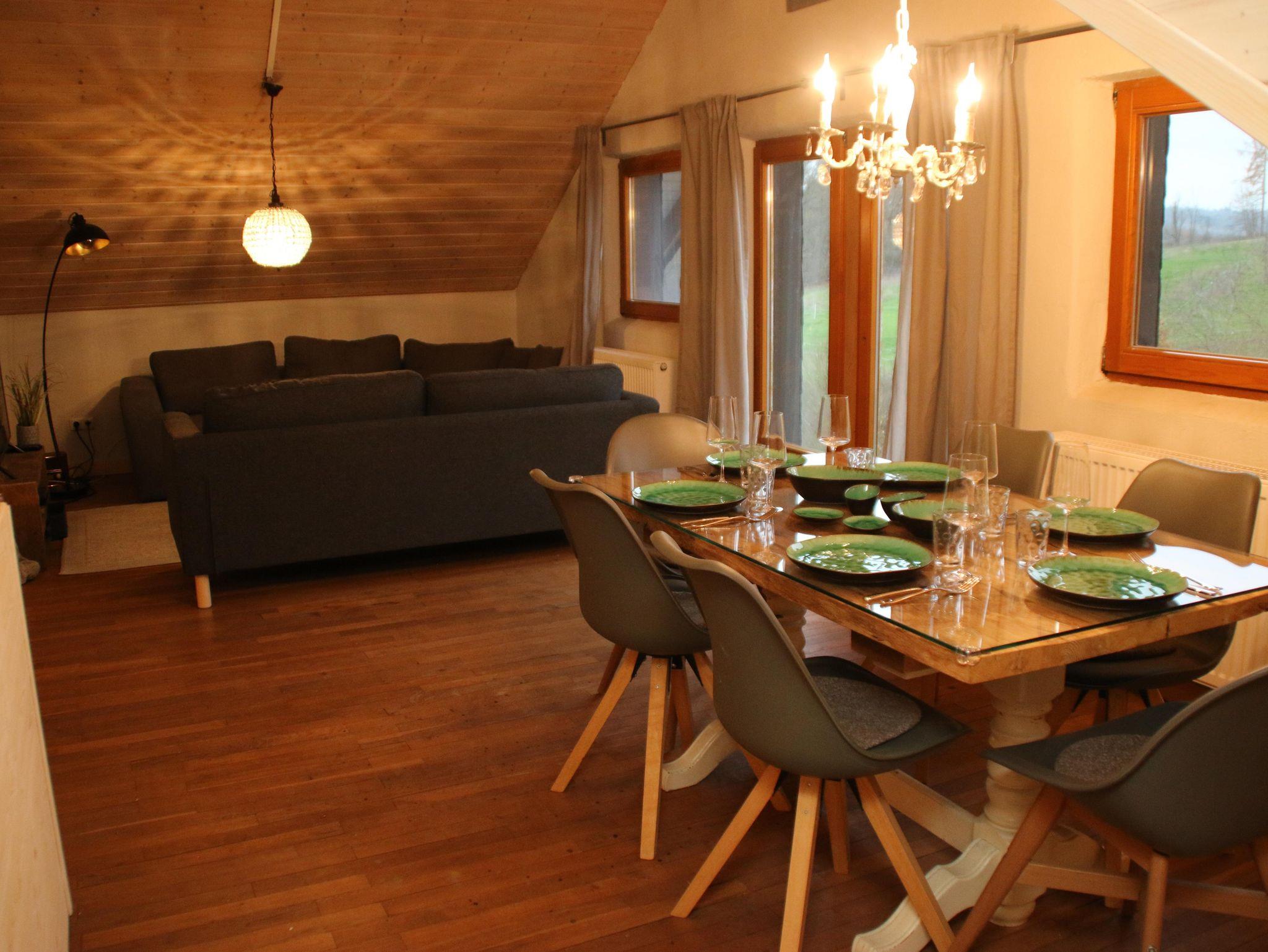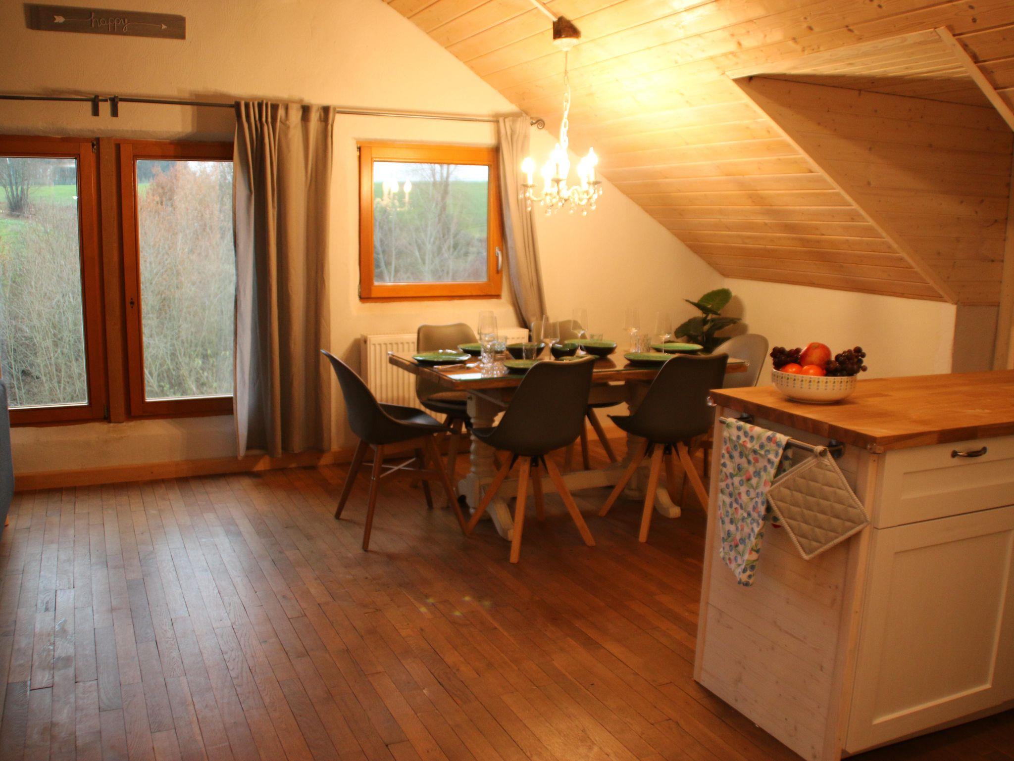 Viel Platz finden Sie in der Wohnküche, die insbesondere durch den bis in die First hin offenen Raum ein sehr großzügiges Wohnvergnügen bietet. Der Boden ist mit massivem Eichenschiffsbodenparkett versehen, die Einbauküche ist mit E Herd, Kühlschrank, Spülmaschine, Microwelle, Toaster, Kaffeemaschine und Wasserkocher ausgestattet. Ein Esstisch für 6 Personen sowie eine Wohnlandschaft mit Flat TV vervollständigen die Ausstattung der Wohnküche.