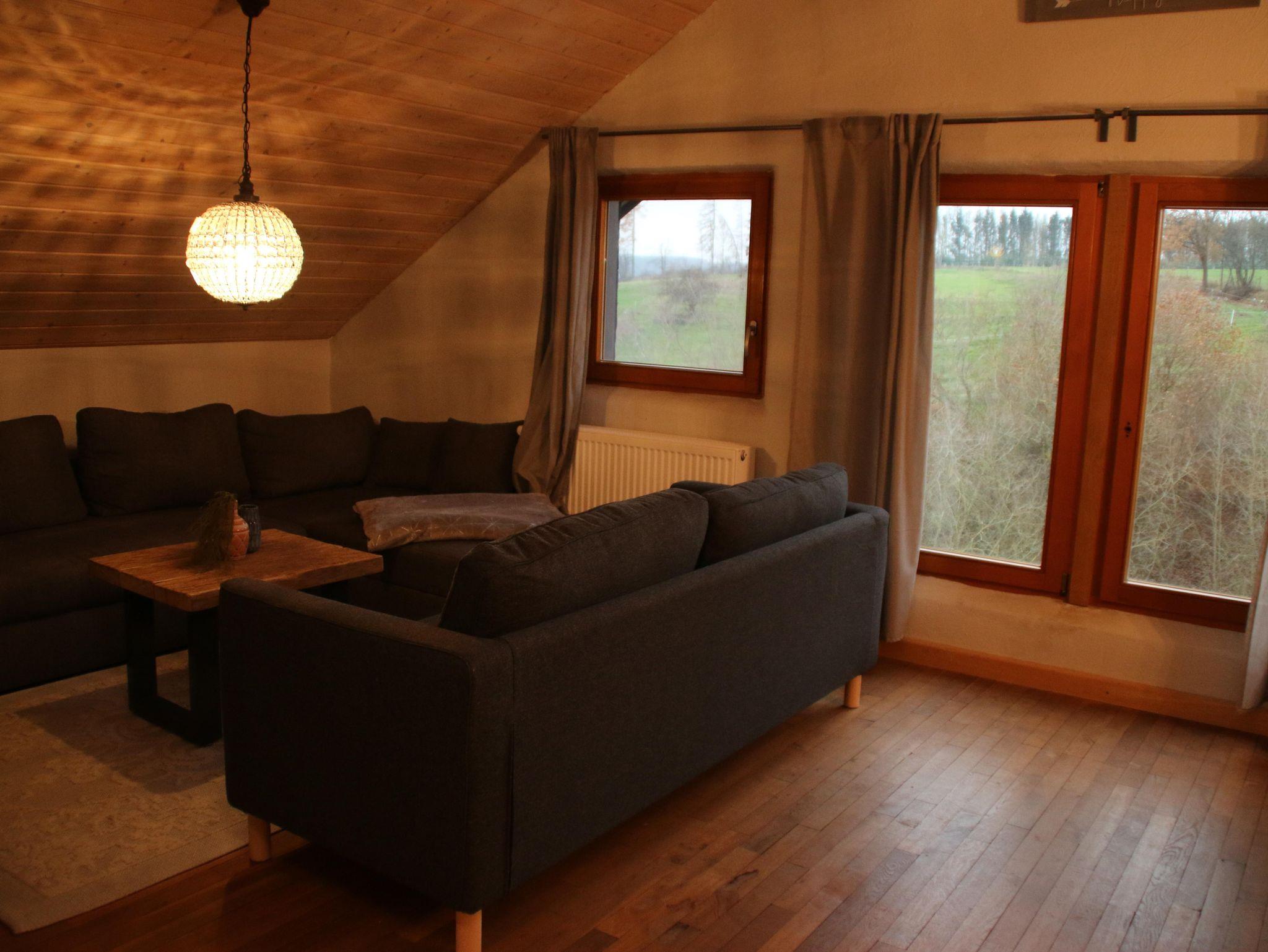 In der nach Westen ausgerichteten Giebelseite bieten 4 Fenster einen schönen Blick auf die angrenzenden Felder sowie unseren Offenstall und das Paddock für die Pferde.