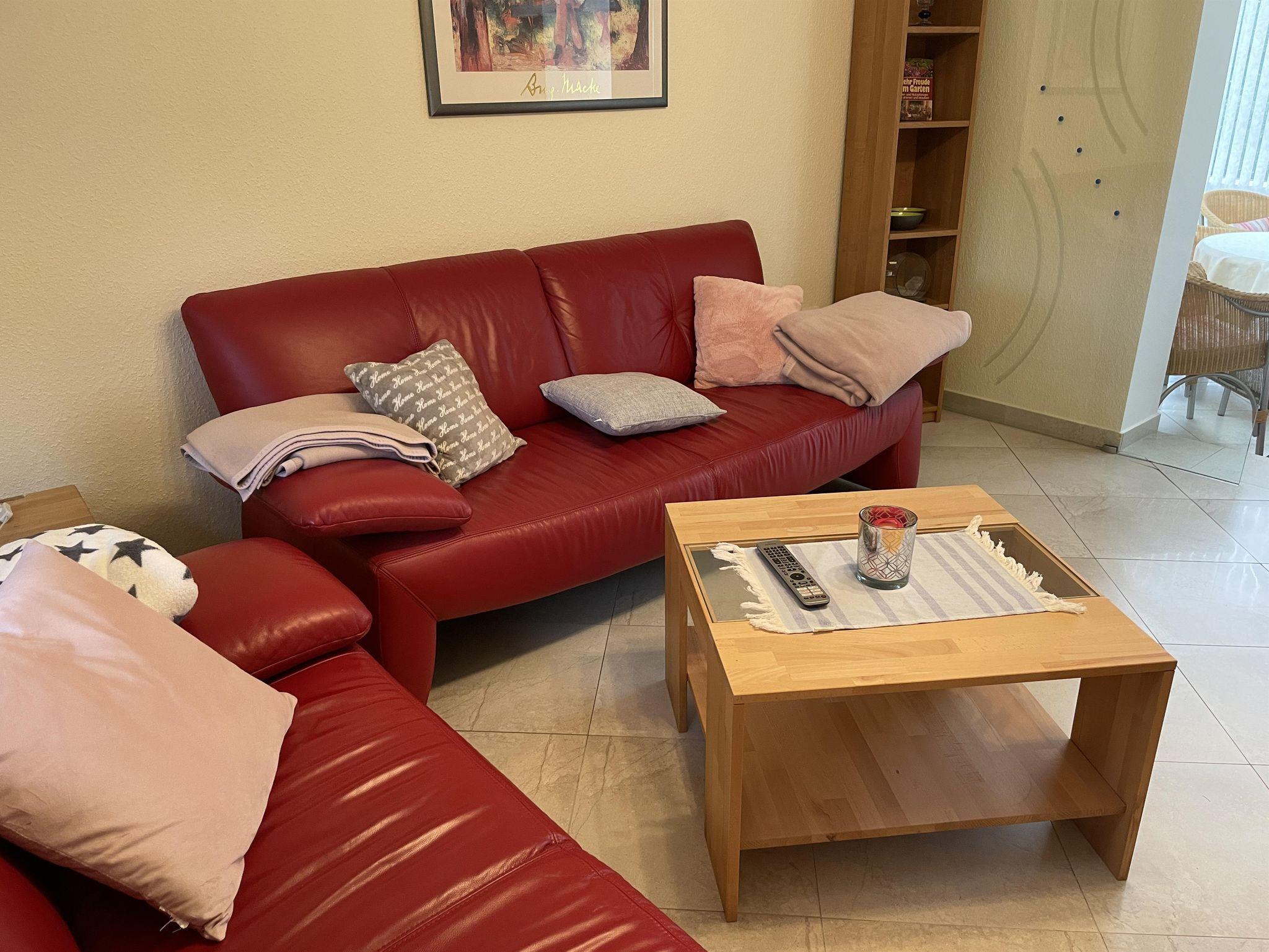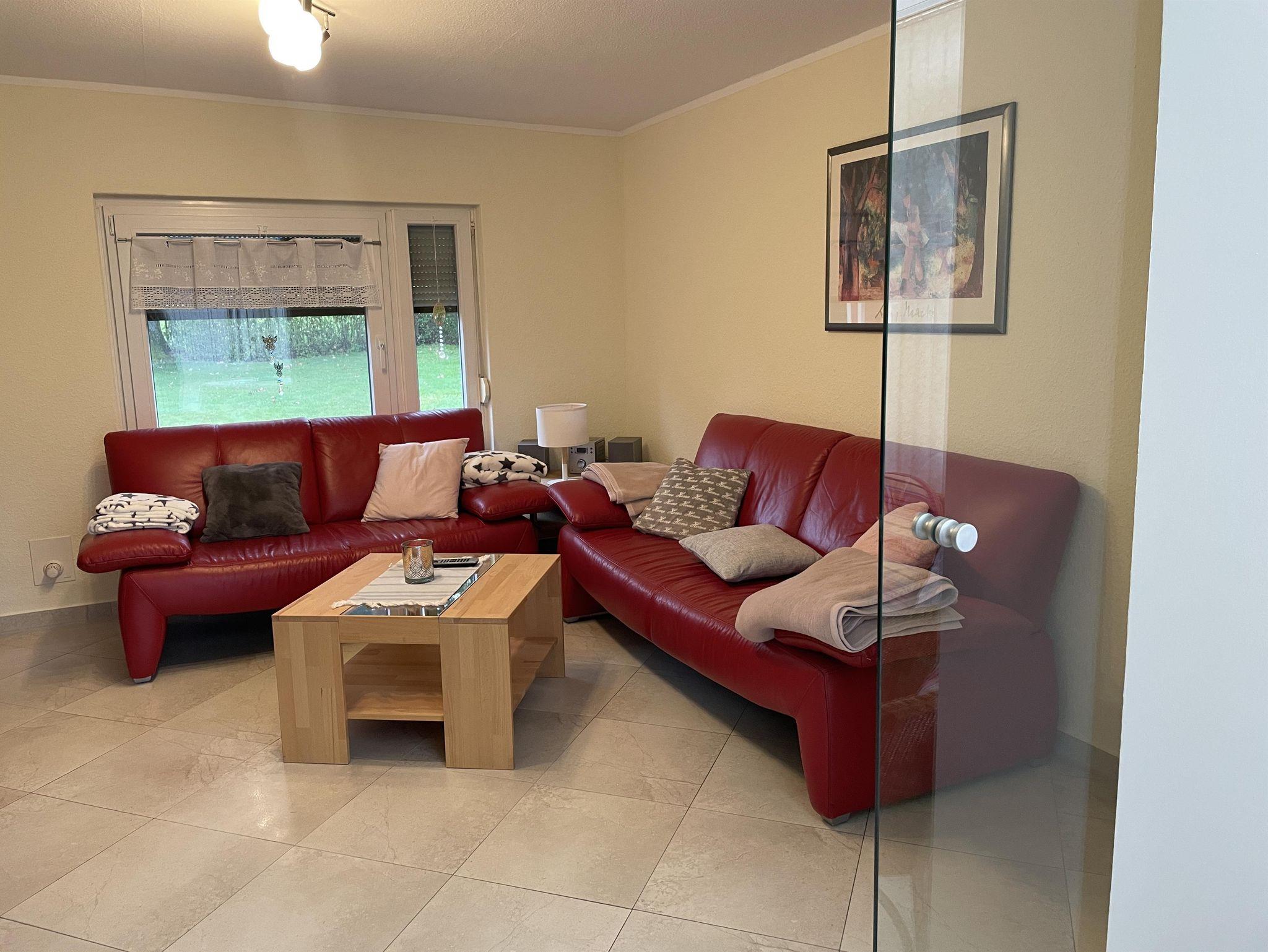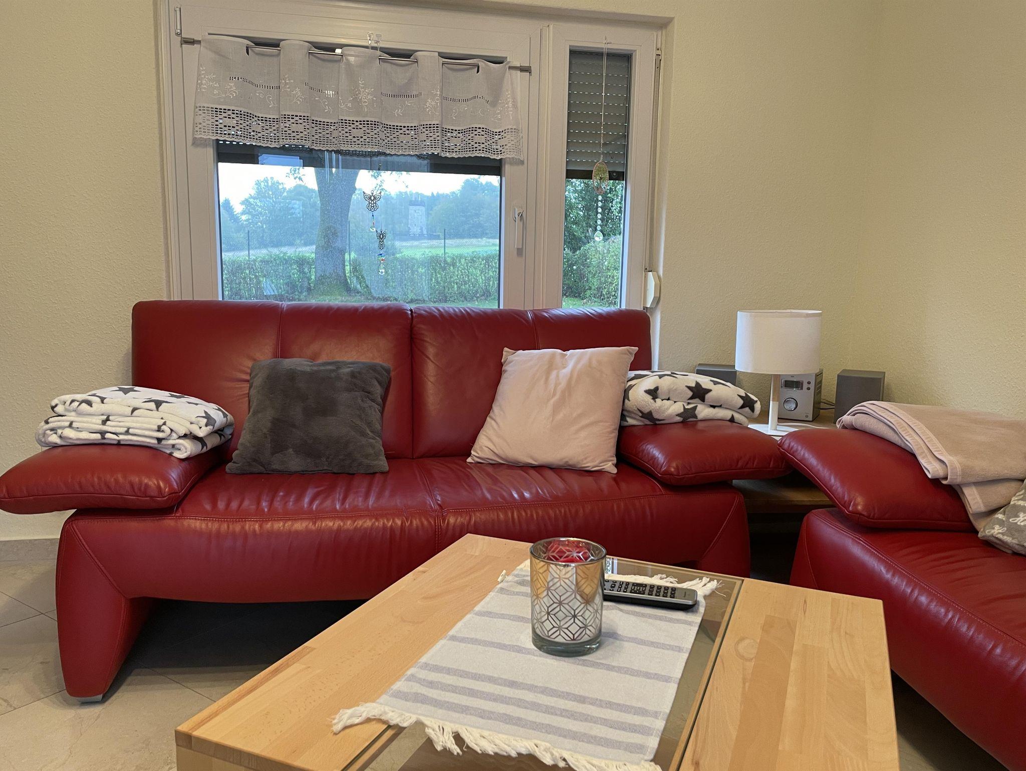 Das Wohnzimmer hinter dem Wintergarten ist mit einer einladenden roten Ledercouch ausgestattet und bietet den idealen Ort für Fernsehabende oder Spieleabende mit der Familie. Von hier aus genießen Sie einen wunderschönen Blick auf den Garten, den Grillplatz und den majestätischen Bismarckturm. Jedes Detail in unserem Ferienhaus wurde mit Liebe gestaltet, um eine perfekte Wohlfühlatmosphäre zu schaffen.