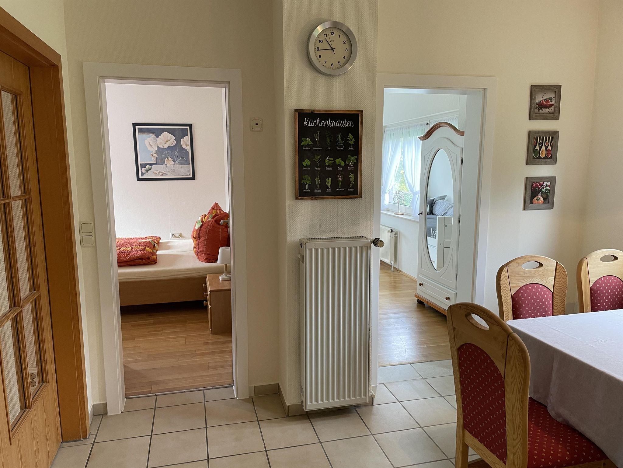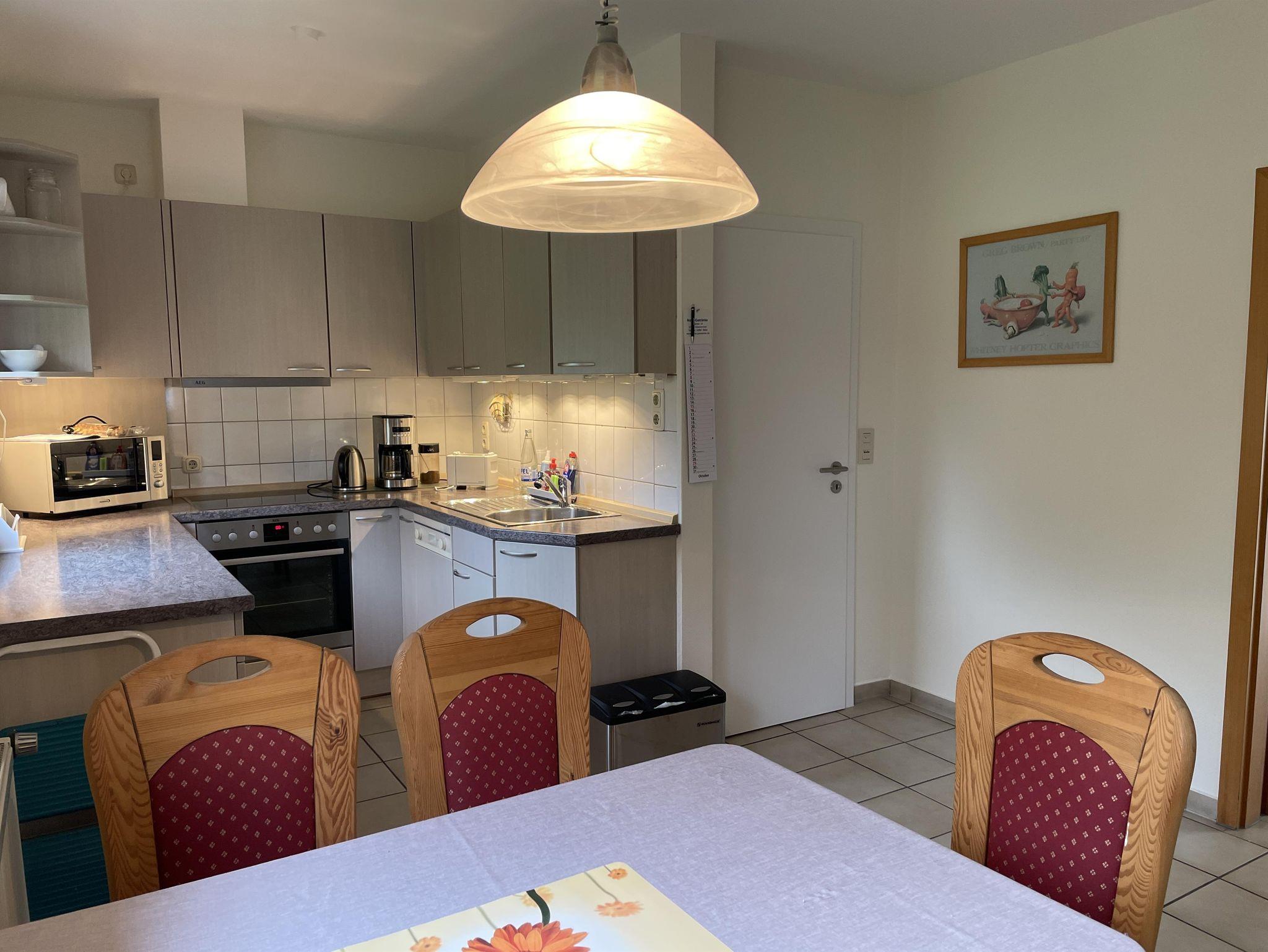 Die Wohnküche ist über den Flur erreichbar und bietet ausreichend Platz für gemeinsame Mahlzeiten. Sie ist voll ausgestattet und groß genug, um Mahlzeiten für die ganze Familie zuzubereiten. Falls benötigt, stellen wir Ihnen gerne einen Kinderstuhl zur Verfügung. Um Ihnen den Aufenthalt so angenehm wie möglich zu gestalten, bieten wir Ihnen auch einen Kühlschrank-Service an, sodass Sie bei Ihrer Ankunft bereits die wichtigsten Dinge vorfinden.